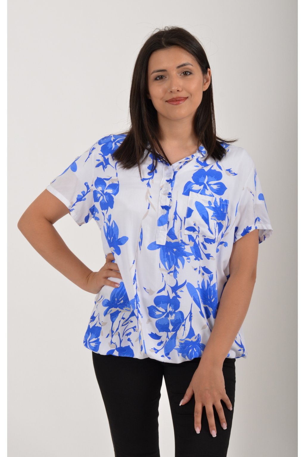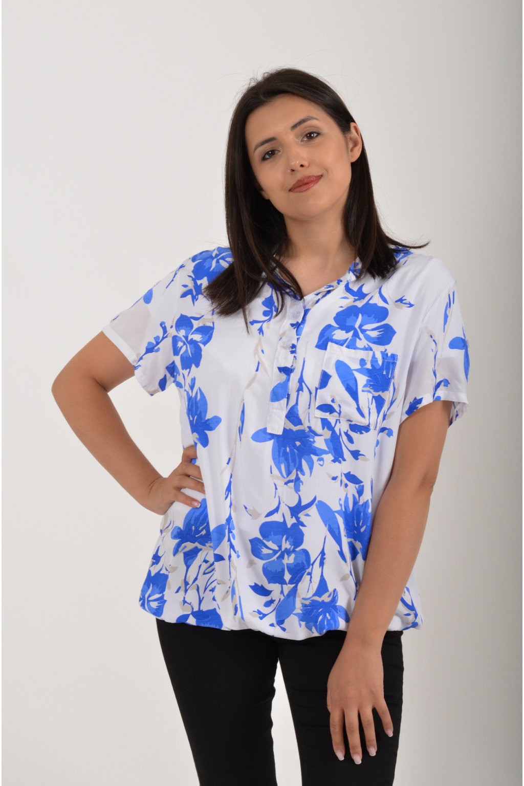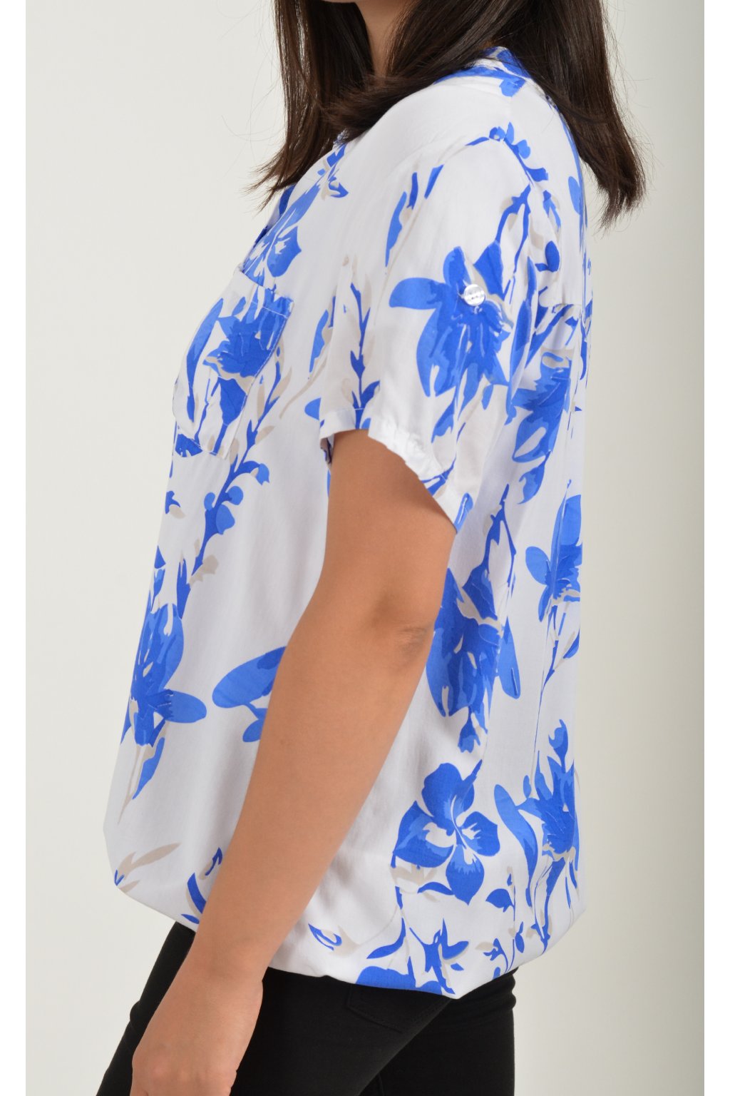 Vzorovaná halenka s krátkým rukávem a náprsní kapsou. Halenka má výstřih do V na 3 knoflíky. Je vyrobena z velice příjemného a vzdušného materiálu. Spodní část halenky je do gumy, lze tedy jednoduše podkasat.