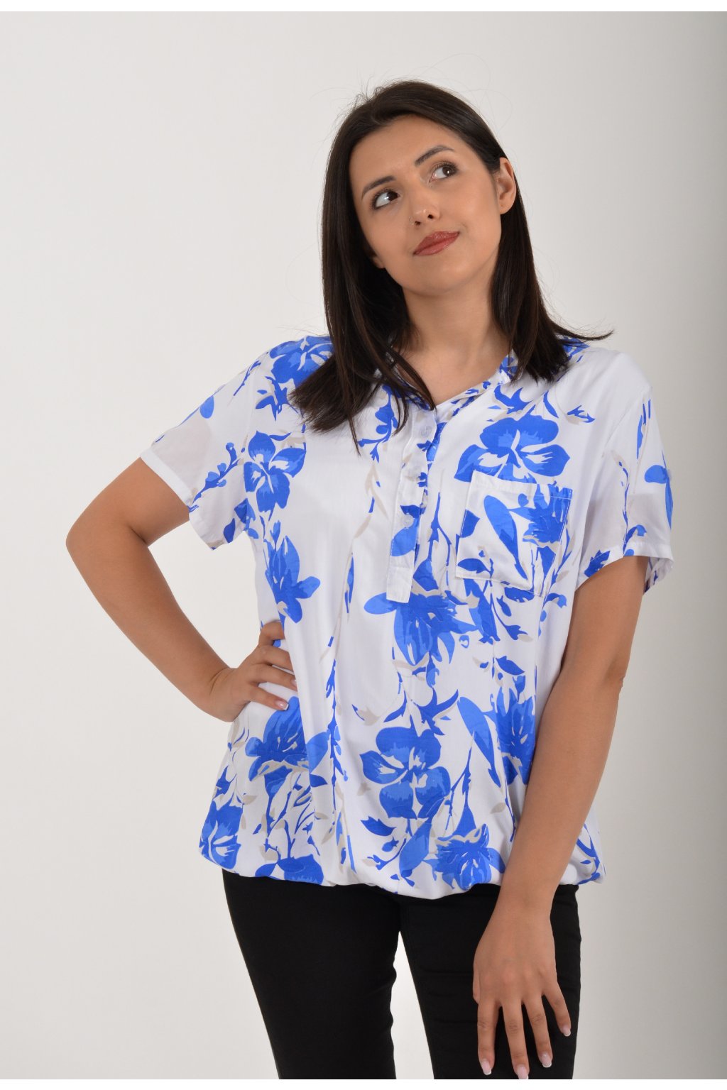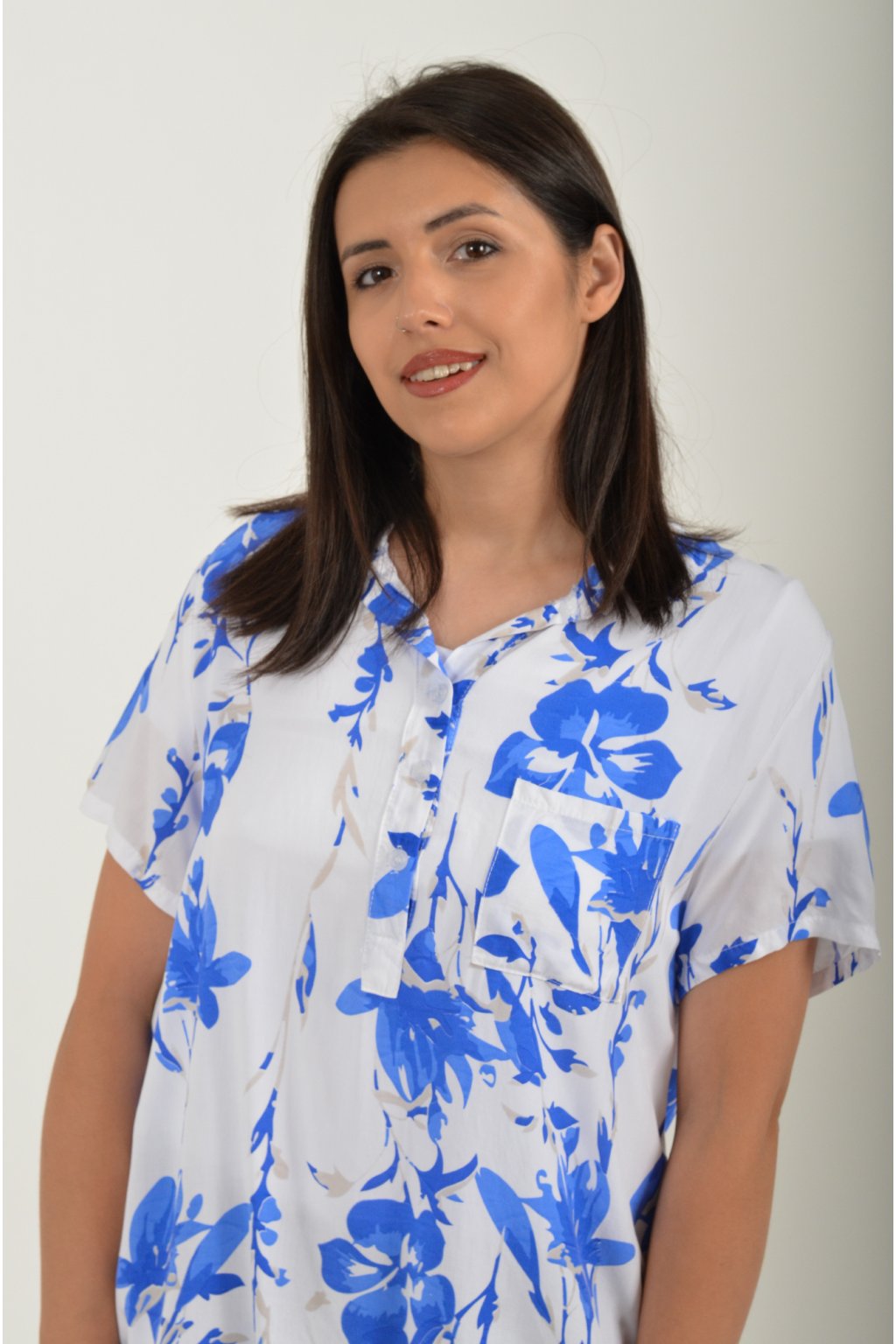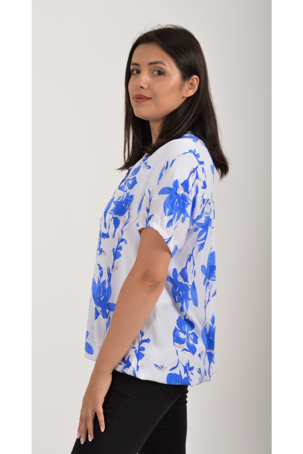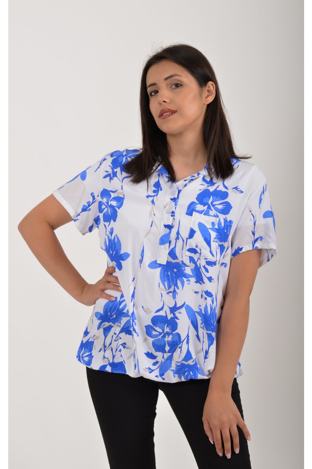Vzorovaná halenka s krátkým rukávem a náprsní kapsou. Halenka má výstřih do V na 3 knoflíky. Je vyrobena z velice příjemného a vzdušného materiálu. Spodní část halenky je do gumy, lze tedy jednoduše podkasat.