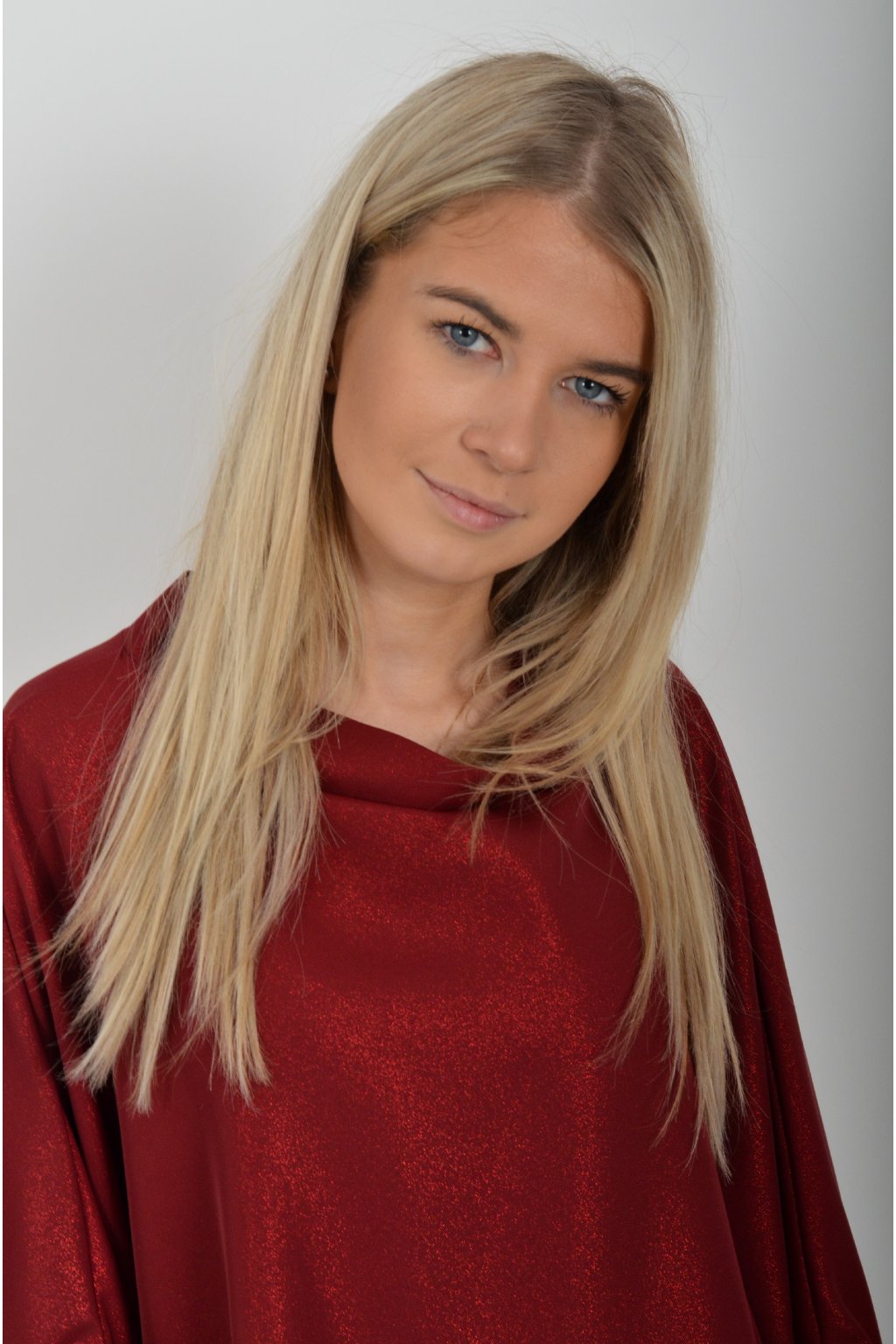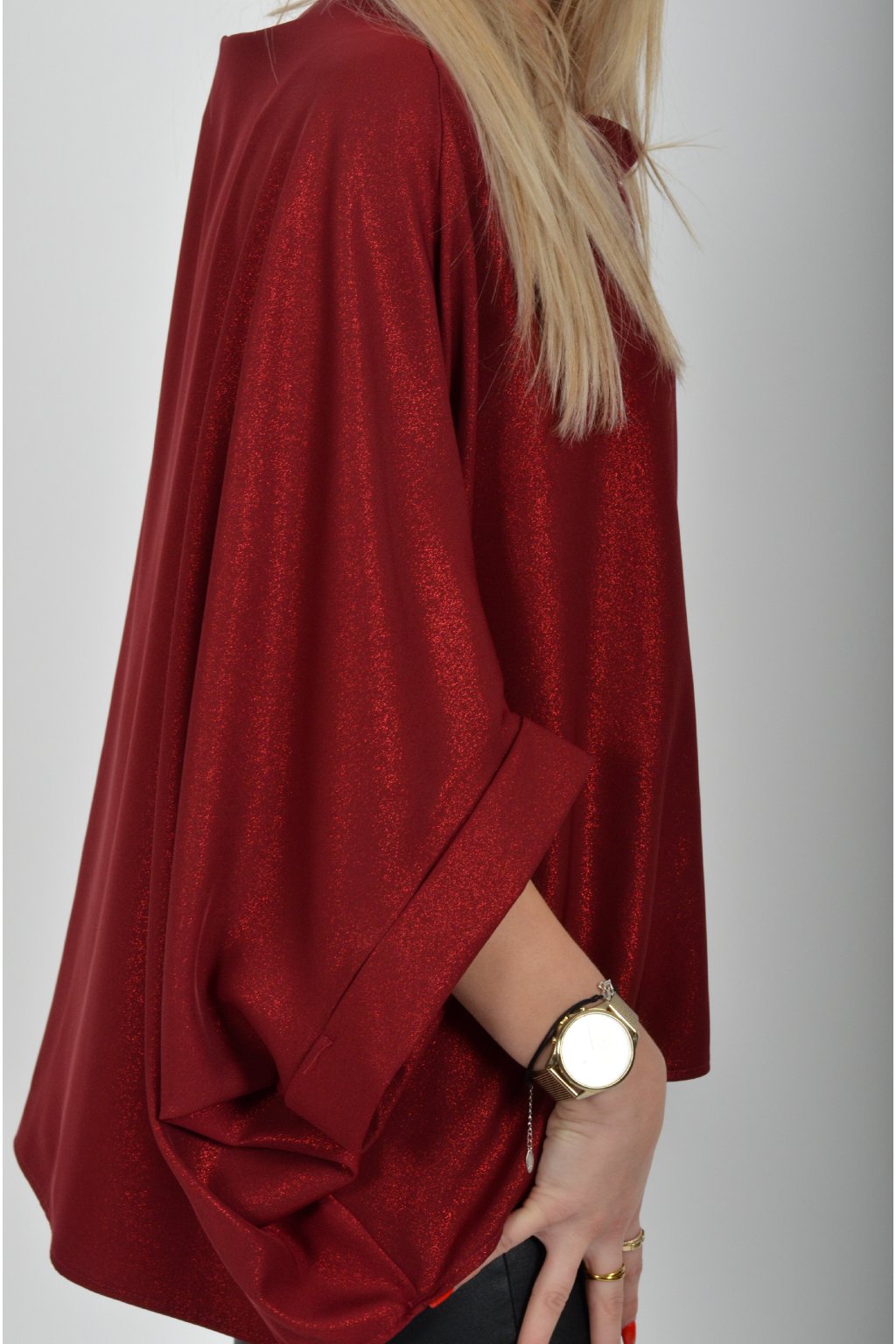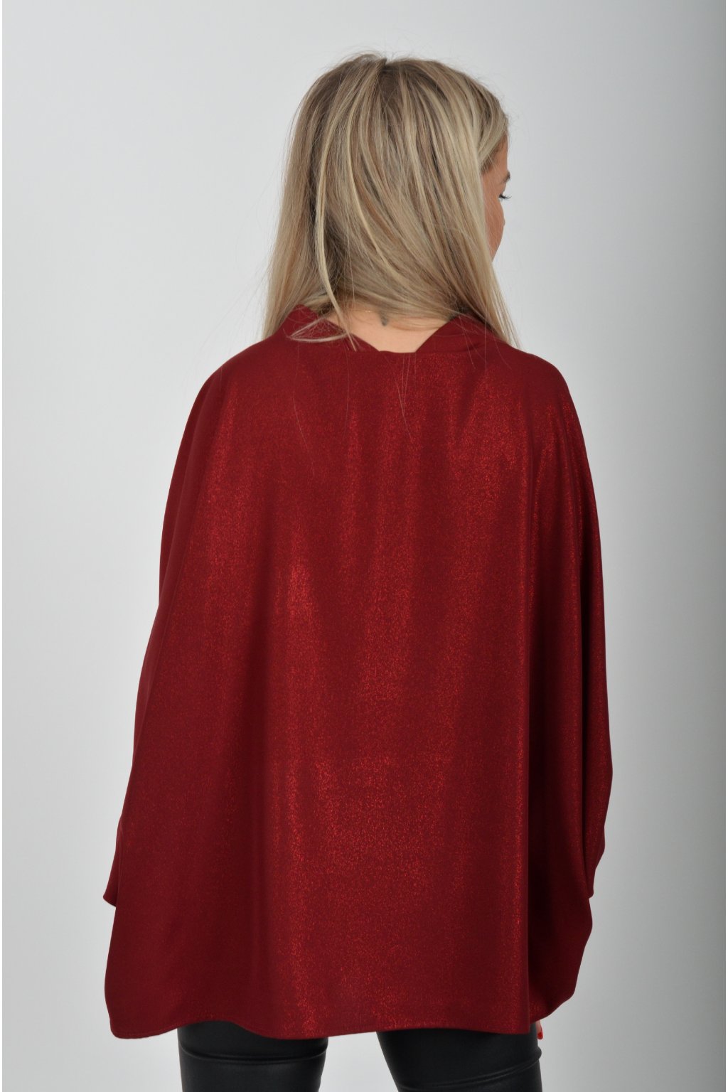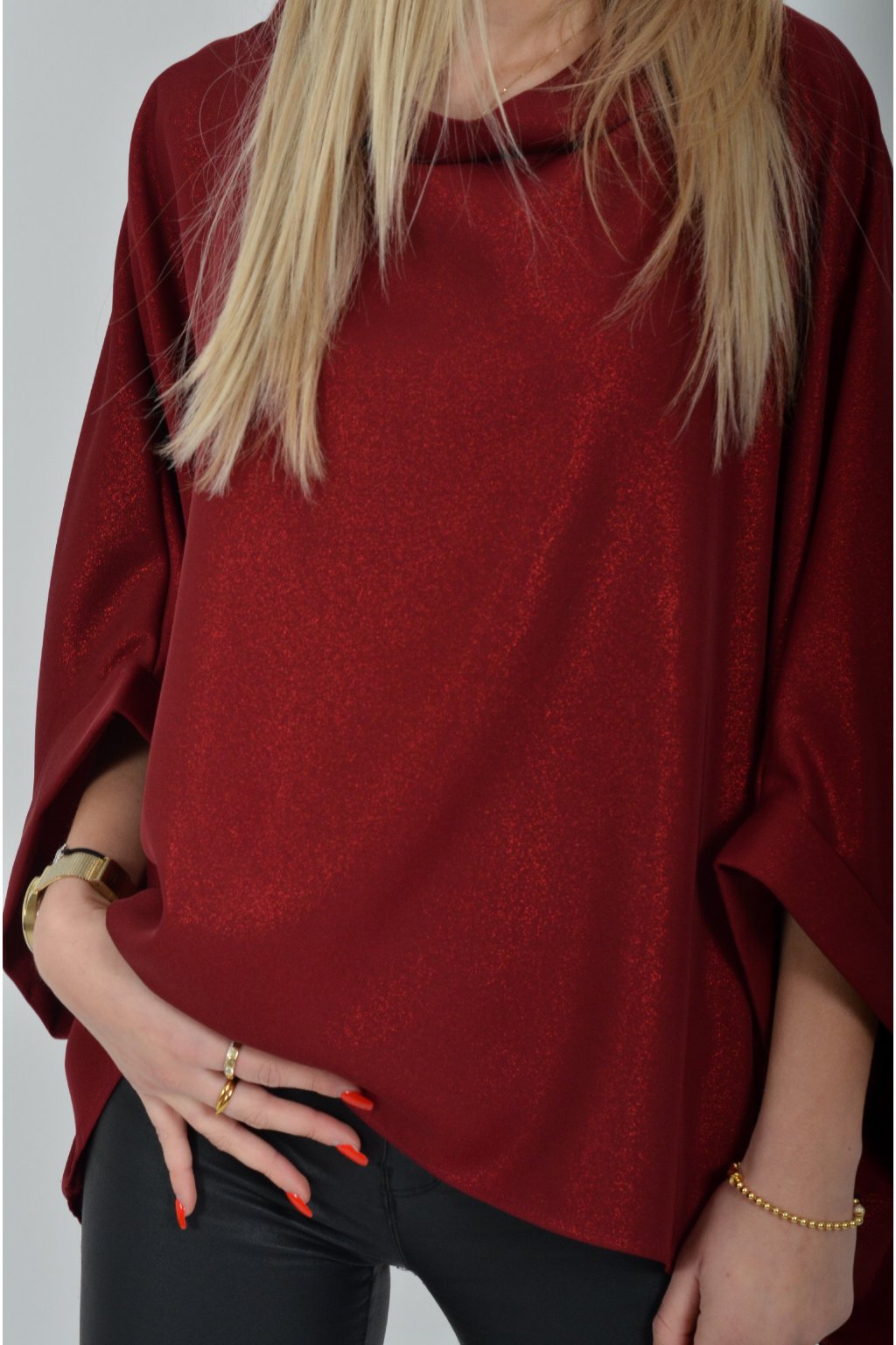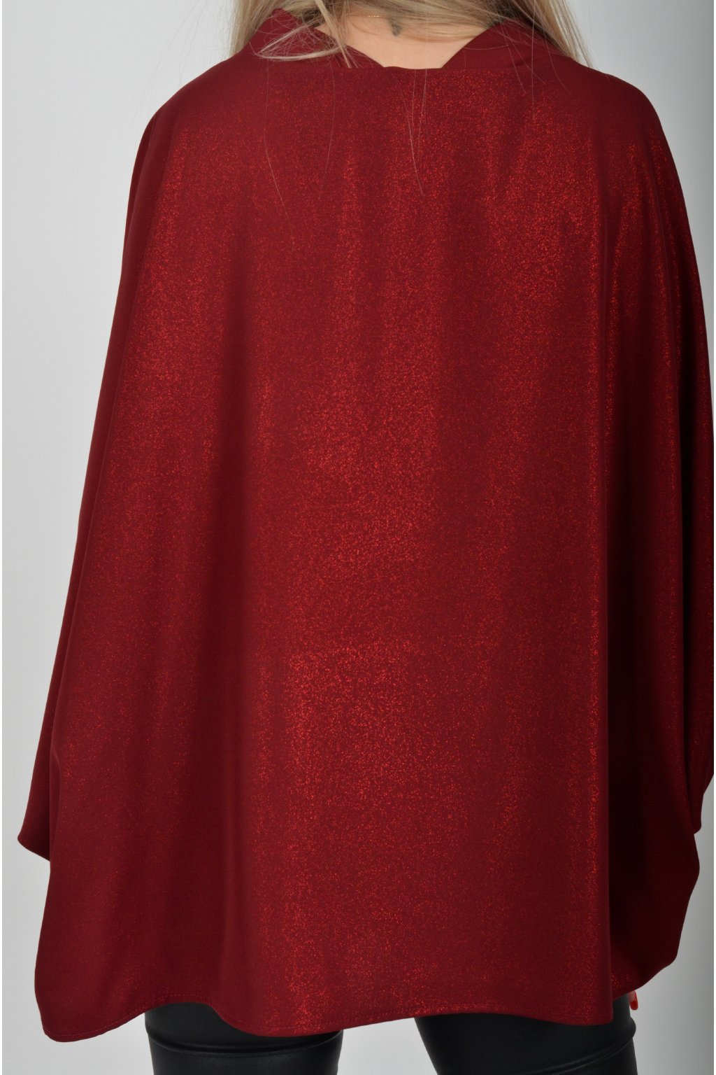 Halenka značky Miss City Official s netopýřím rukávem vhodná jak pro společenské události, tak i volnočasové nošení. Je vyrobena z velice příjemného a pevného materiálu. Materiál má lehce lesklý efekt podobný lurexu. Přední část halenky je kratší než zadní. Halenka je volnějšího nadčasového střihu.