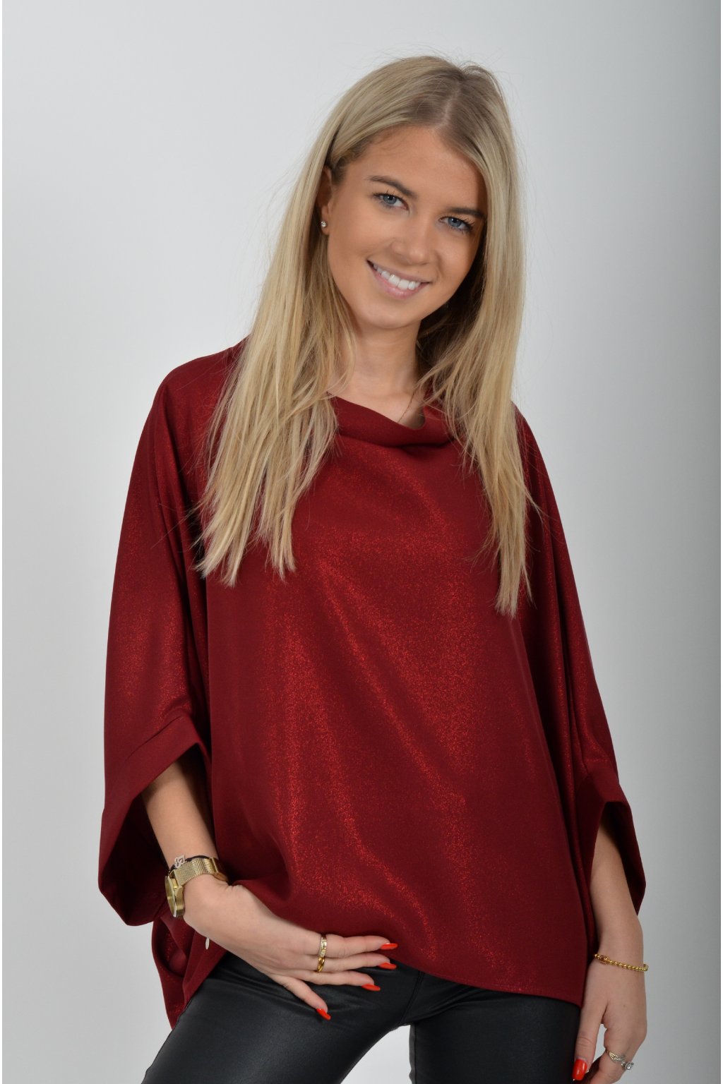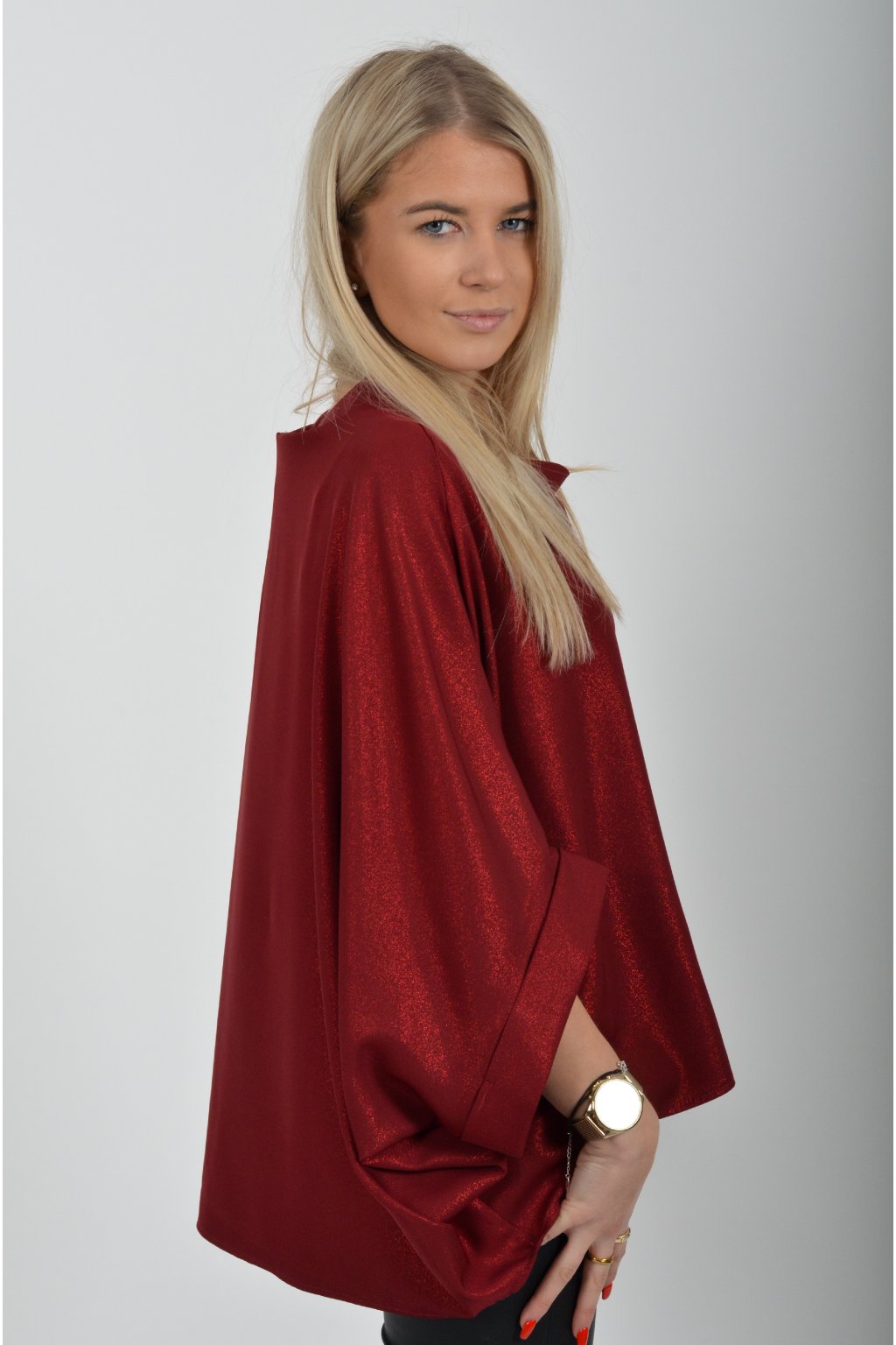 Halenka značky Miss City Official s netopýřím rukávem vhodná jak pro společenské události, tak i volnočasové nošení. Je vyrobena z velice příjemného a pevného materiálu. Materiál má lehce lesklý efekt podobný lurexu. Přední část halenky je kratší než zadní. Halenka je volnějšího nadčasového střihu.