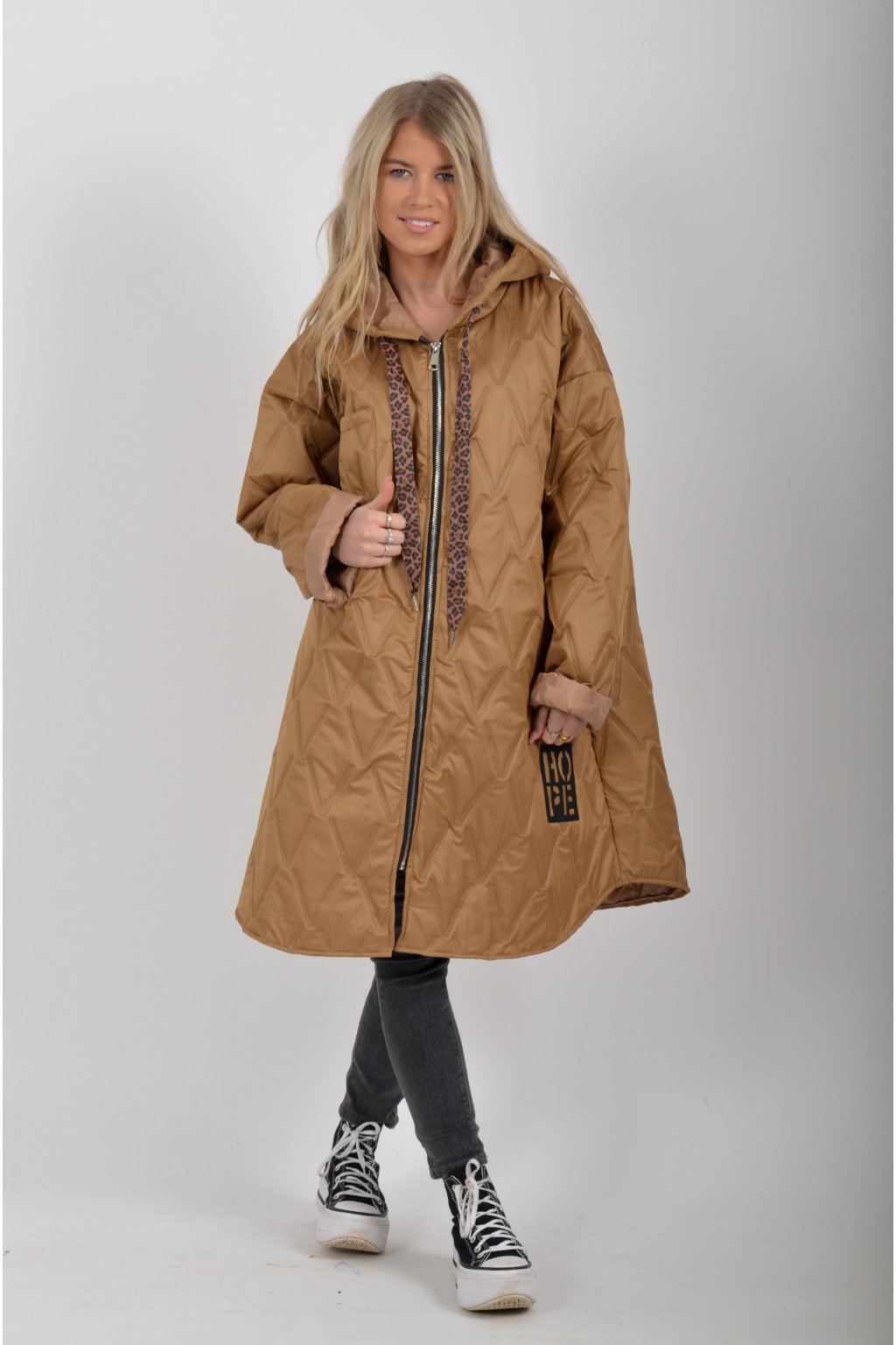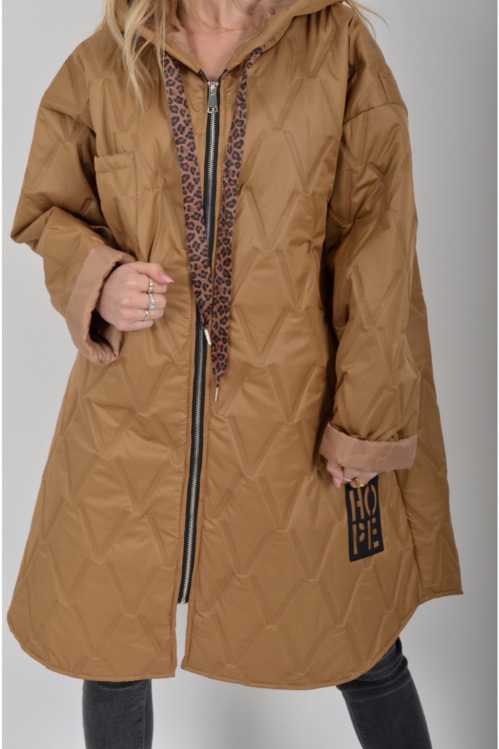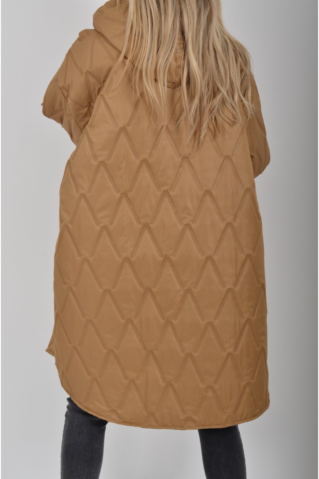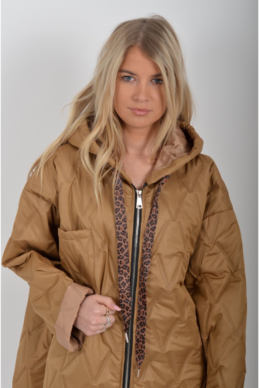 Přechodová oversize bunda s kapuci, jednou náprsní kapsou a dvěma na bocích. Je volnějšího stylu, u krku má šňurky na stažení. Bunda je vyrobena z odlehčeného materiálu, tedy je vhodná pro jarní nošení.