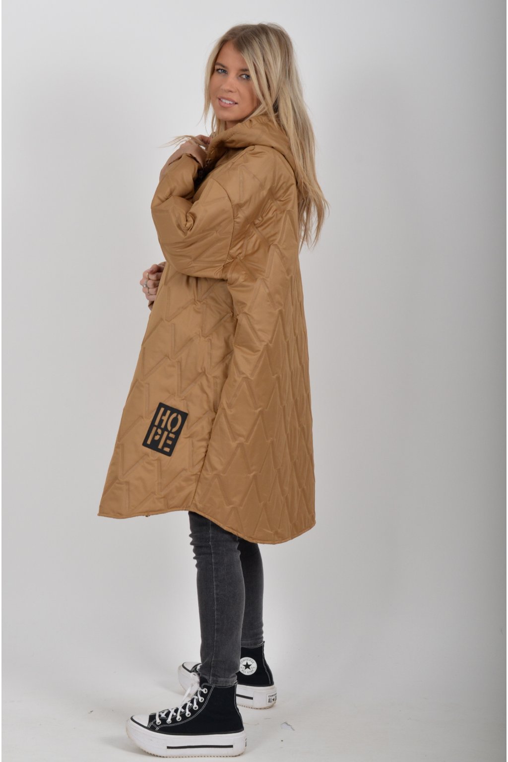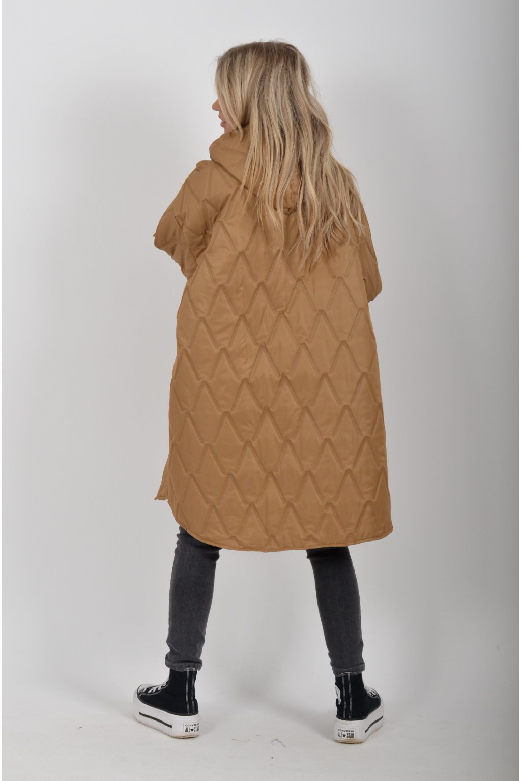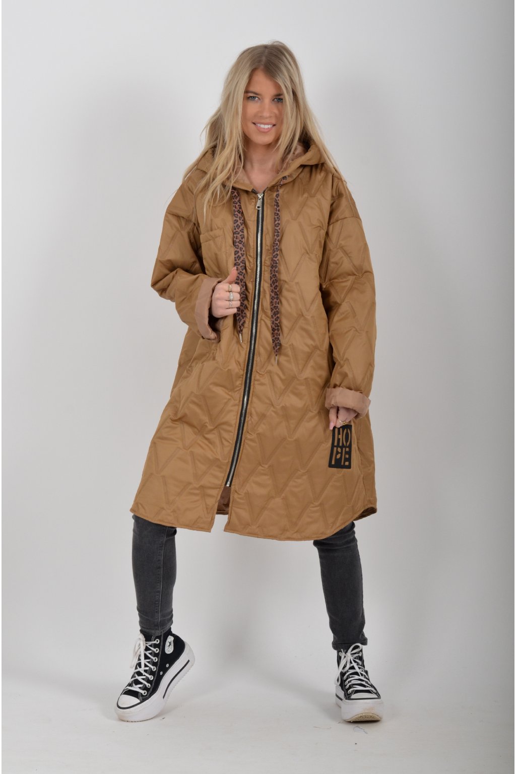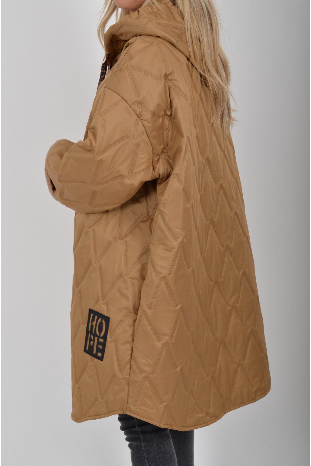 Přechodová oversize bunda s kapuci, jednou náprsní kapsou a dvěma na bocích. Je volnějšího stylu, u krku má šňurky na stažení. Bunda je vyrobena z odlehčeného materiálu, tedy je vhodná pro jarní nošení.