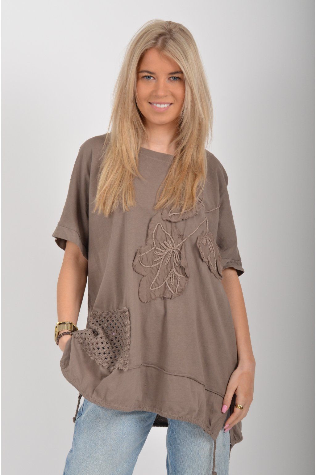 Oversize halenka s krátkým rukávem a vyšívaným vzorem vyrobená z velice příjemné bavlny. Materiál halenky je pružný. Ve spodní části na bocích má rozparky, a po celém spodním švu je zapracovaná tkanice pro libovolné stažení.