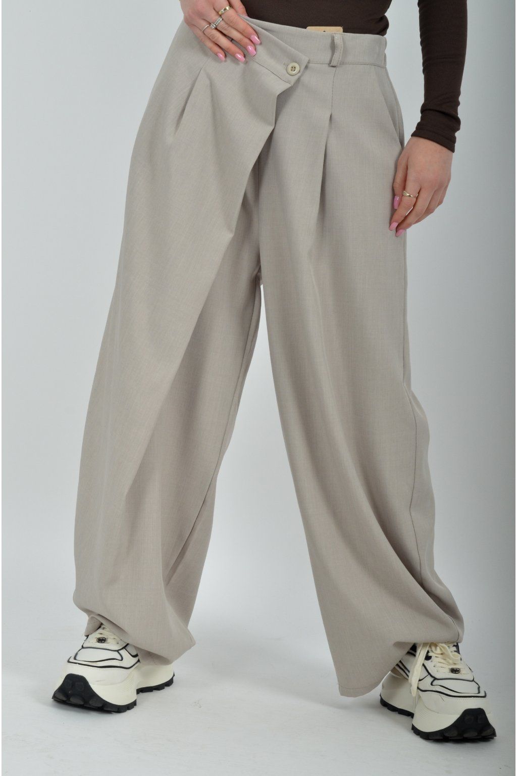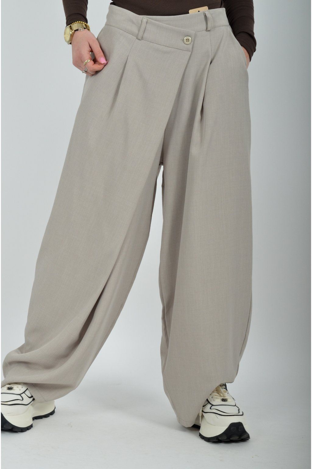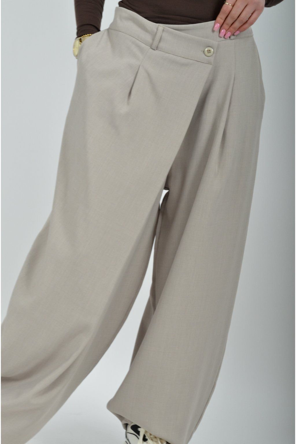 Jednobarevné kalhoty s překříženým pasem a kapsami na bocích. Krásně přizpůsobí postavě, díky podílu elastanu. Jsou vhodné pro každodenní nošení. V pase je zapracovaná guma a jsou vyrobené z příjemného odlehčeného materiálu.