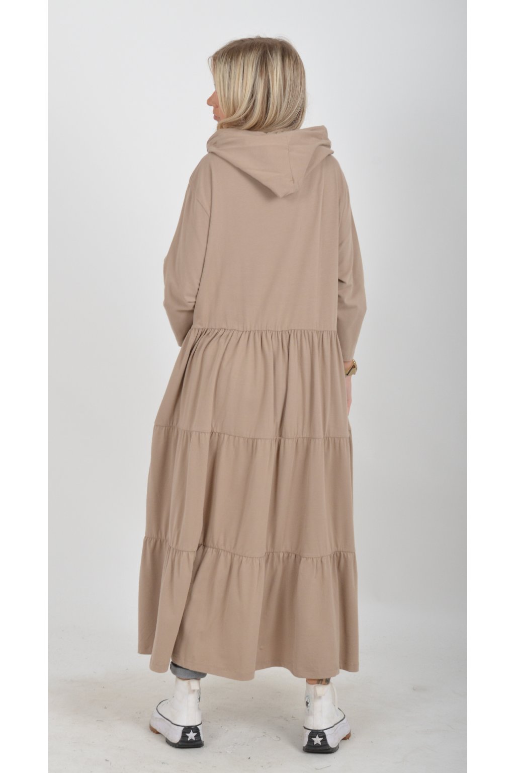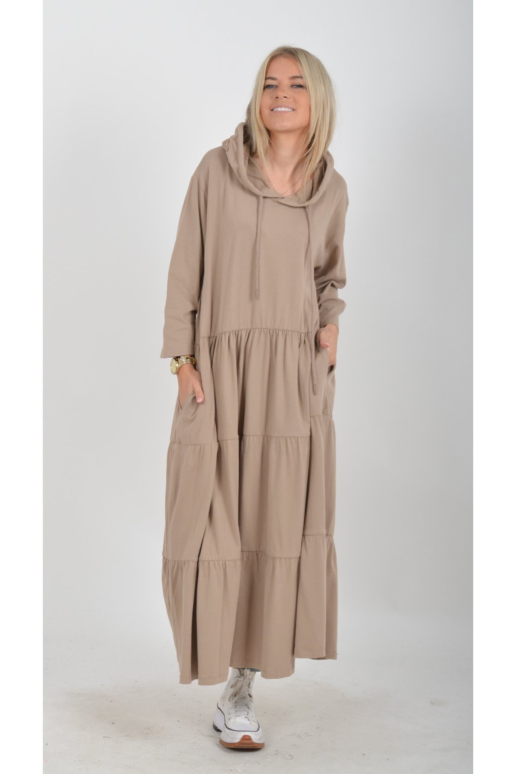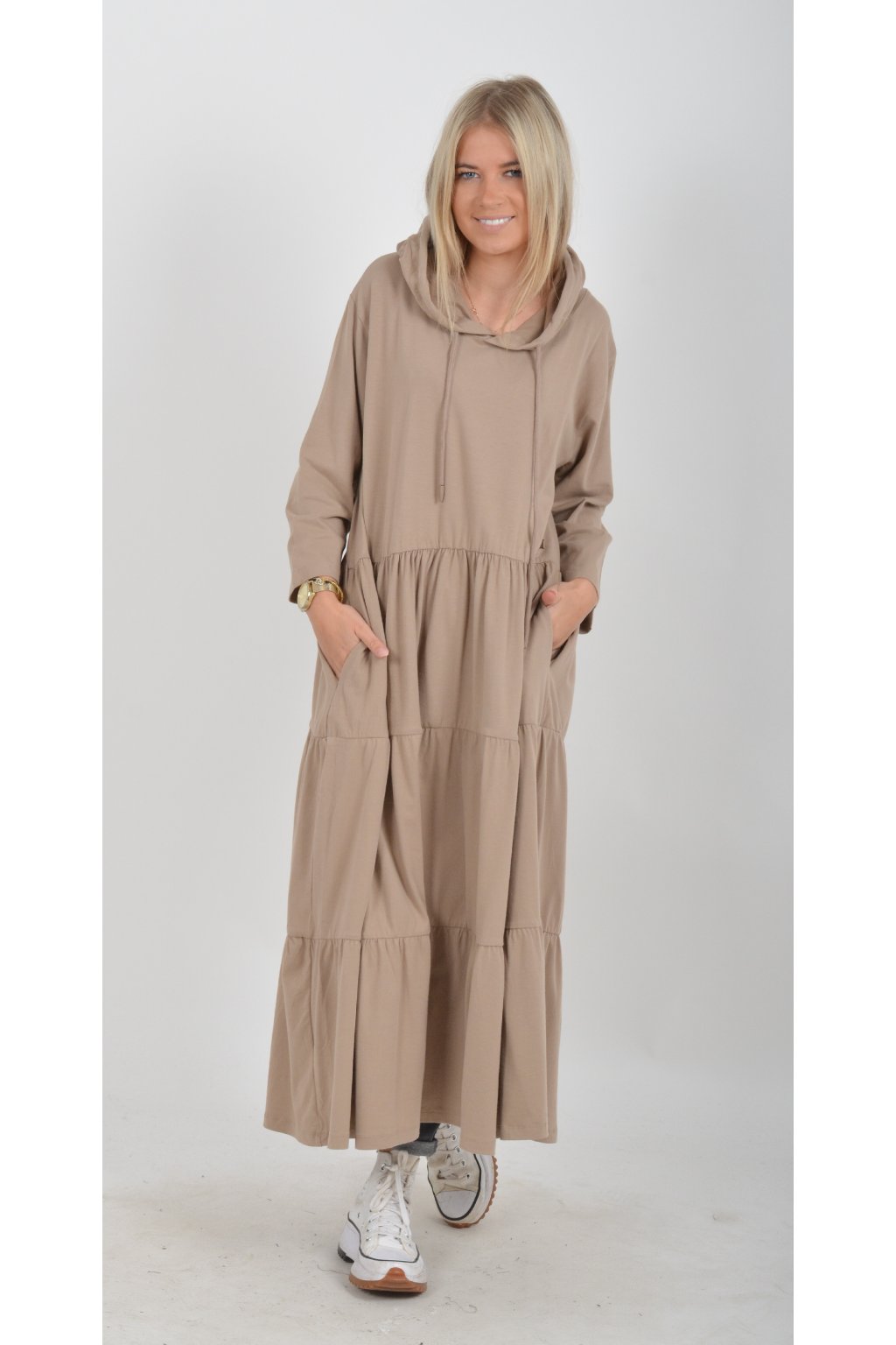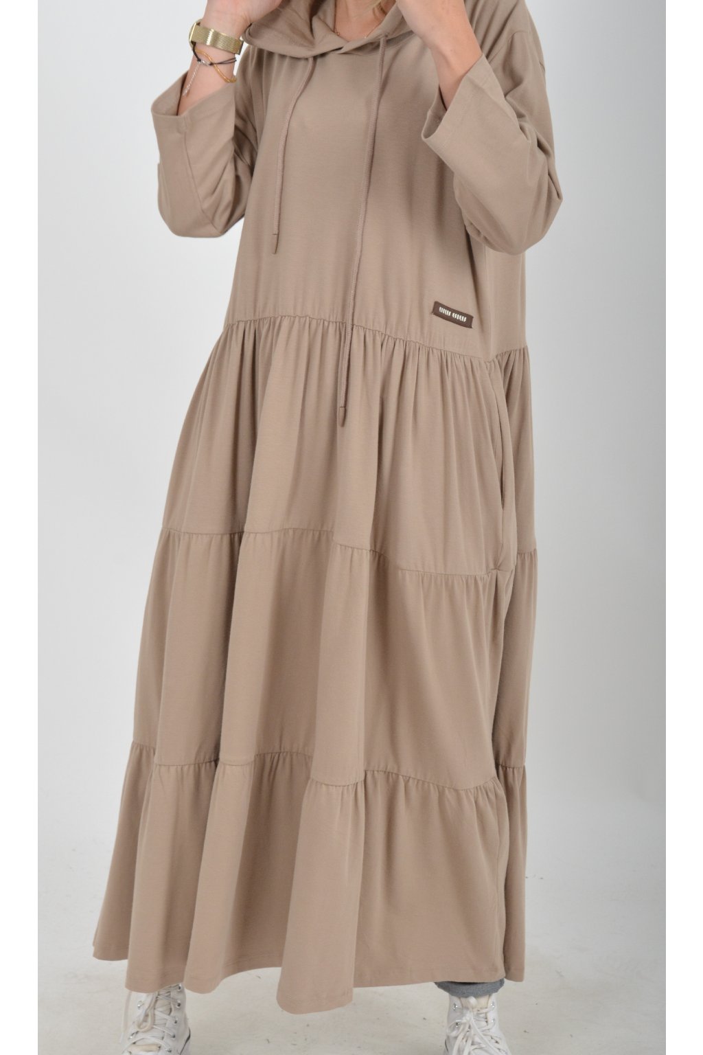 Stylové šaty s kapucí. Mají áčkový střih, tříčtvrteční rukáv a na bocích kapsy. Jsou vyrobené z velice příjemné turecké bavlny.