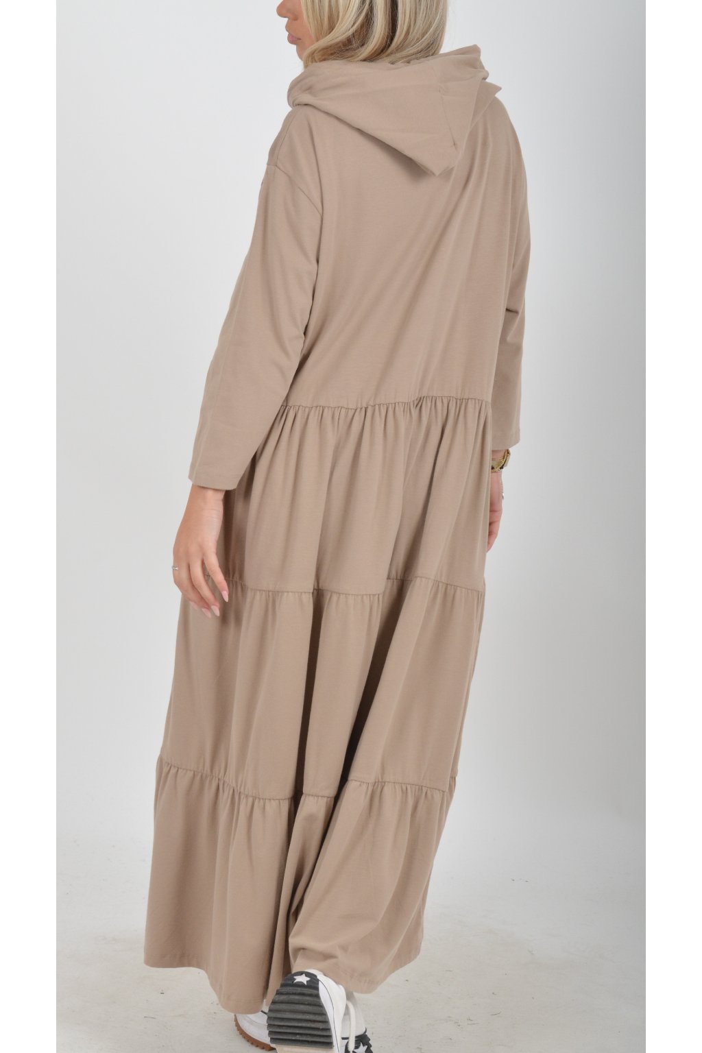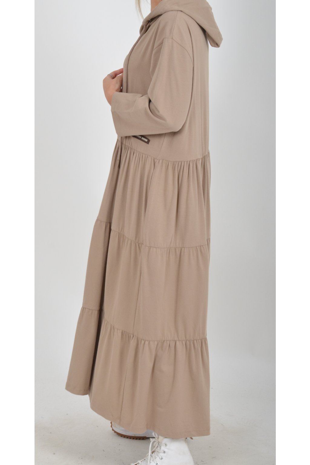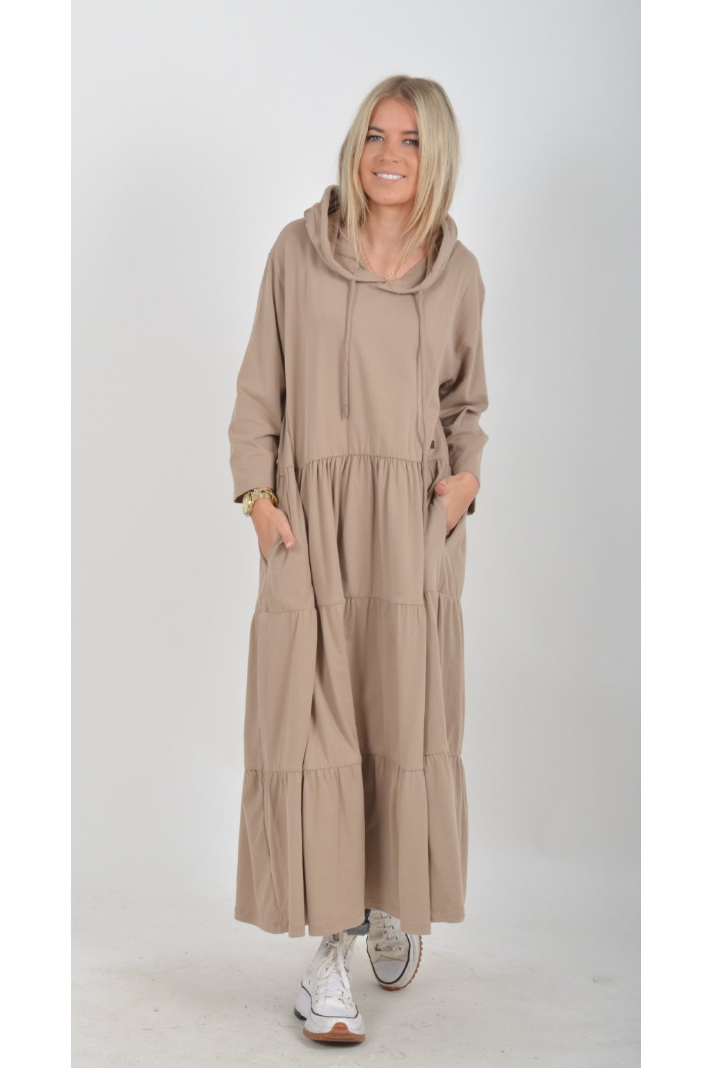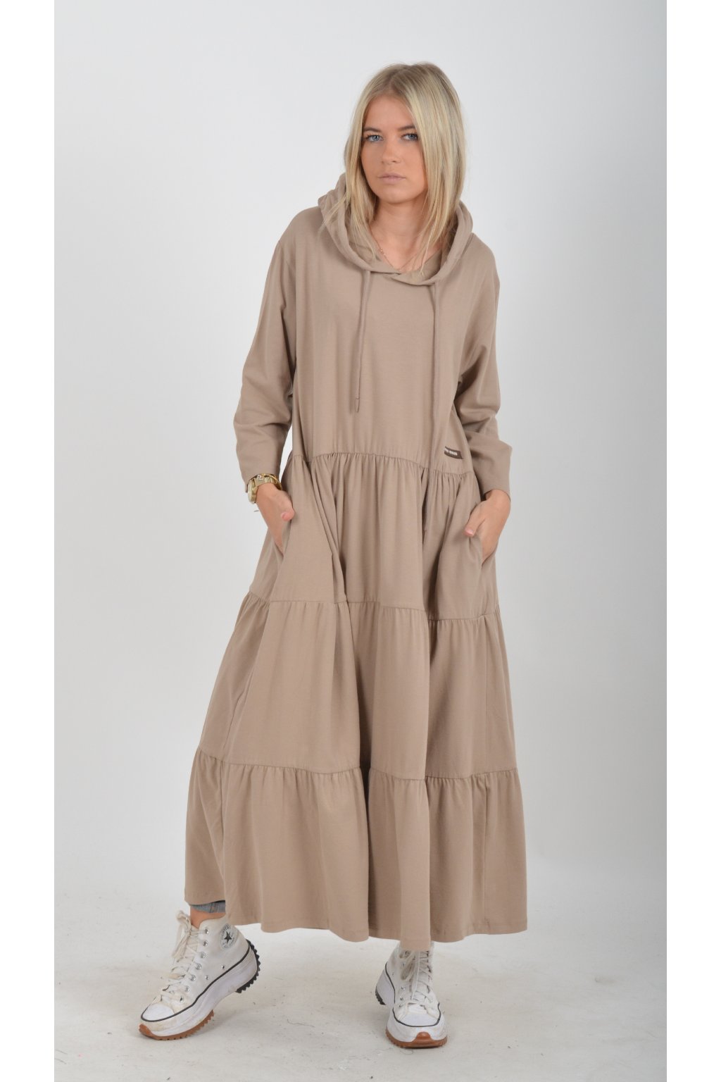 Stylové šaty s kapucí. Mají áčkový střih, tříčtvrteční rukáv a na bocích kapsy. Jsou vyrobené z velice příjemné turecké bavlny.