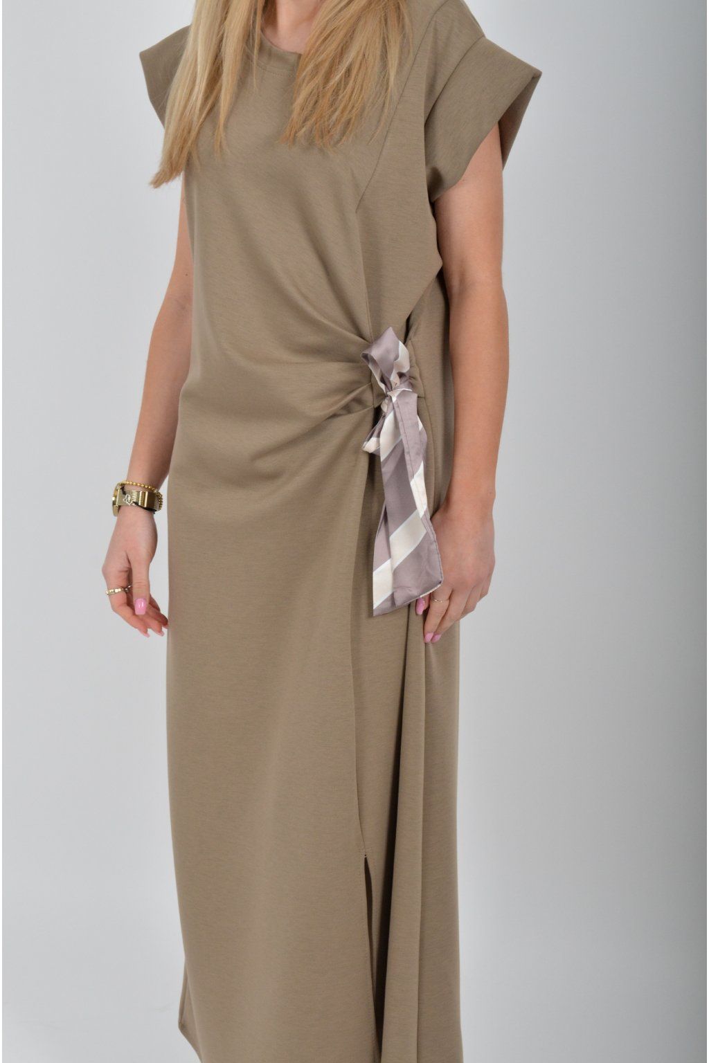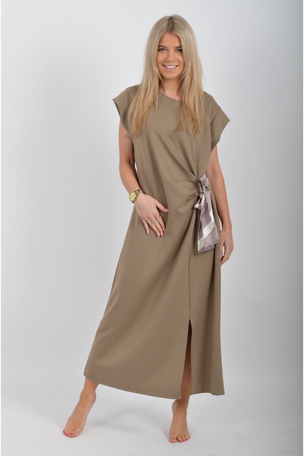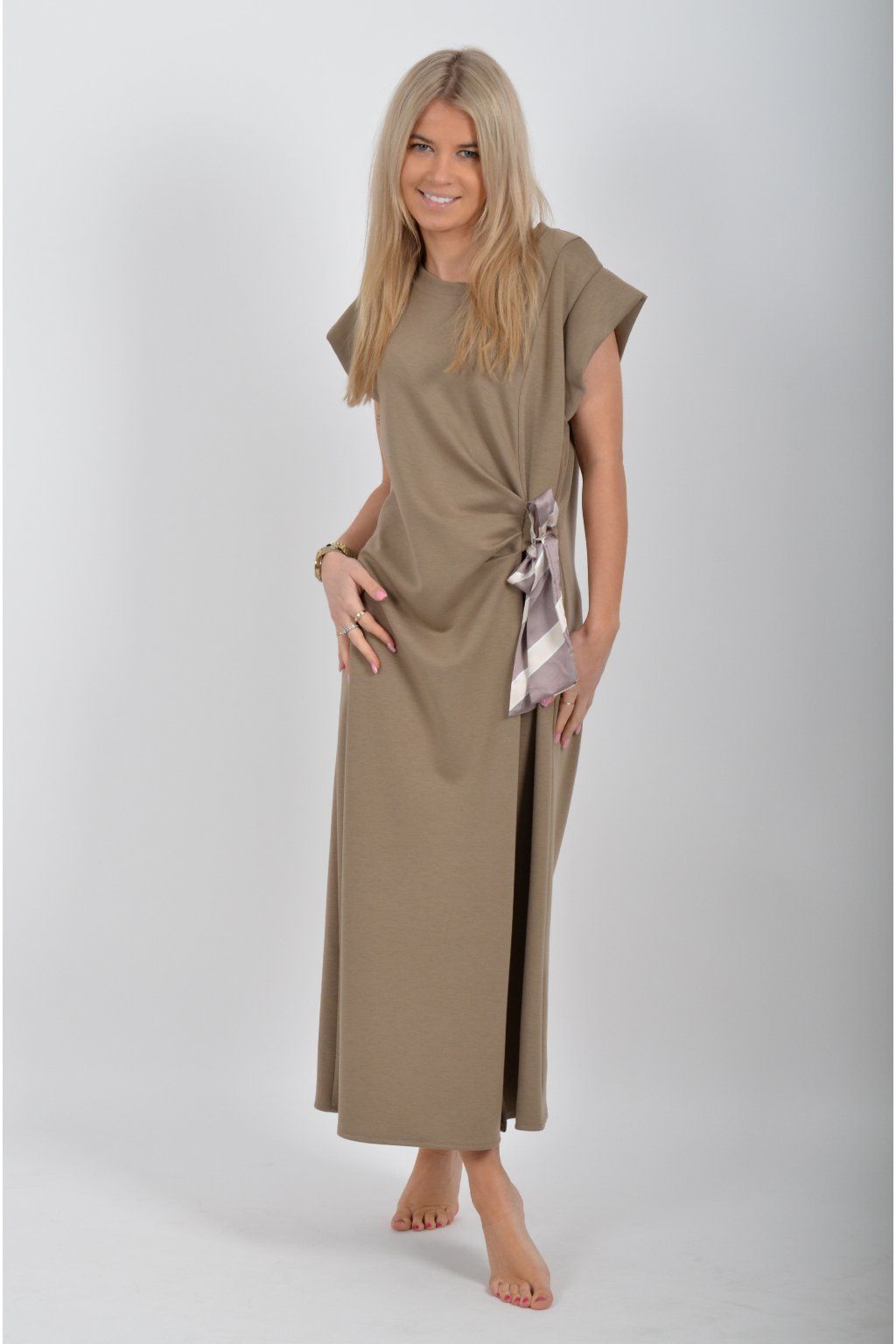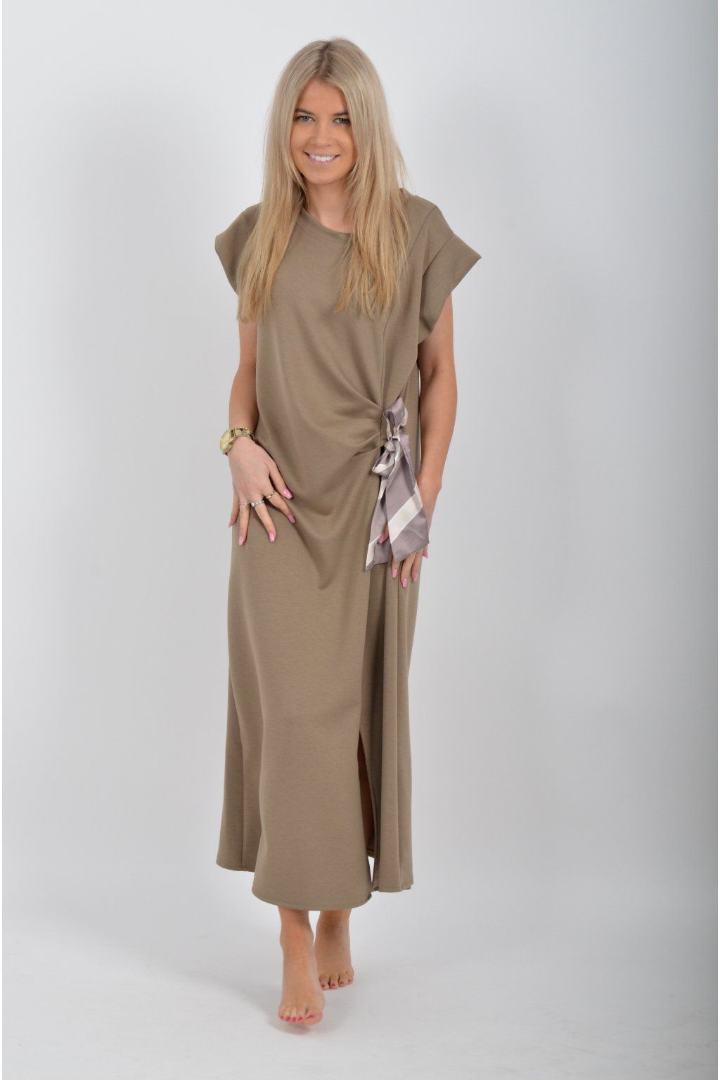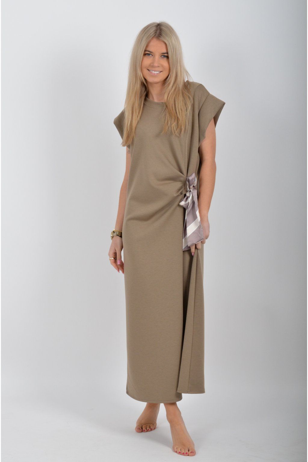 Dlouhé šaty vyrobené z velice příjemného máslového materiálu. Mají od pasu, který je lehce projmutý áčkový střih. V pase na boku mají "vázání" pomocí kterého lze šaty libovolně stáhnout aby dobře seděli na postavě. Ve spodní části májí rozparek a nemají kapsy.