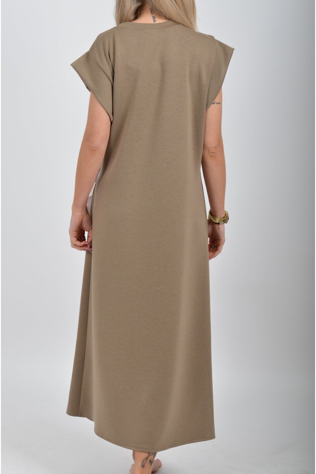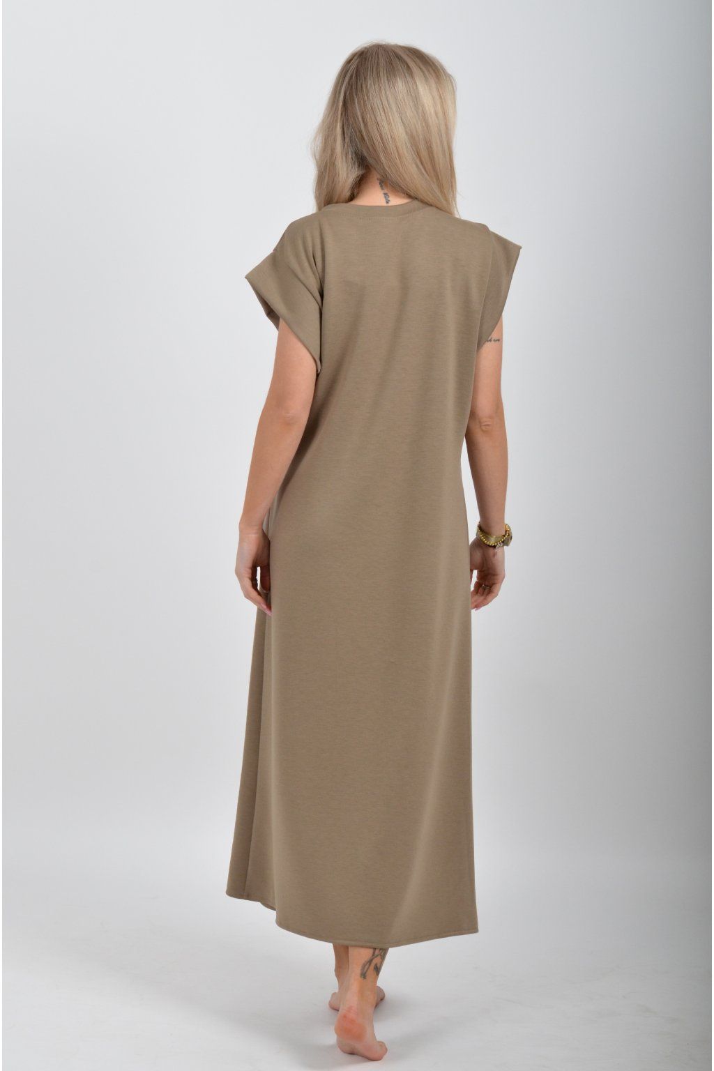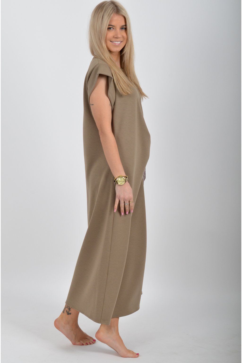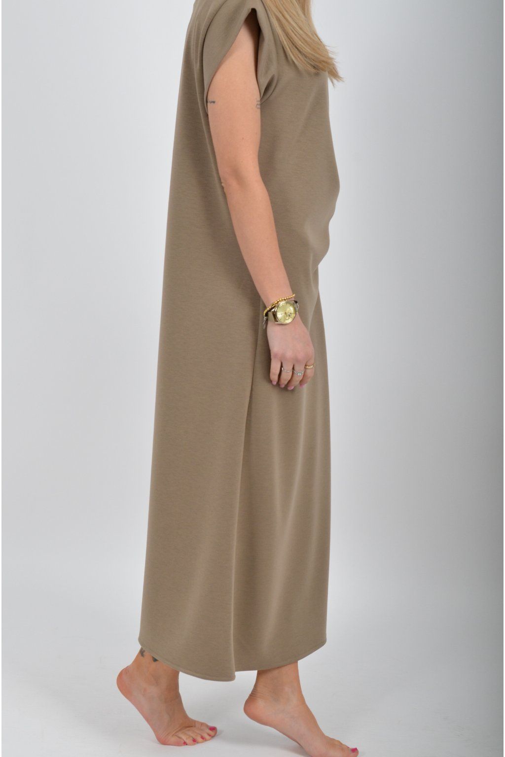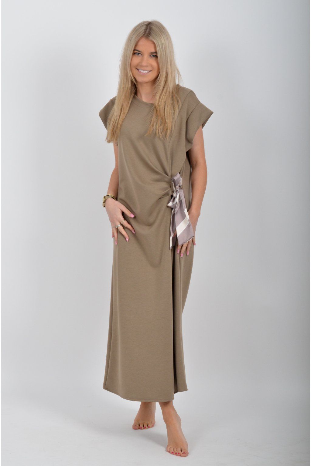 Dlouhé šaty vyrobené z velice příjemného máslového materiálu. Mají od pasu, který je lehce projmutý áčkový střih. V pase na boku mají "vázání" pomocí kterého lze šaty libovolně stáhnout aby dobře seděli na postavě. Ve spodní části májí rozparek a nemají kapsy.