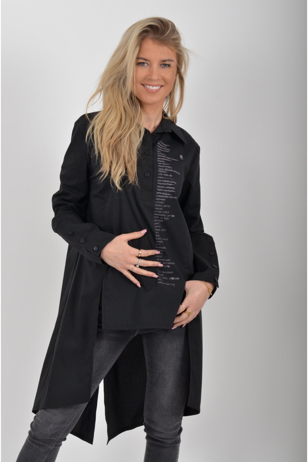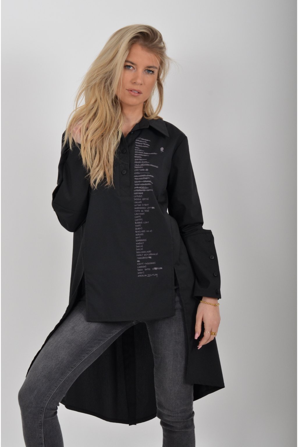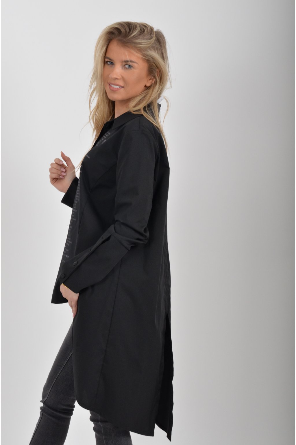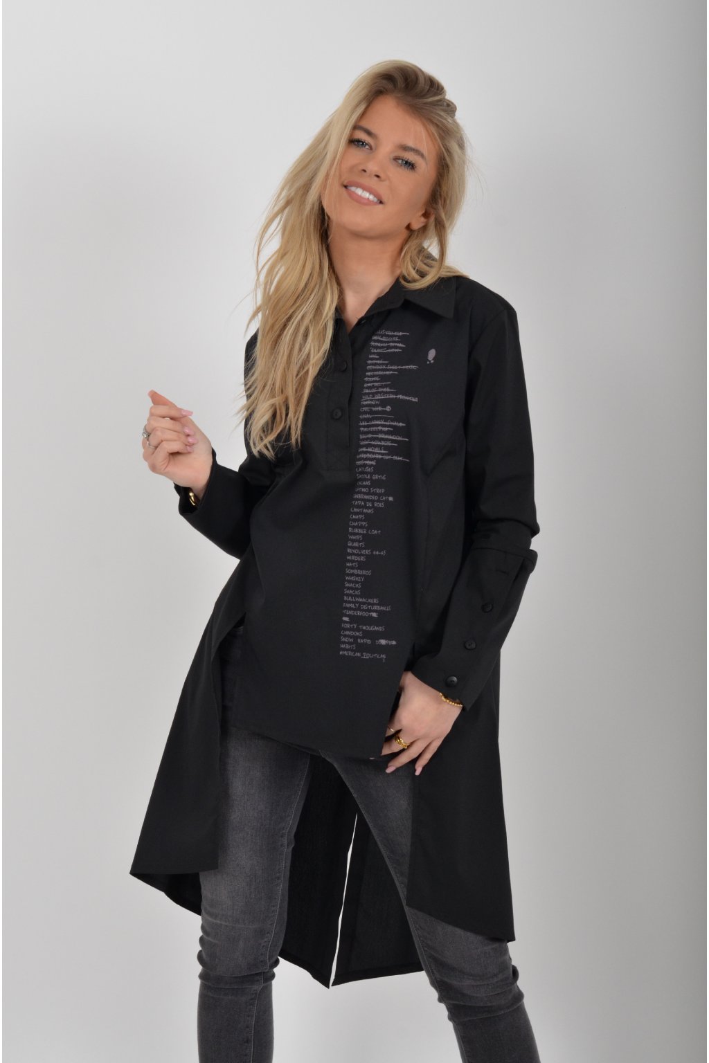 Luxusní košile atypického áčkového střihu s límečkem od značky Miss City Official. Zadní část košile je výrazně delší než přední, čímž optický prodlouží postavu. Má náprsní kapsy a dlouhý rukáv. Zapínání je na knoflíky. Košile je vyrobena z velice příjemného materiálu. Je vhodná jak džínům, tak k legínám. Hodí se jak do společnosti, tak i ke každodennímu nošení.