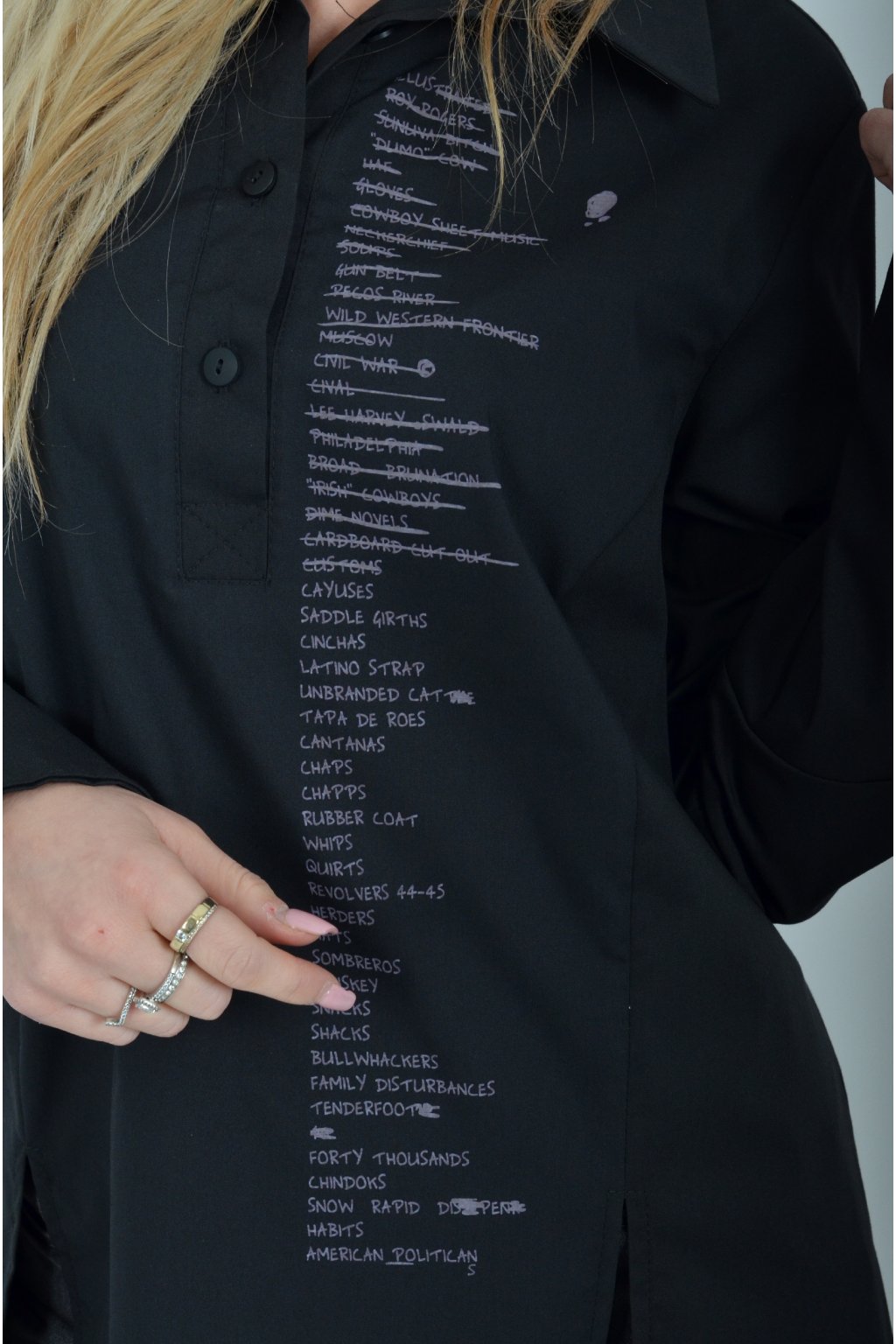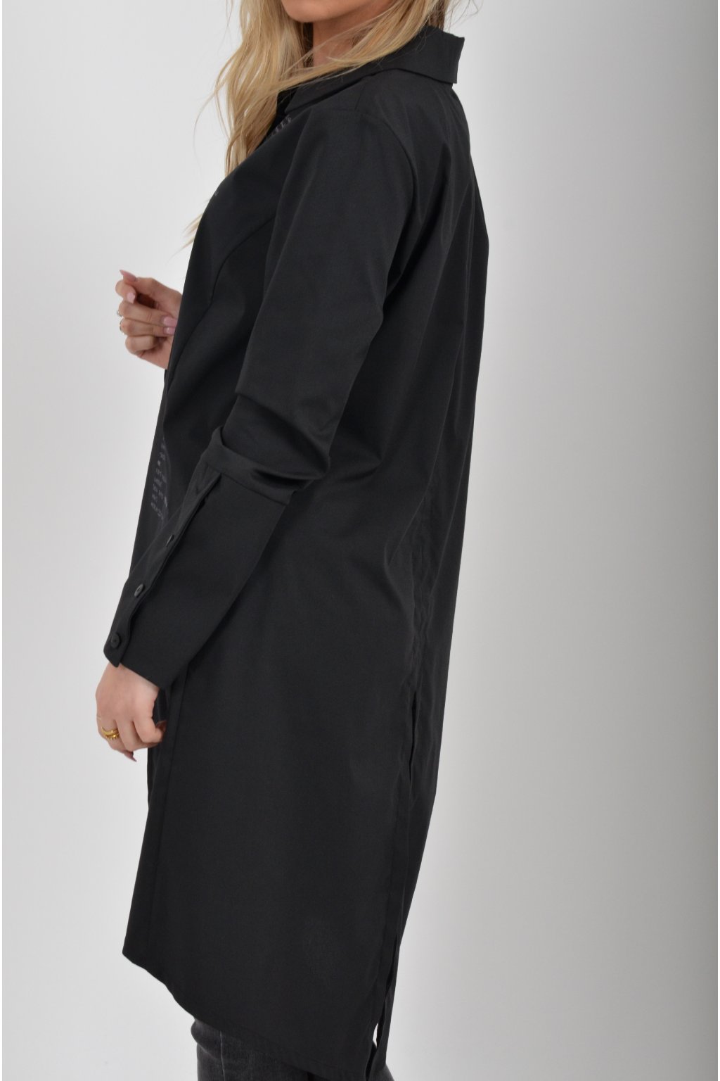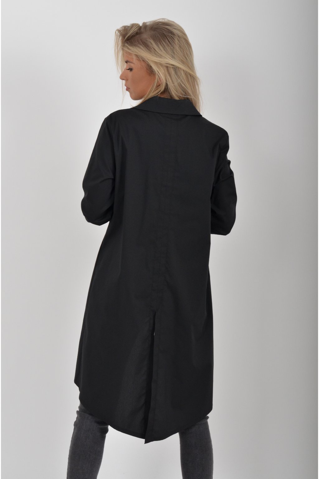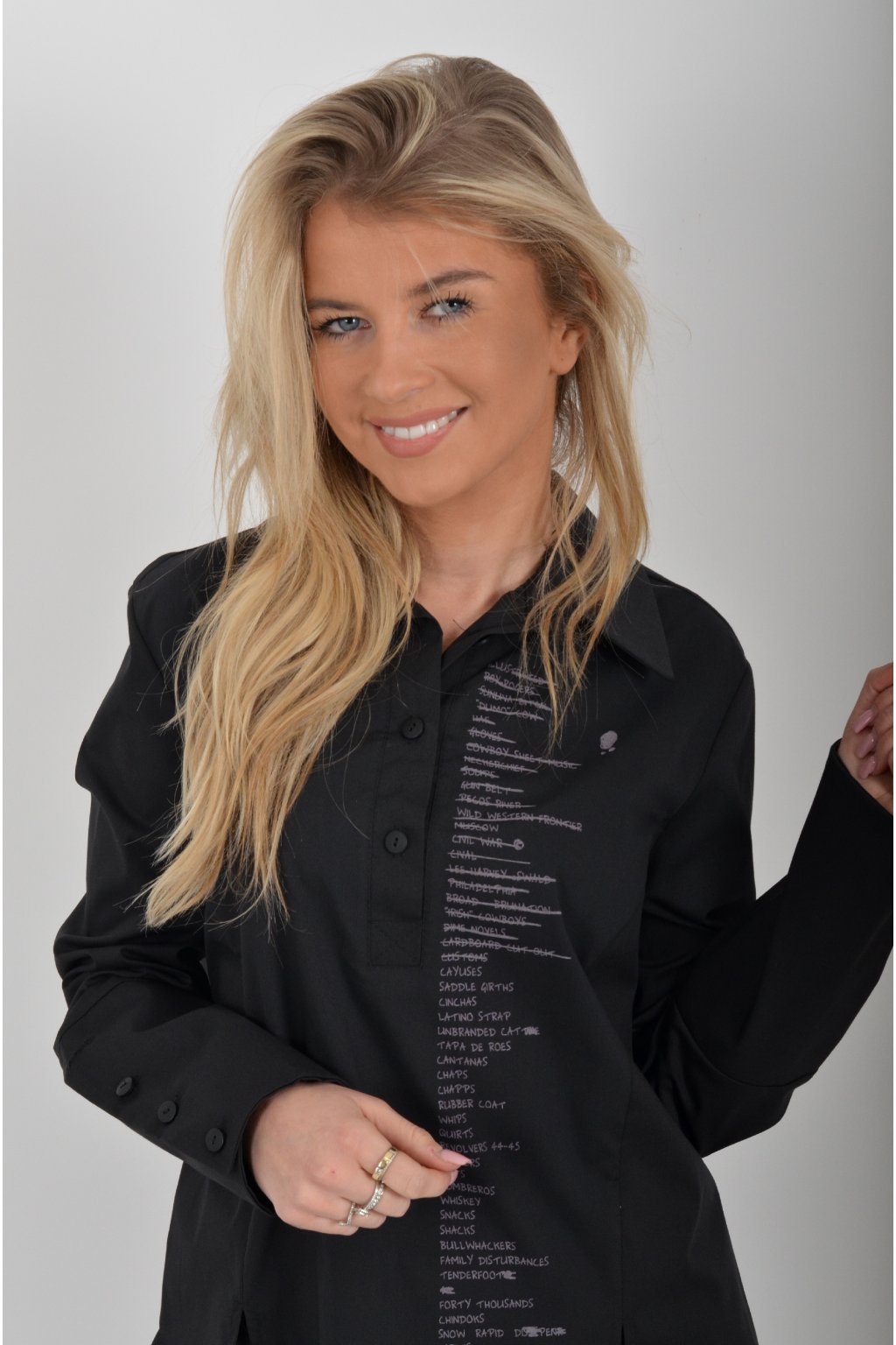 Luxusní košile atypického áčkového střihu s límečkem od značky Miss City Official. Zadní část košile je výrazně delší než přední, čímž optický prodlouží postavu. Má náprsní kapsy a dlouhý rukáv. Zapínání je na knoflíky. Košile je vyrobena z velice příjemného materiálu. Je vhodná jak džínům, tak k legínám. Hodí se jak do společnosti, tak i ke každodennímu nošení.
