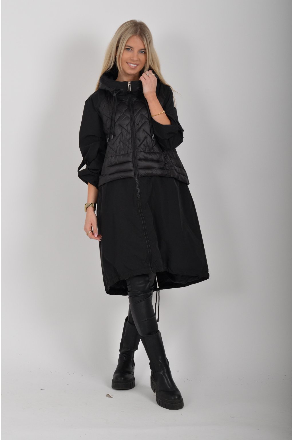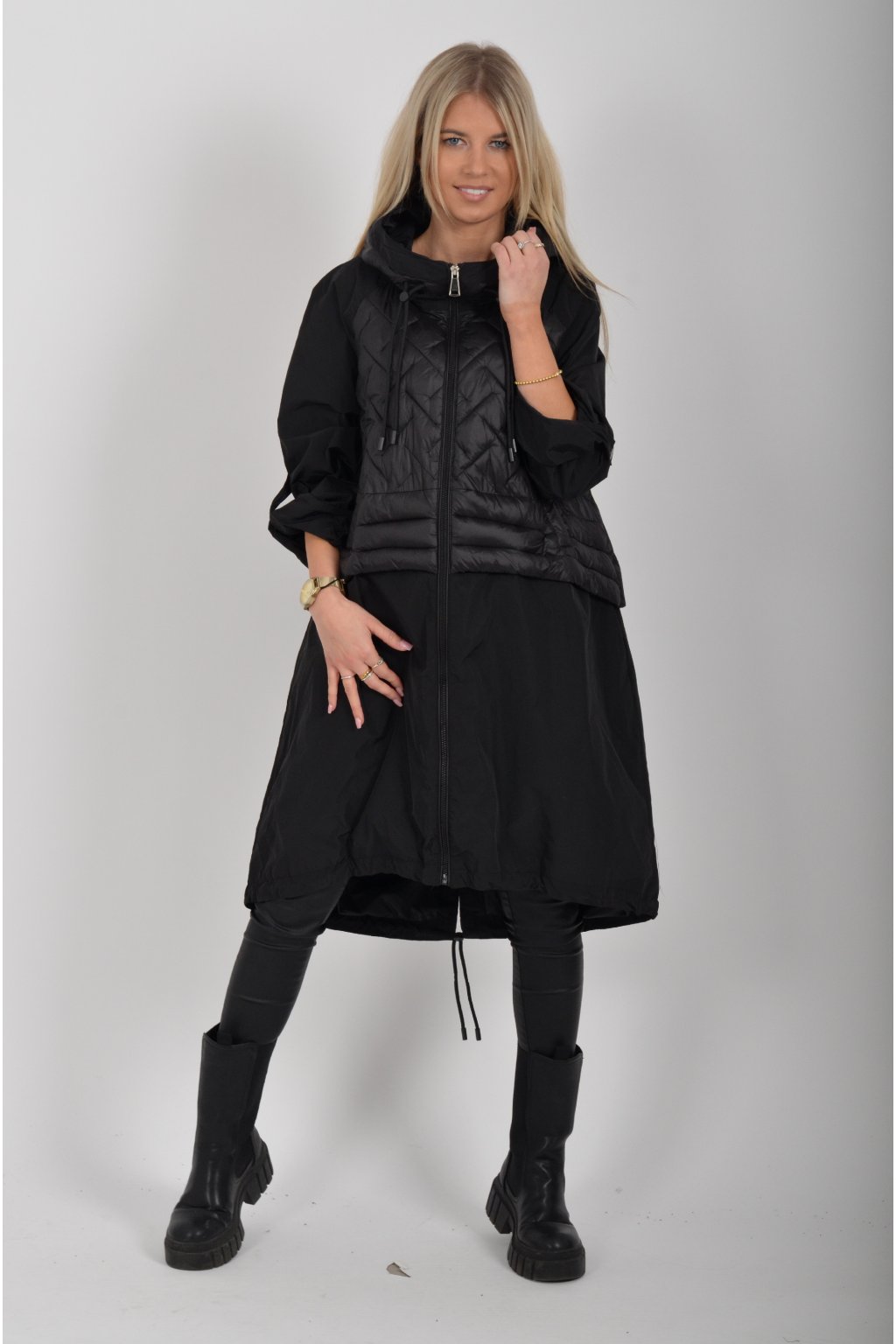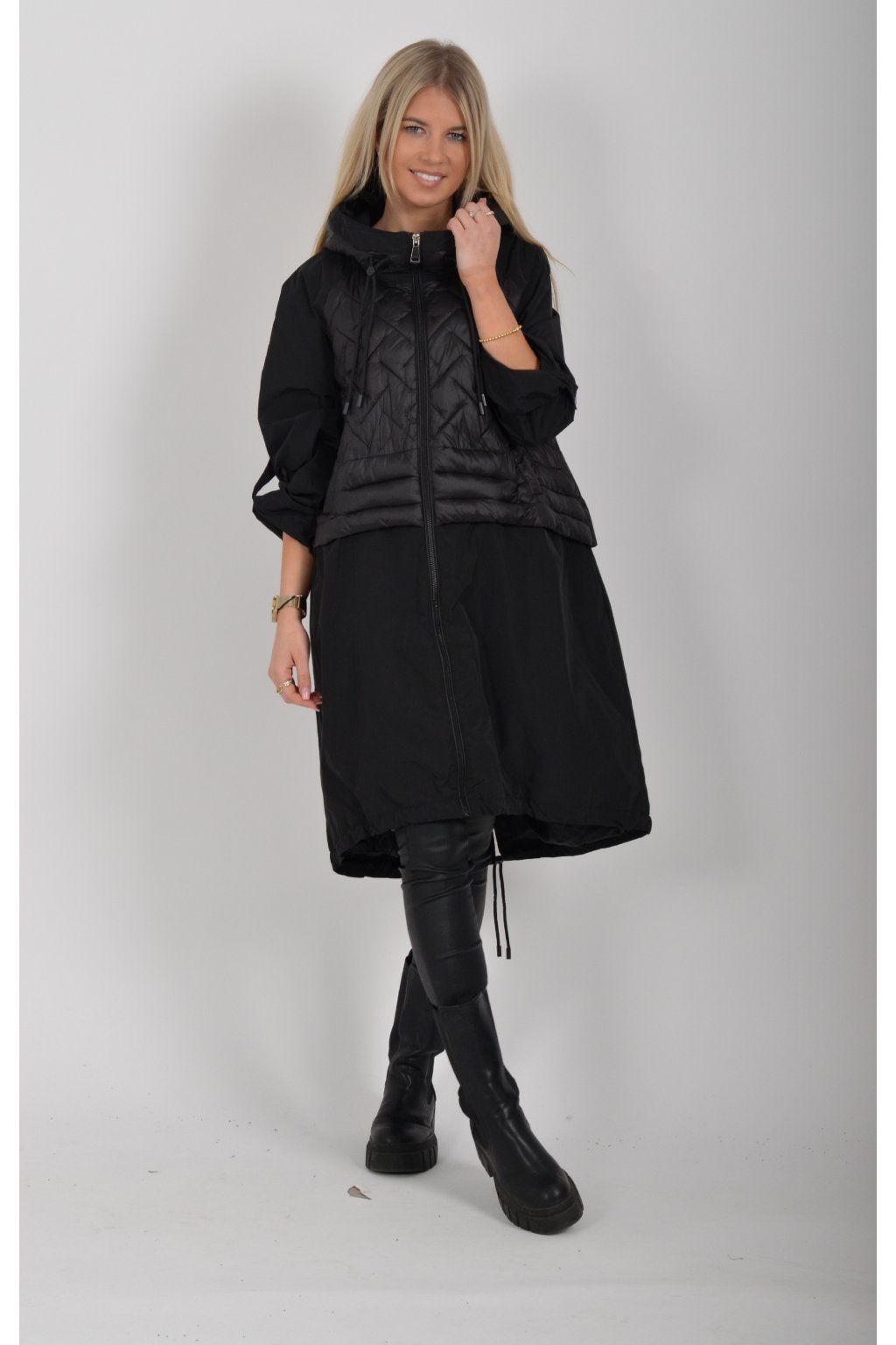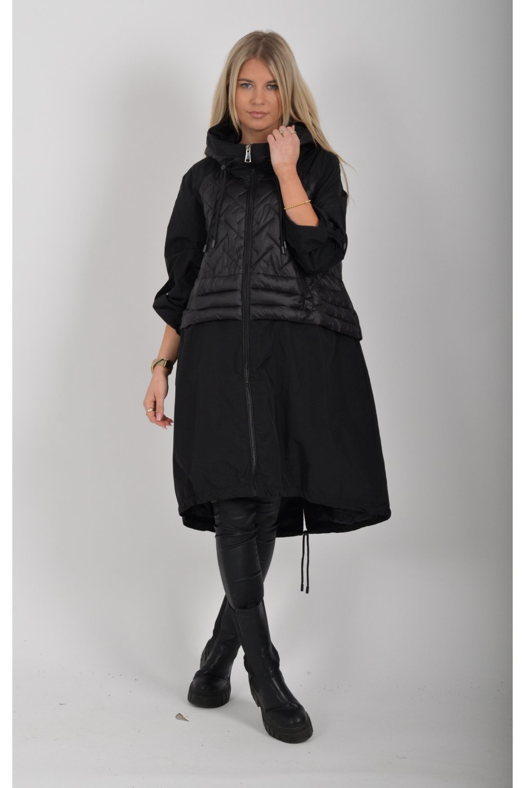 Přechodová parka s kapuci a kapsami na zip v přední části bocích. Má áčkový střih, ve spodní části zapracovanou tkaničku pro libovolné stažení.