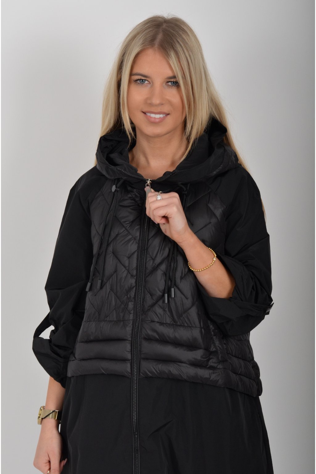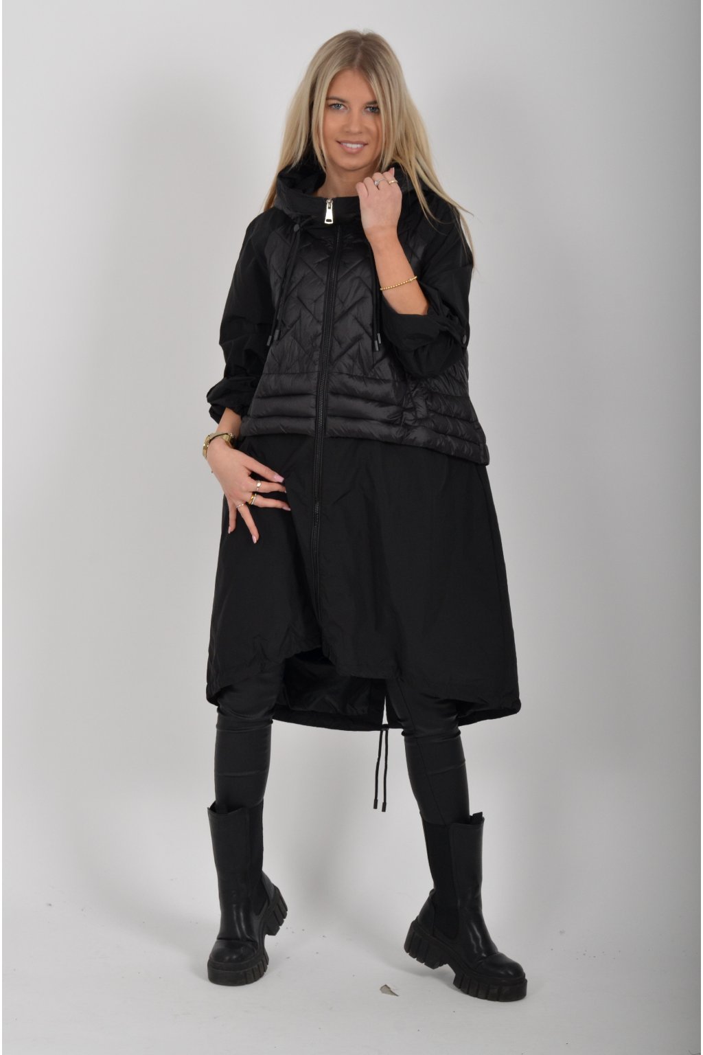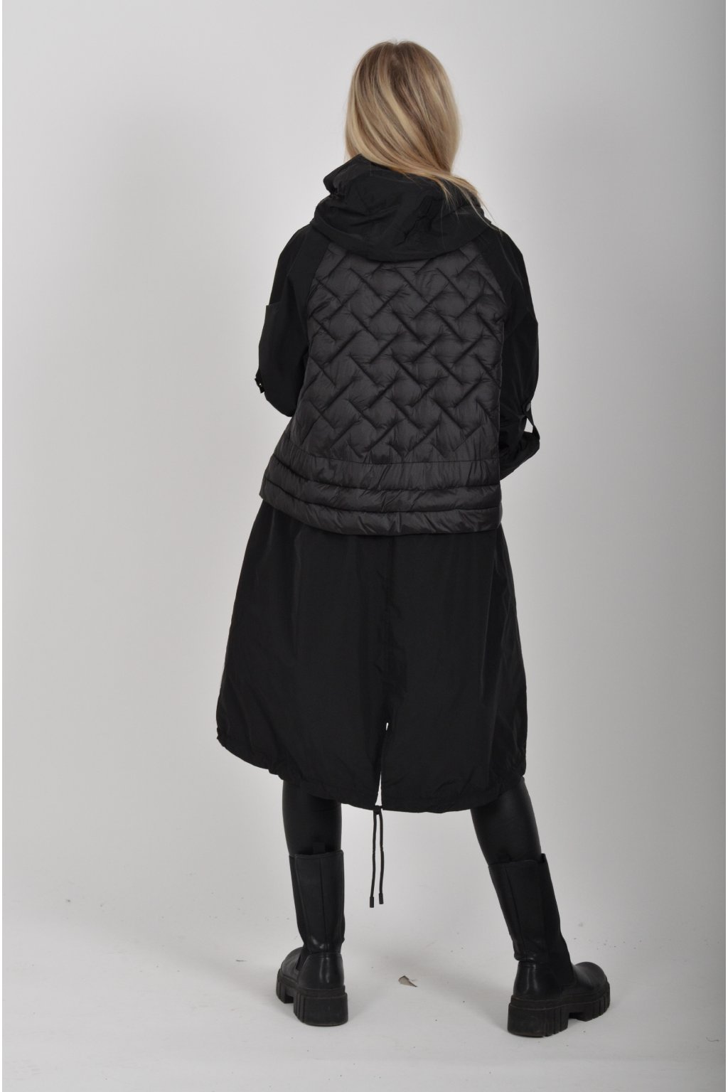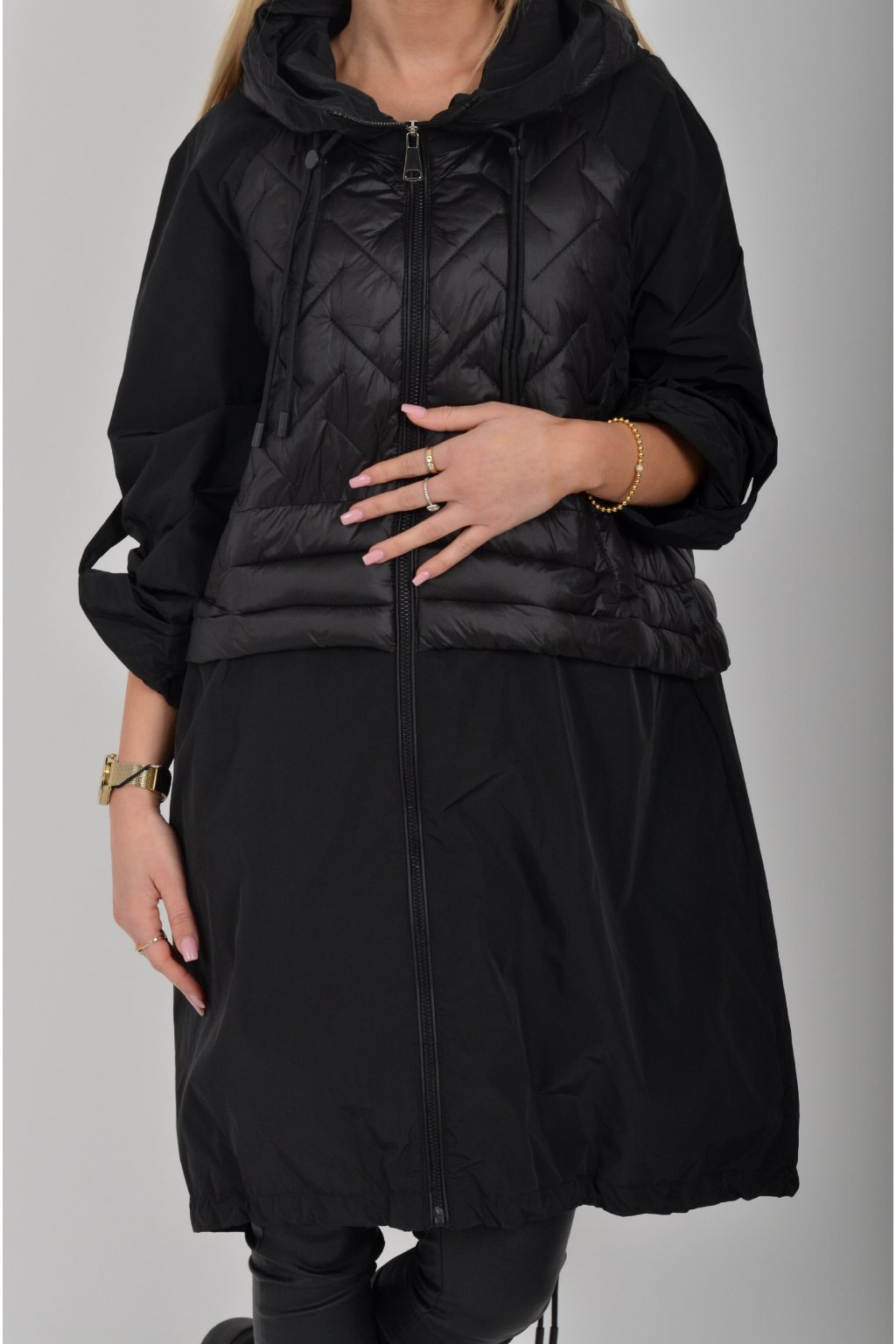 Přechodová parka s kapuci a kapsami na zip v přední části bocích. Má áčkový střih, ve spodní části zapracovanou tkaničku pro libovolné stažení.