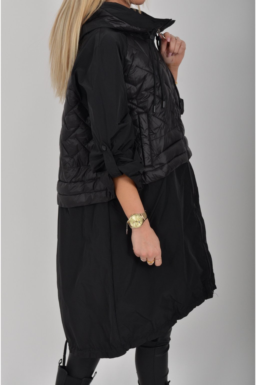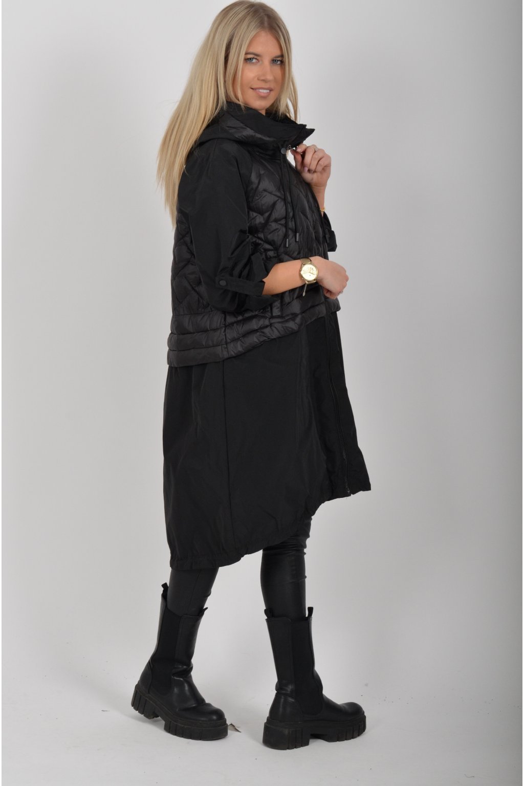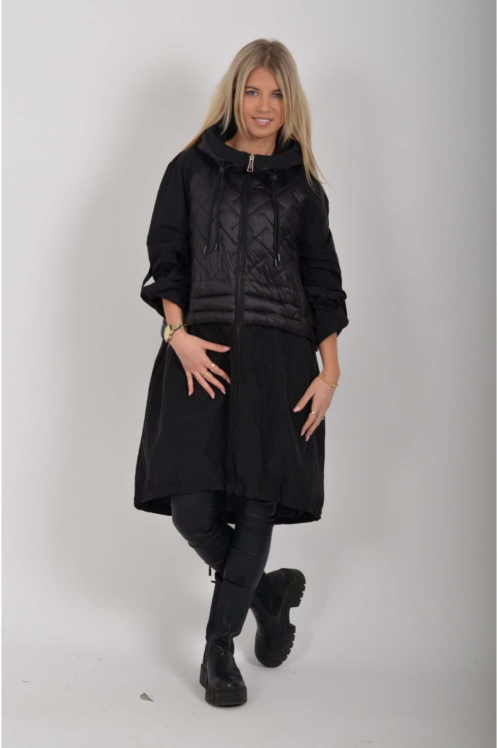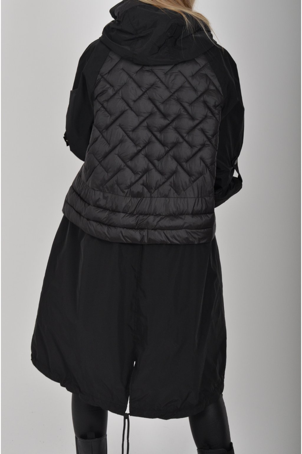 Přechodová parka s kapuci a kapsami na zip v přední části bocích. Má áčkový střih, ve spodní části zapracovanou tkaničku pro libovolné stažení.