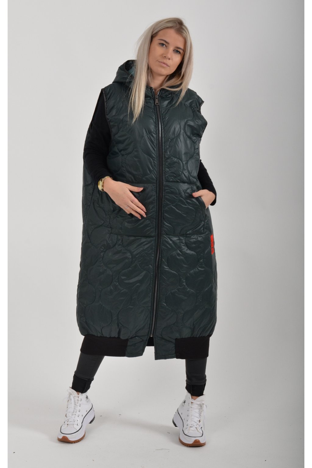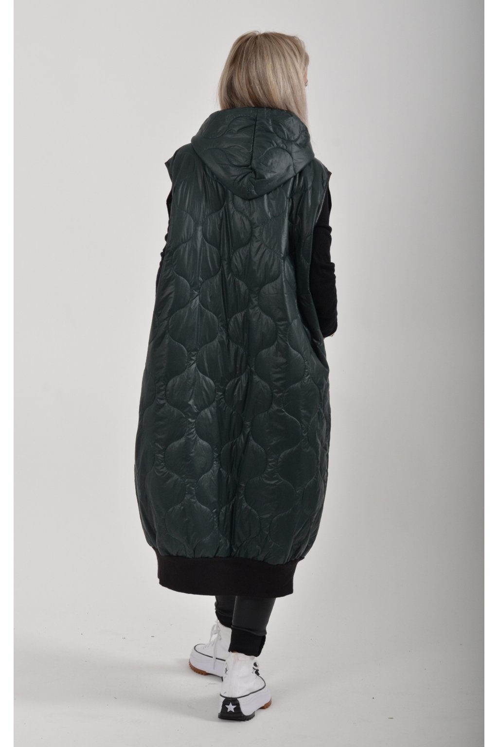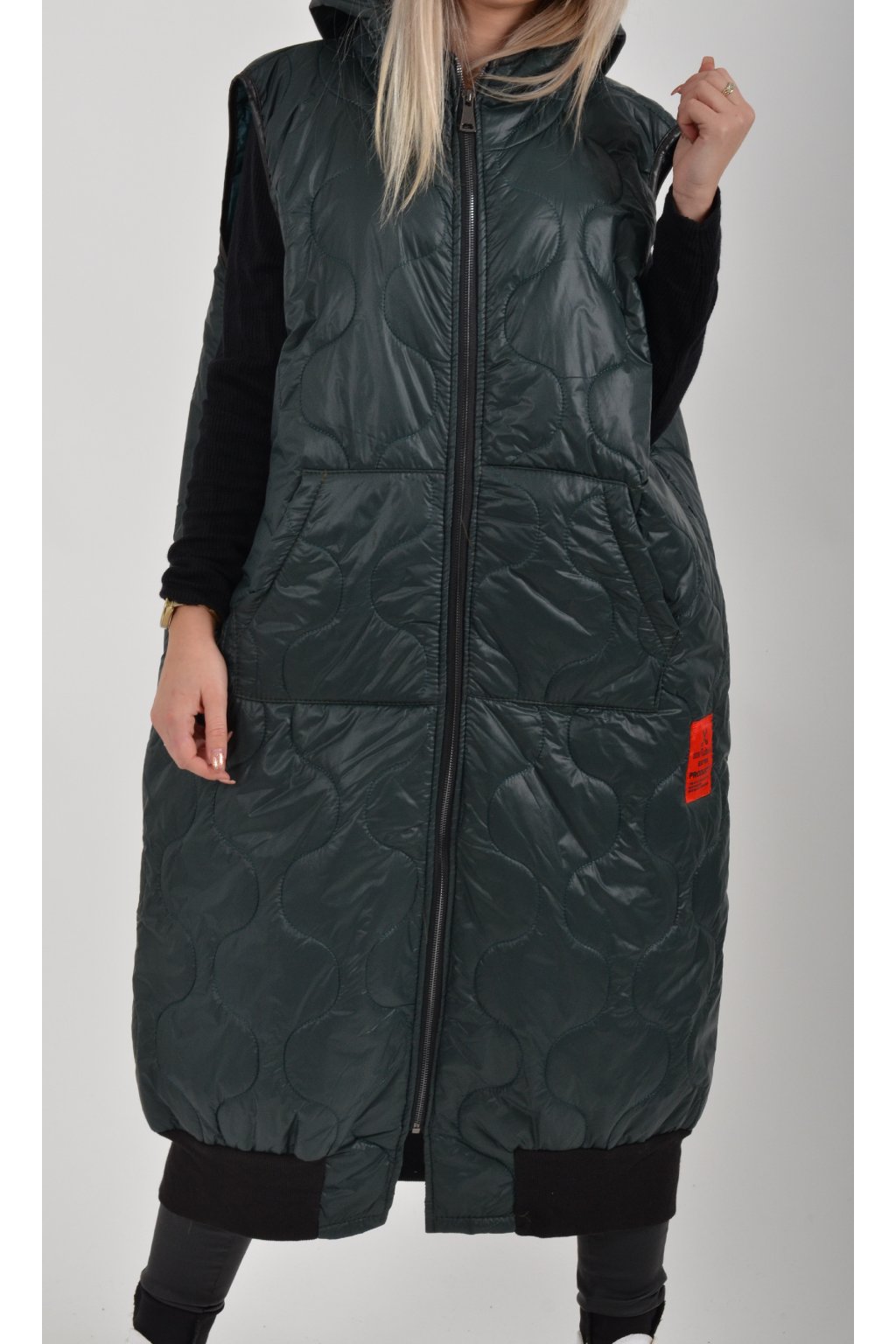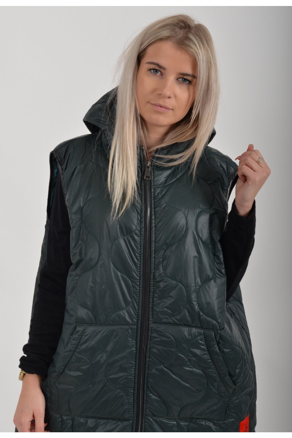 Prošívaná přechodová dlouhá vesta rovného střihu s kapucí a klokaní kapsou. Materiál vesty je tenký a lehký.