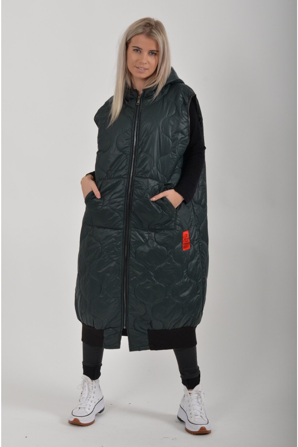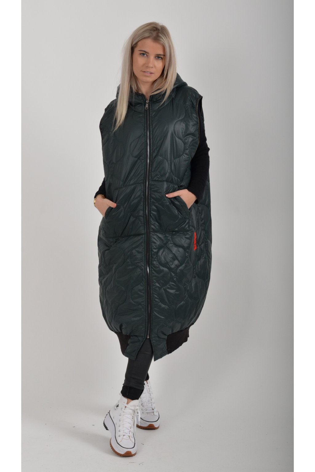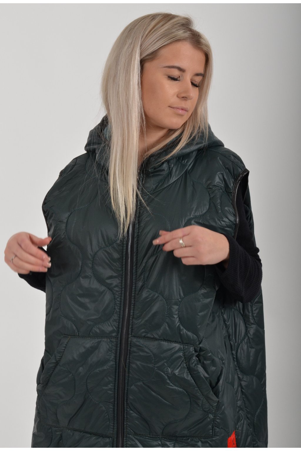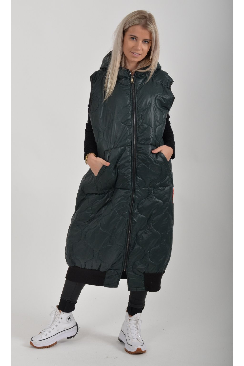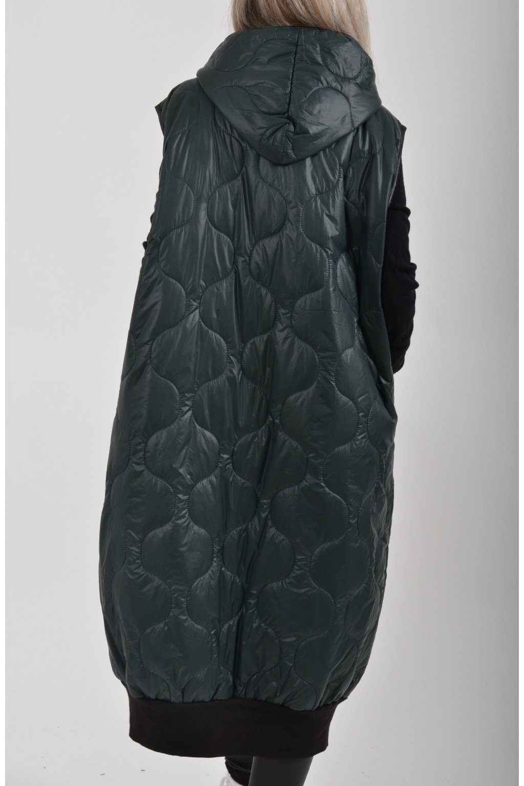 Prošívaná přechodová dlouhá vesta rovného střihu s kapucí a klokaní kapsou. Materiál vesty je tenký a lehký.