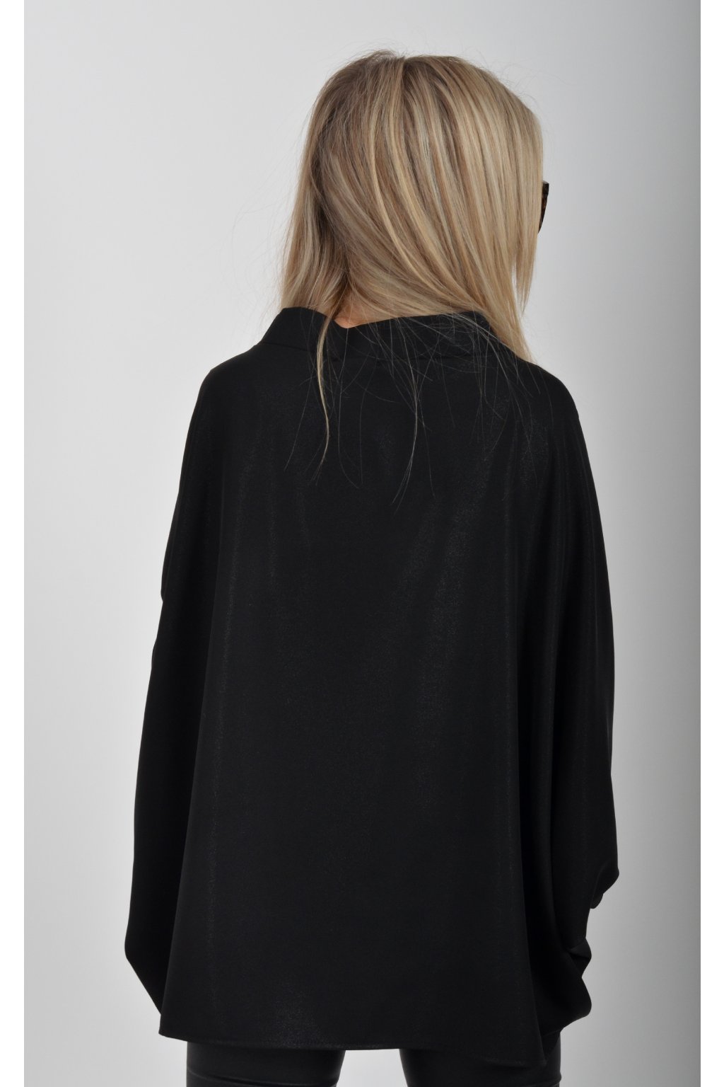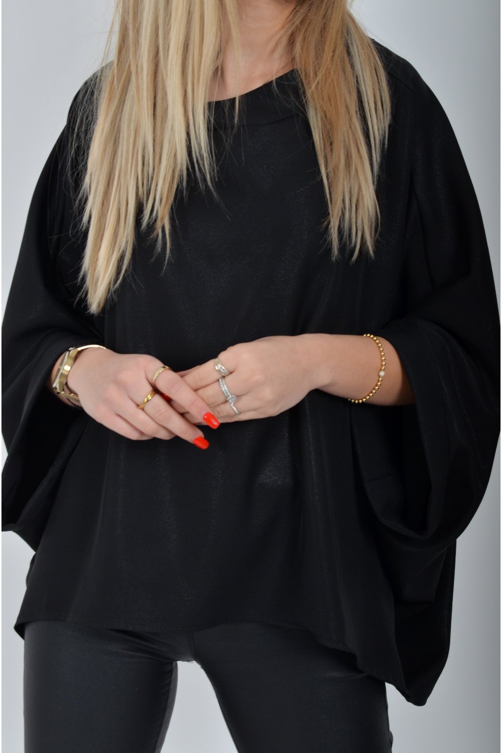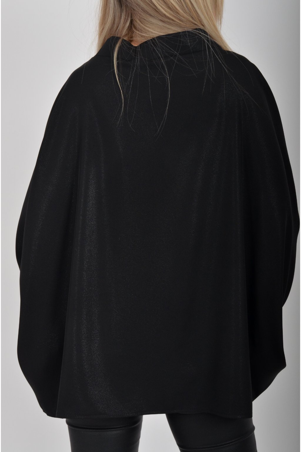 Halenka značky Miss City Official s netopýřím rukávem vhodná jak pro společenské události, tak i volnočasové nošení. Je vyrobena z velice příjemného a pevného materiálu. Materiál má lehce lesklý efekt podobný lurexu. Přední část halenky je kratší než zadní. Halenka je volnějšího nadčasového střihu.