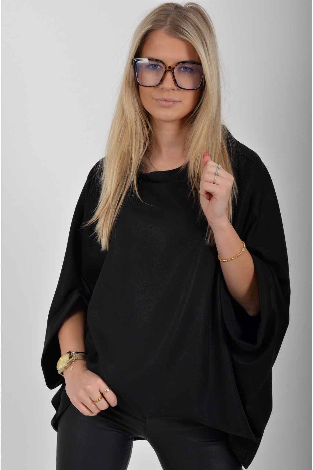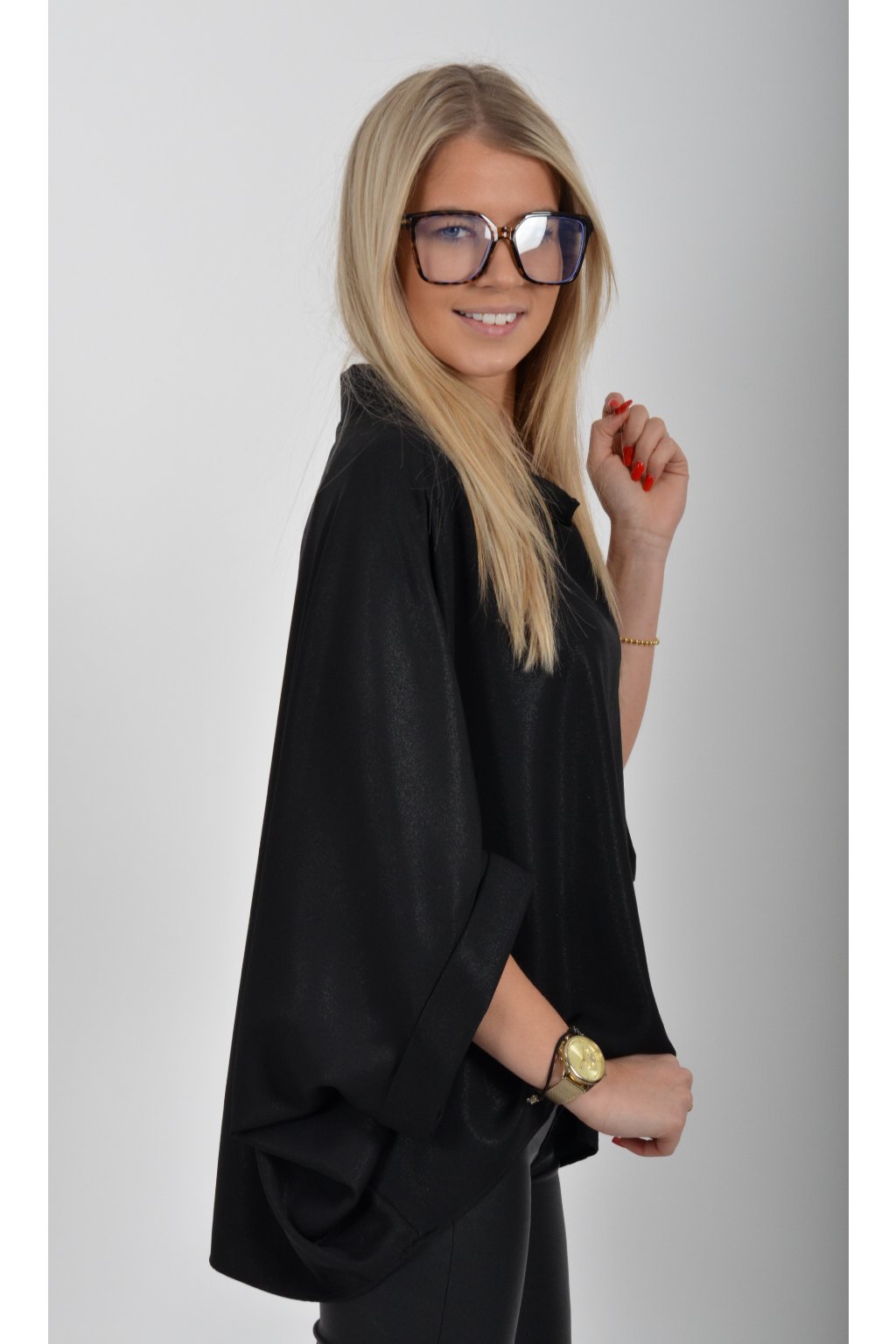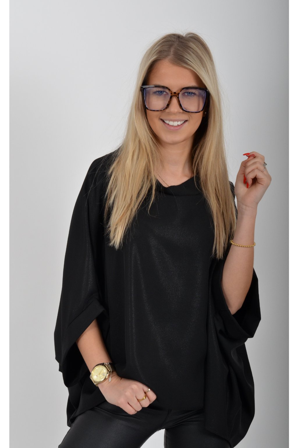 Halenka značky Miss City Official s netopýřím rukávem vhodná jak pro společenské události, tak i volnočasové nošení. Je vyrobena z velice příjemného a pevného materiálu. Materiál má lehce lesklý efekt podobný lurexu. Přední část halenky je kratší než zadní. Halenka je volnějšího nadčasového střihu.
