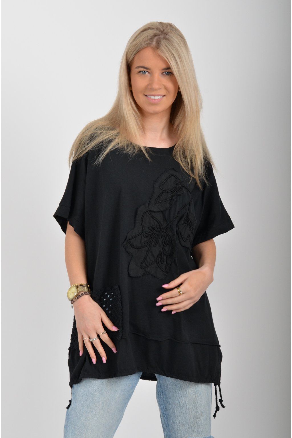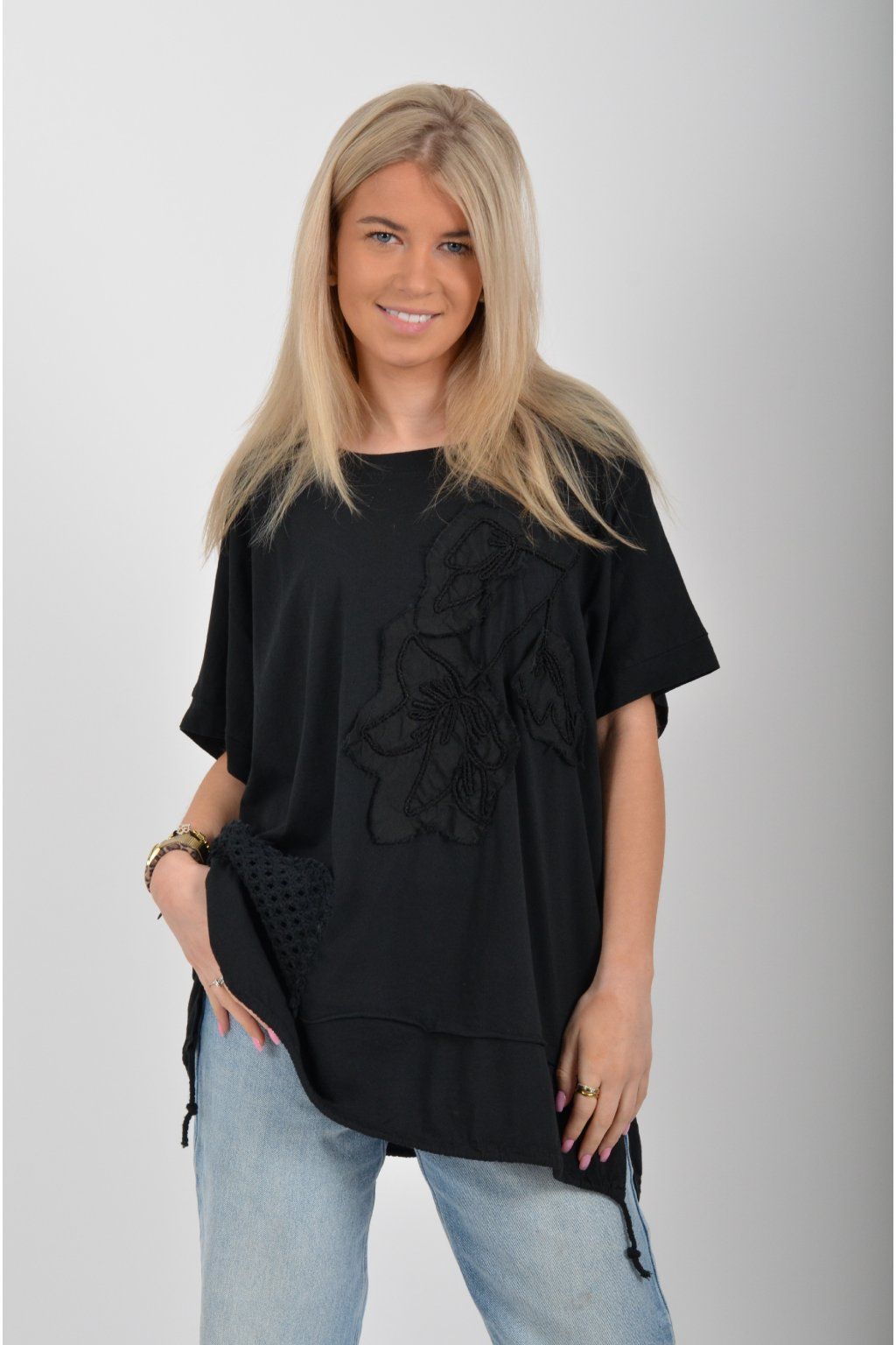 Oversize halenka s krátkým rukávem a vyšívaným vzorem vyrobená z velice příjemné bavlny. Materiál halenky je pružný. Ve spodní části na bocích má rozparky, a po celém spodním švu je zapracovaná tkanice pro libovolné stažení.