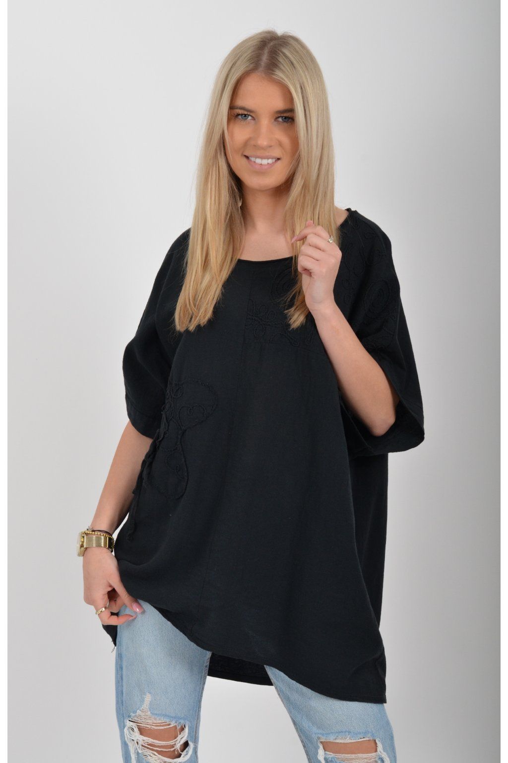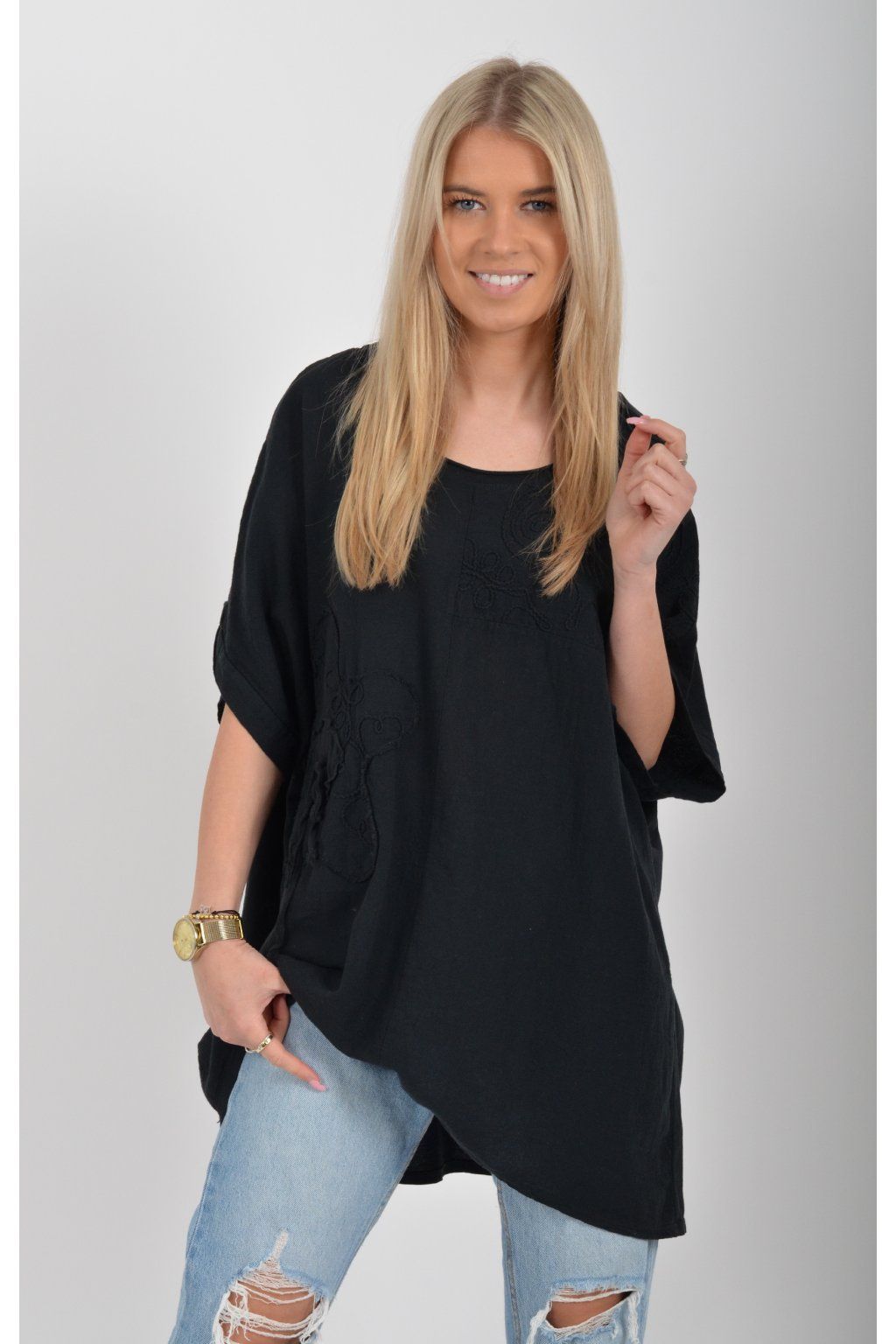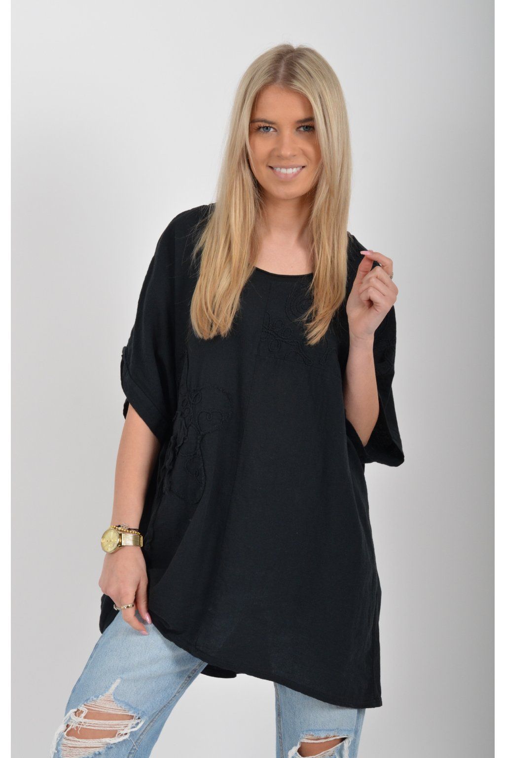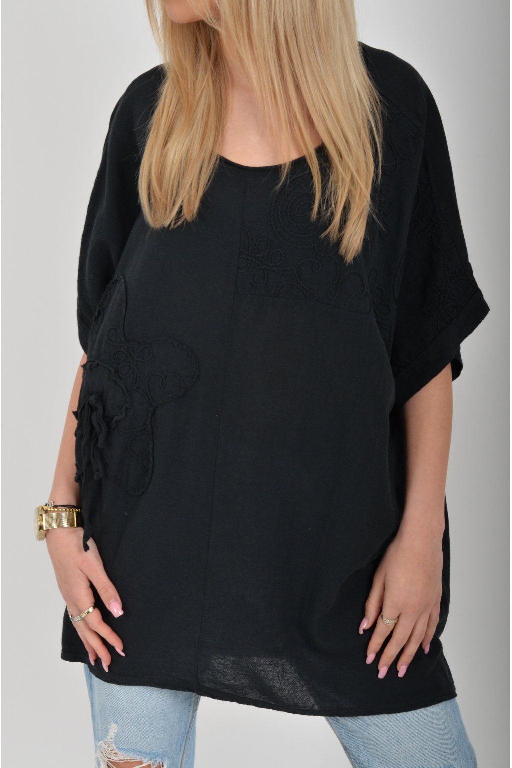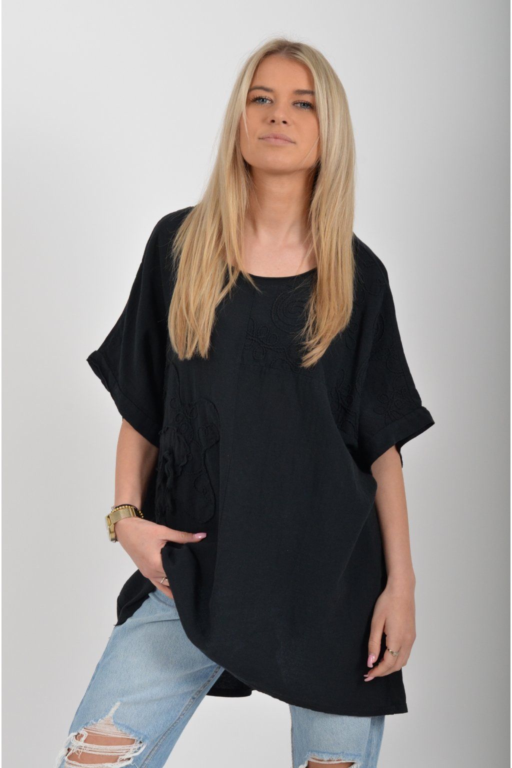 Oversize halenka s krátkým rukávem a vyšívaným vzorem vyrobená z velice příjemné bavlny. Materiál halenky je lehce pružný. Je volnějšího stylu nošení (není na tělo)