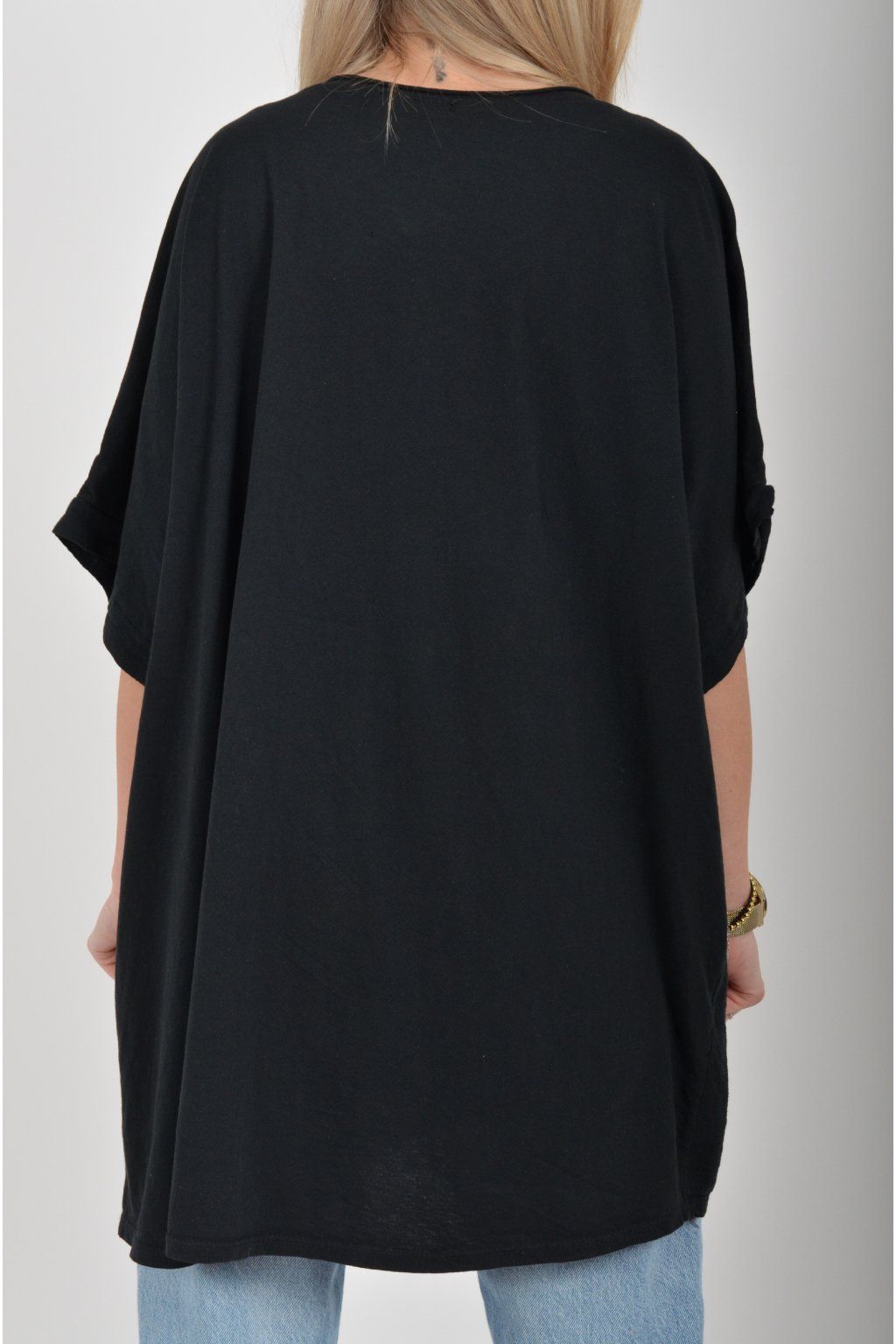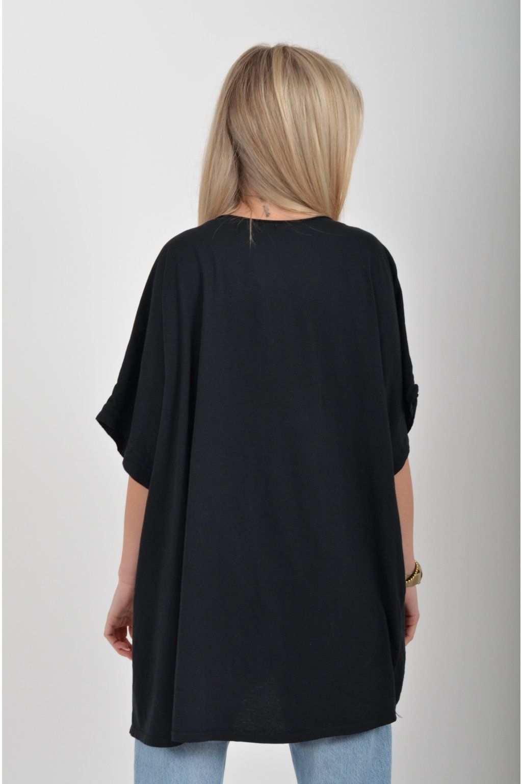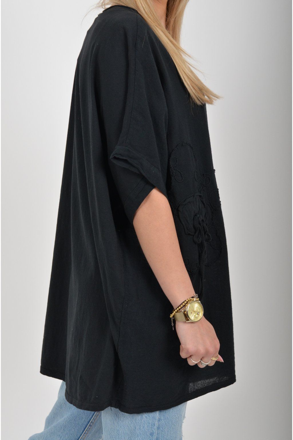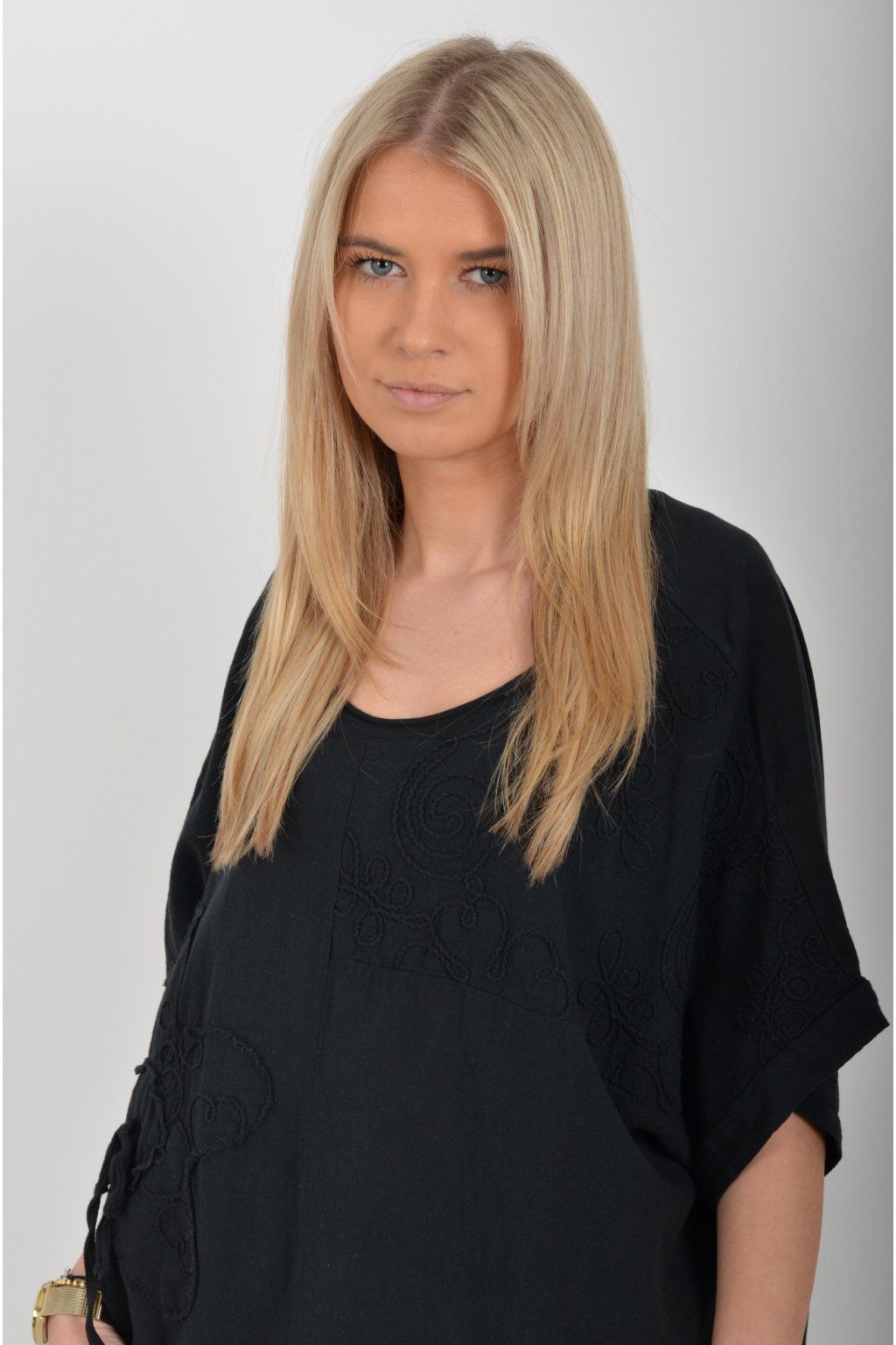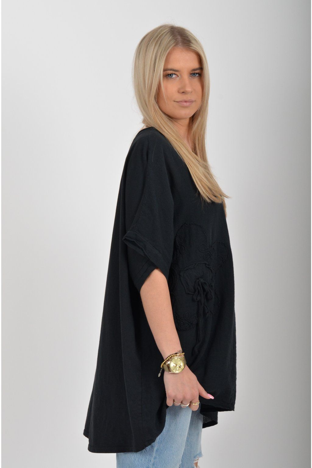 Oversize halenka s krátkým rukávem a vyšívaným vzorem vyrobená z velice příjemné bavlny. Materiál halenky je lehce pružný. Je volnějšího stylu nošení (není na tělo)