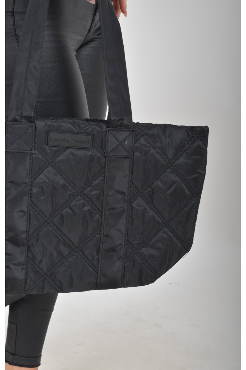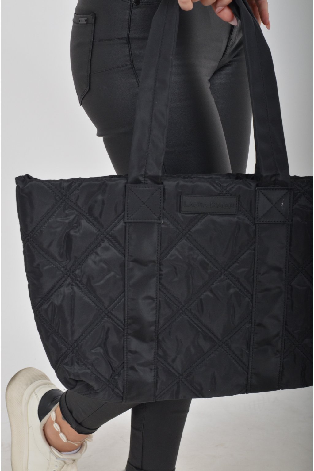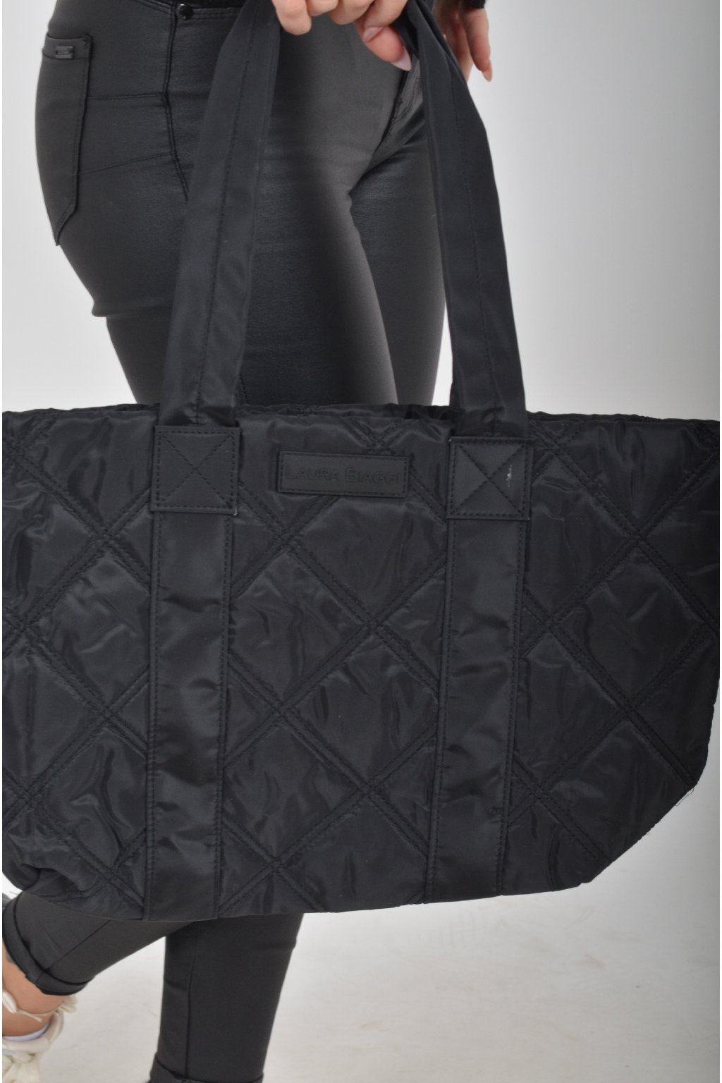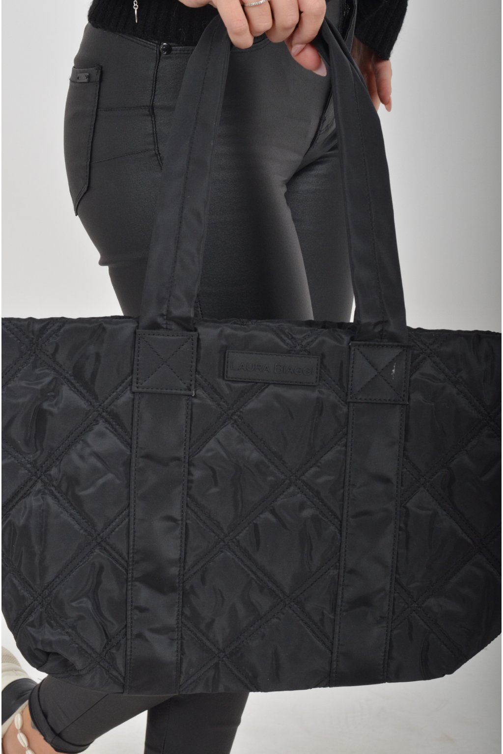 Černá kabelka přes rameno z plátěného materiálu značky Laura Biaggi. Uvnitř kabelky se nachází jedna kapsa na zip.