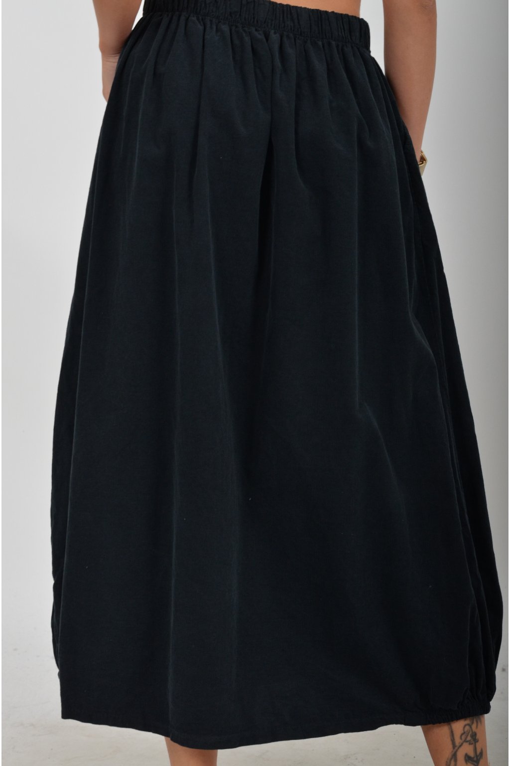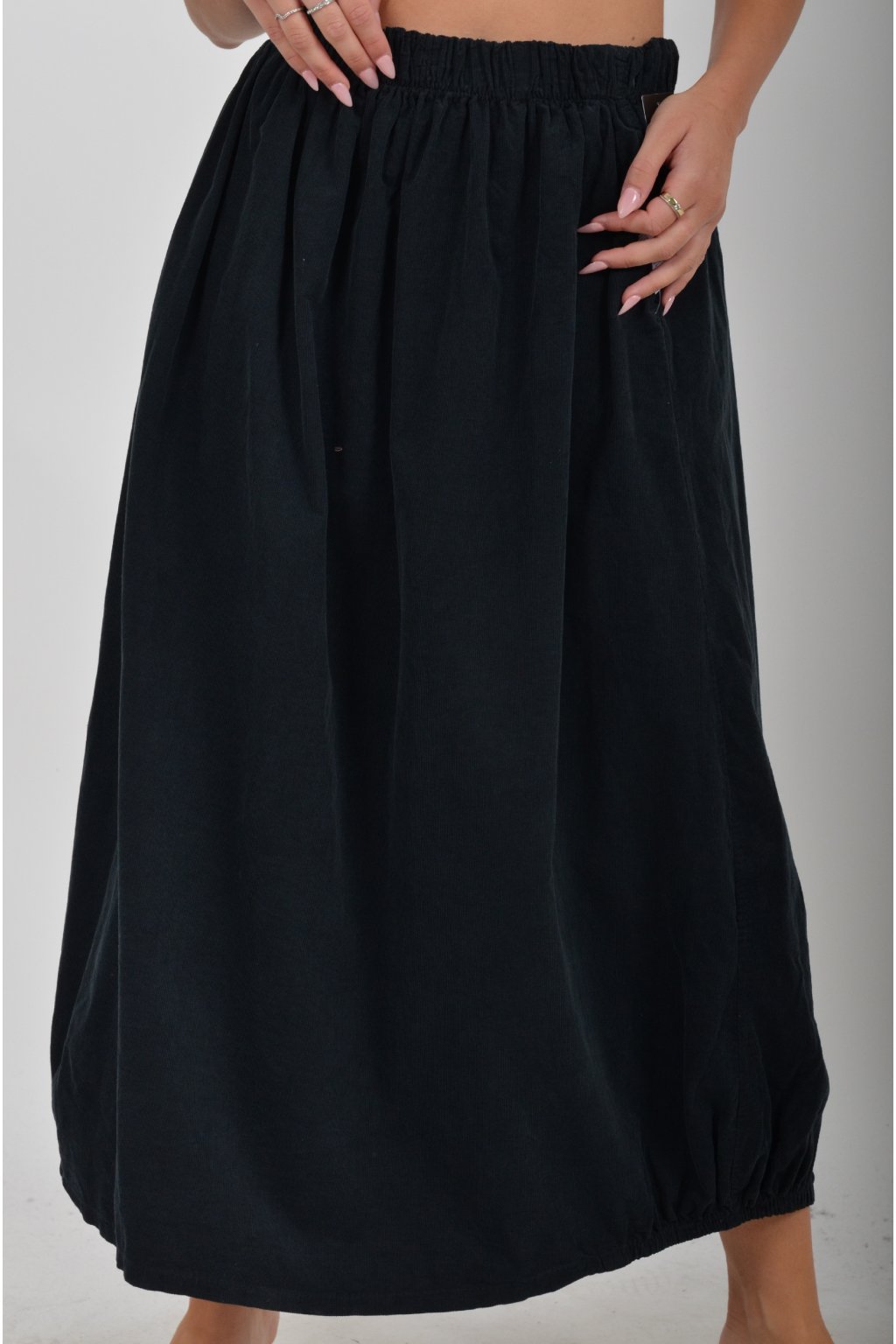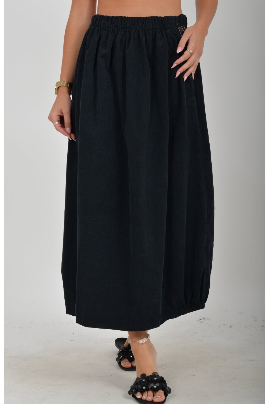 Manšestrová sukně áčkového střihu s kapsami na bocích. V pase a vespodu na bocích je zapracovaná guma. Sukně je vhodná do podzimních dní.