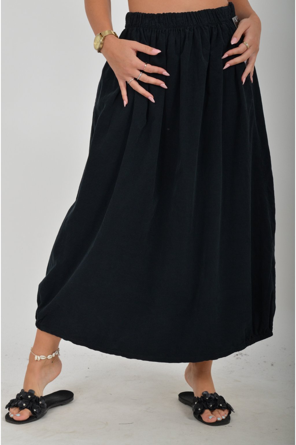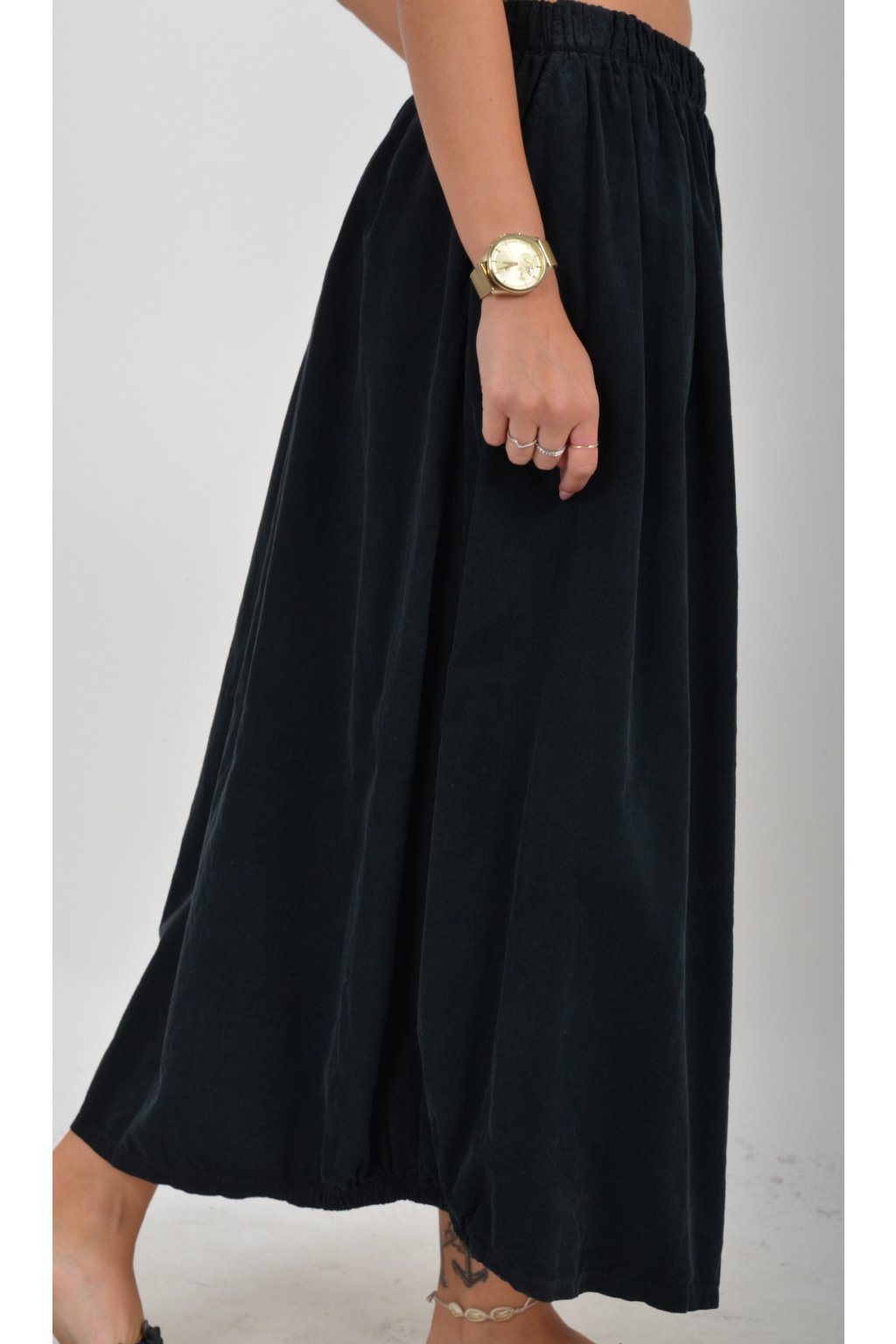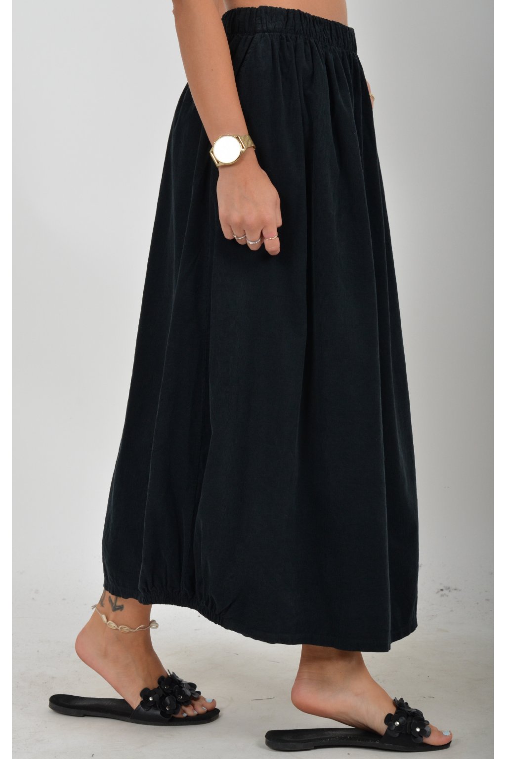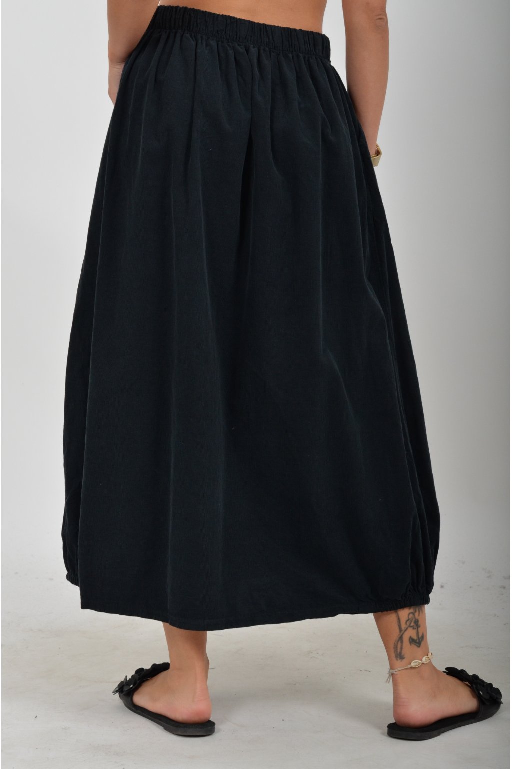 Manšestrová sukně áčkového střihu s kapsami na bocích. V pase a vespodu na bocích je zapracovaná guma. Sukně je vhodná do podzimních dní.