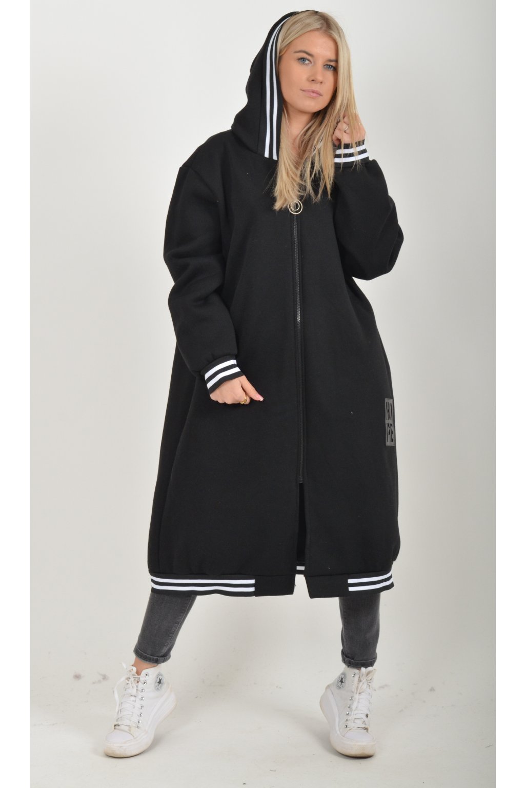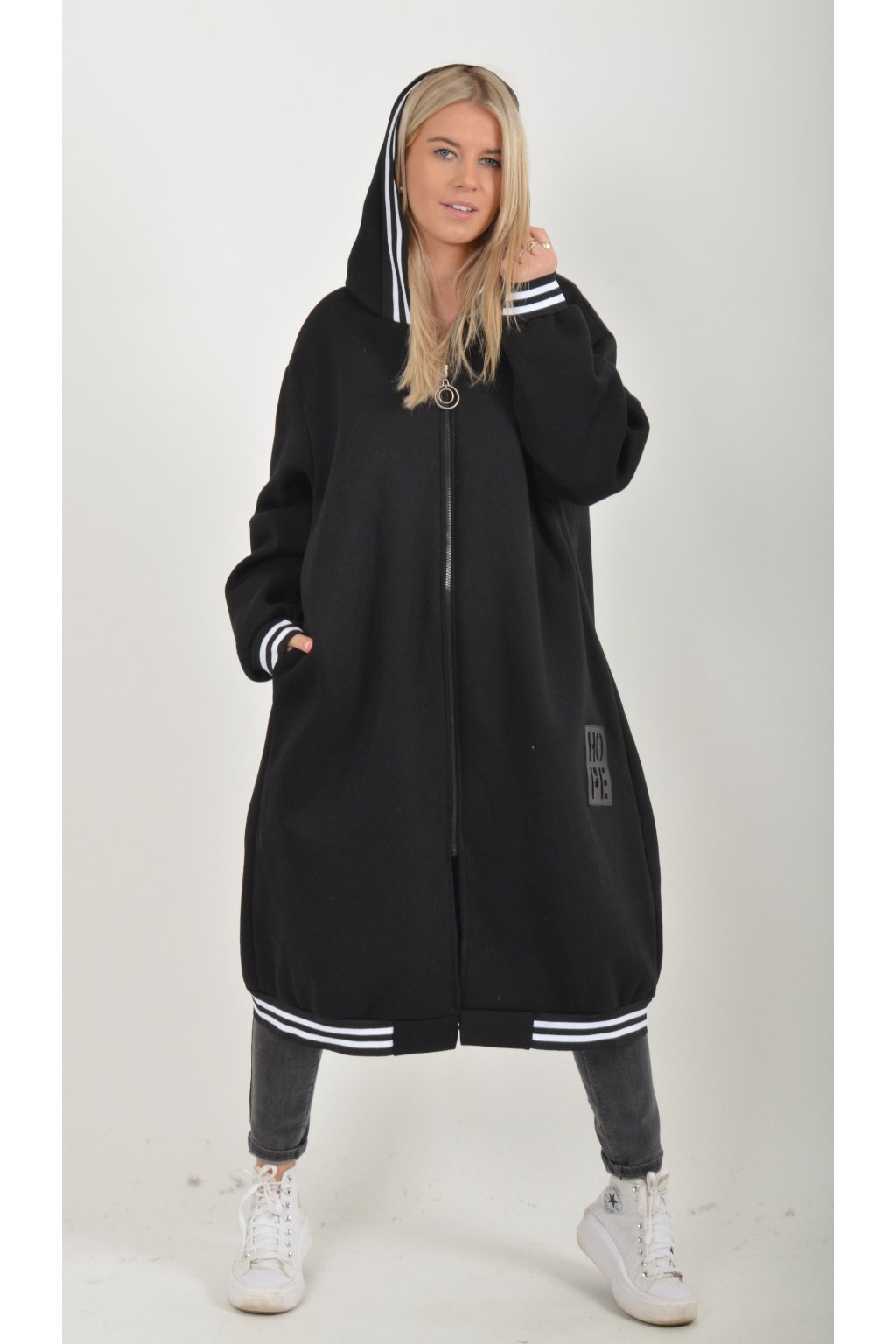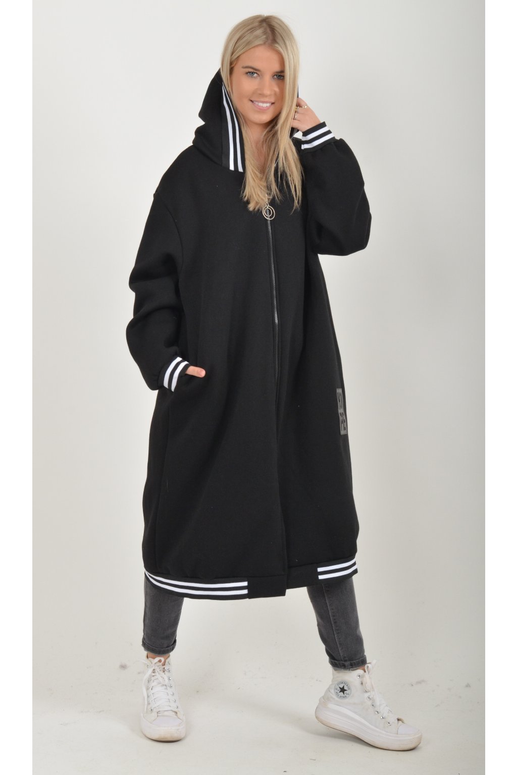 Maxi mikina s kapucí, dlouhým rukávem a kapsami na bocích. Je vyrobena z velice příjemného a kvalitního materiálu.