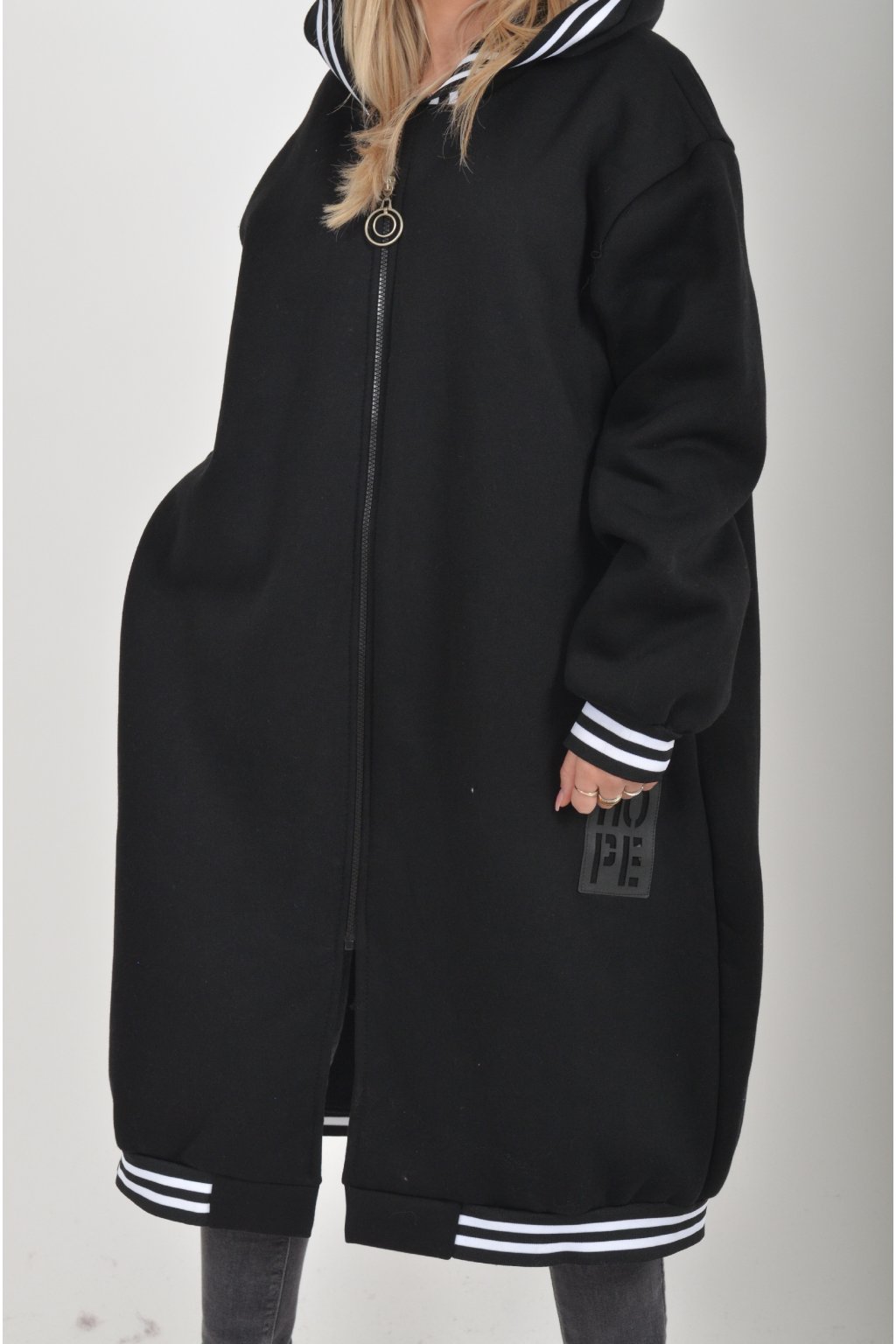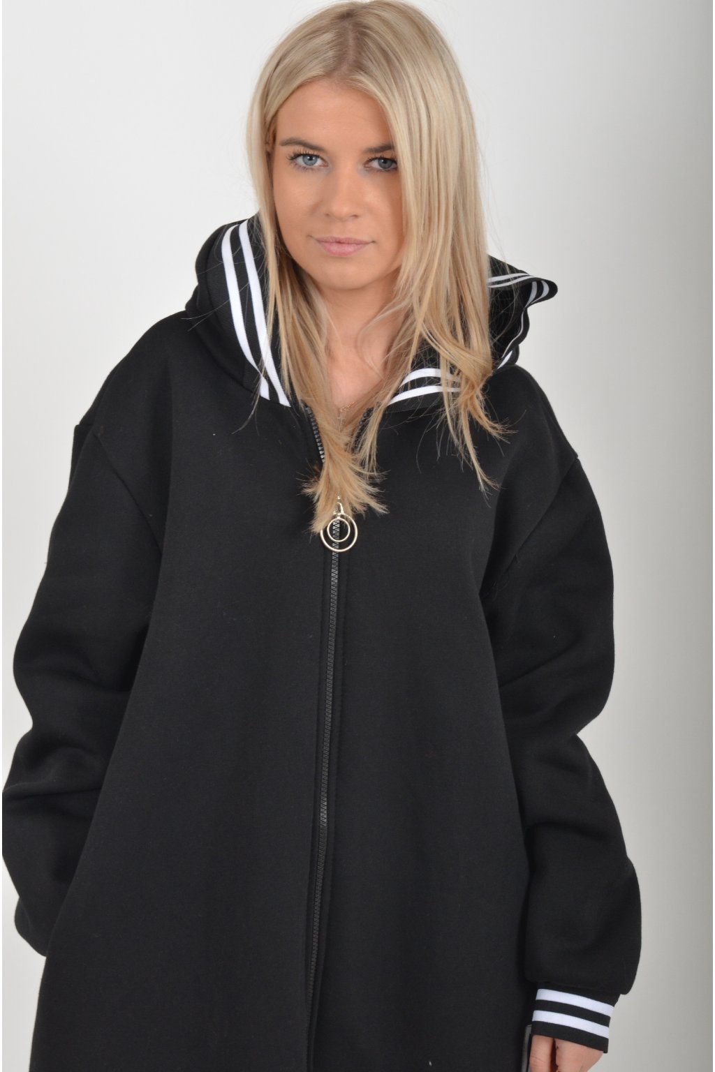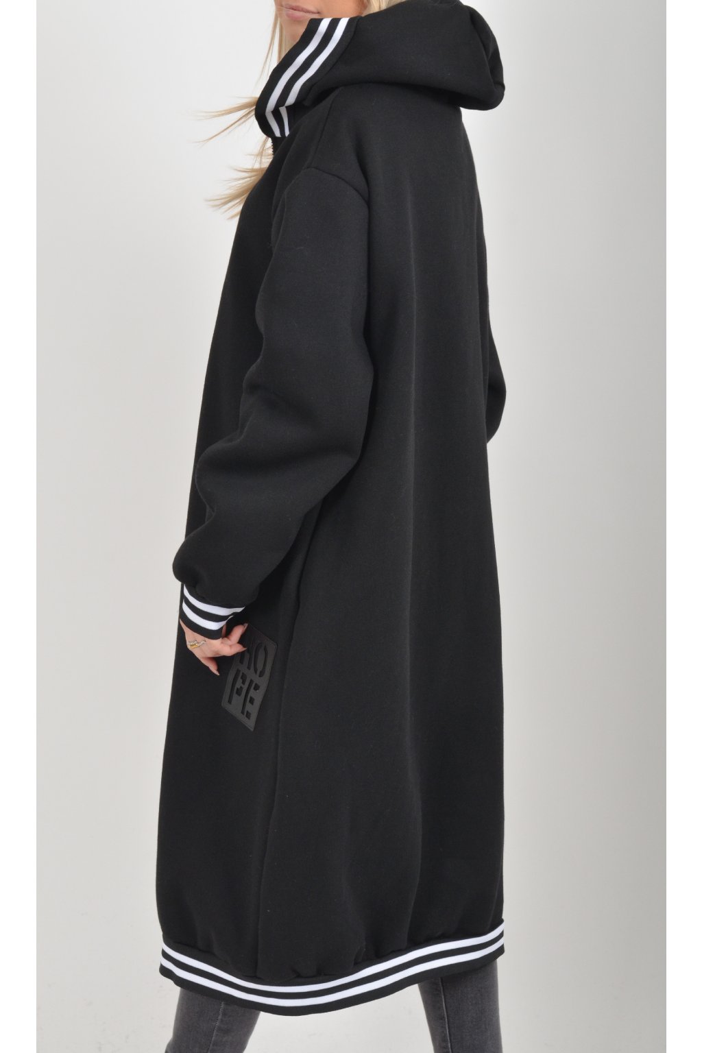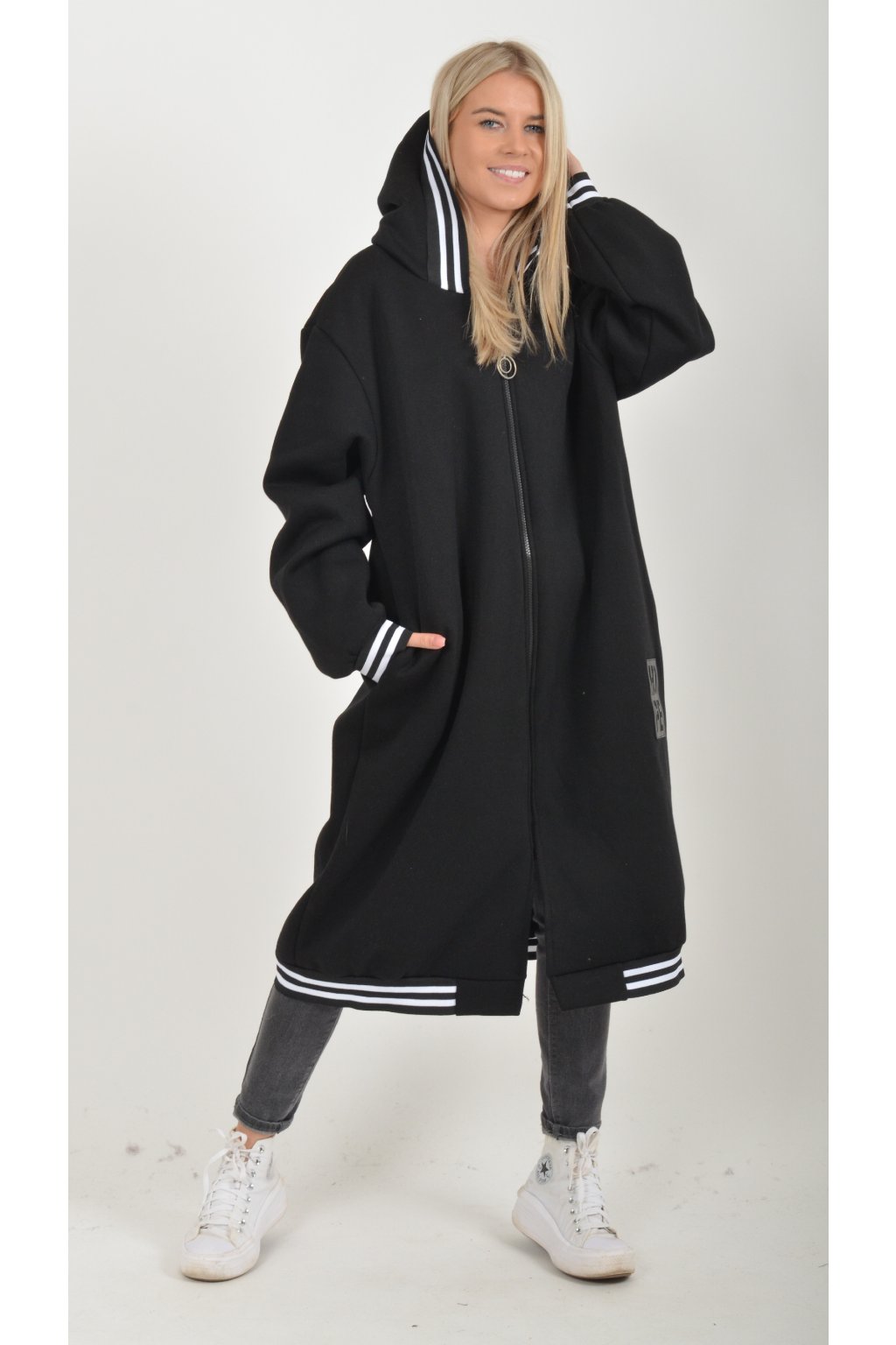 Maxi mikina s kapucí, dlouhým rukávem a kapsami na bocích. Je vyrobena z velice příjemného a kvalitního materiálu.