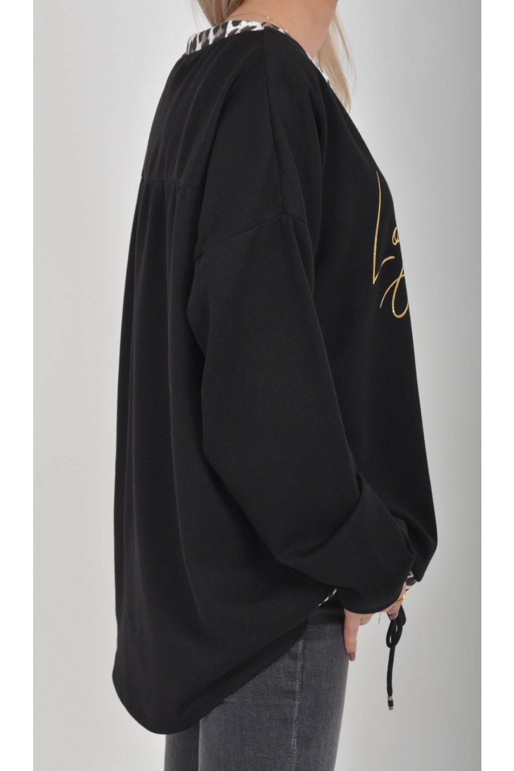 Mikina s potiskem a vzorovanými lemy. Je vyrobena z velice příjemného materiálu na dotek. Ve spodní části má zapracovanou tkaničku, která slouží k libovolnému stažení. Hodí se jak k džínům, tak i k legínám. Heboučký materiál zaručí příjemně strávený den.