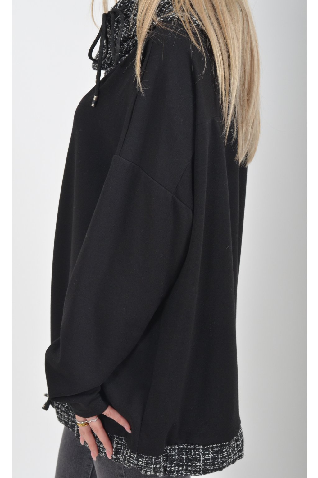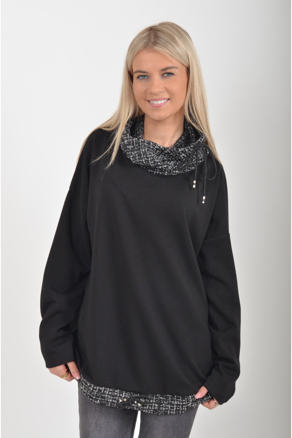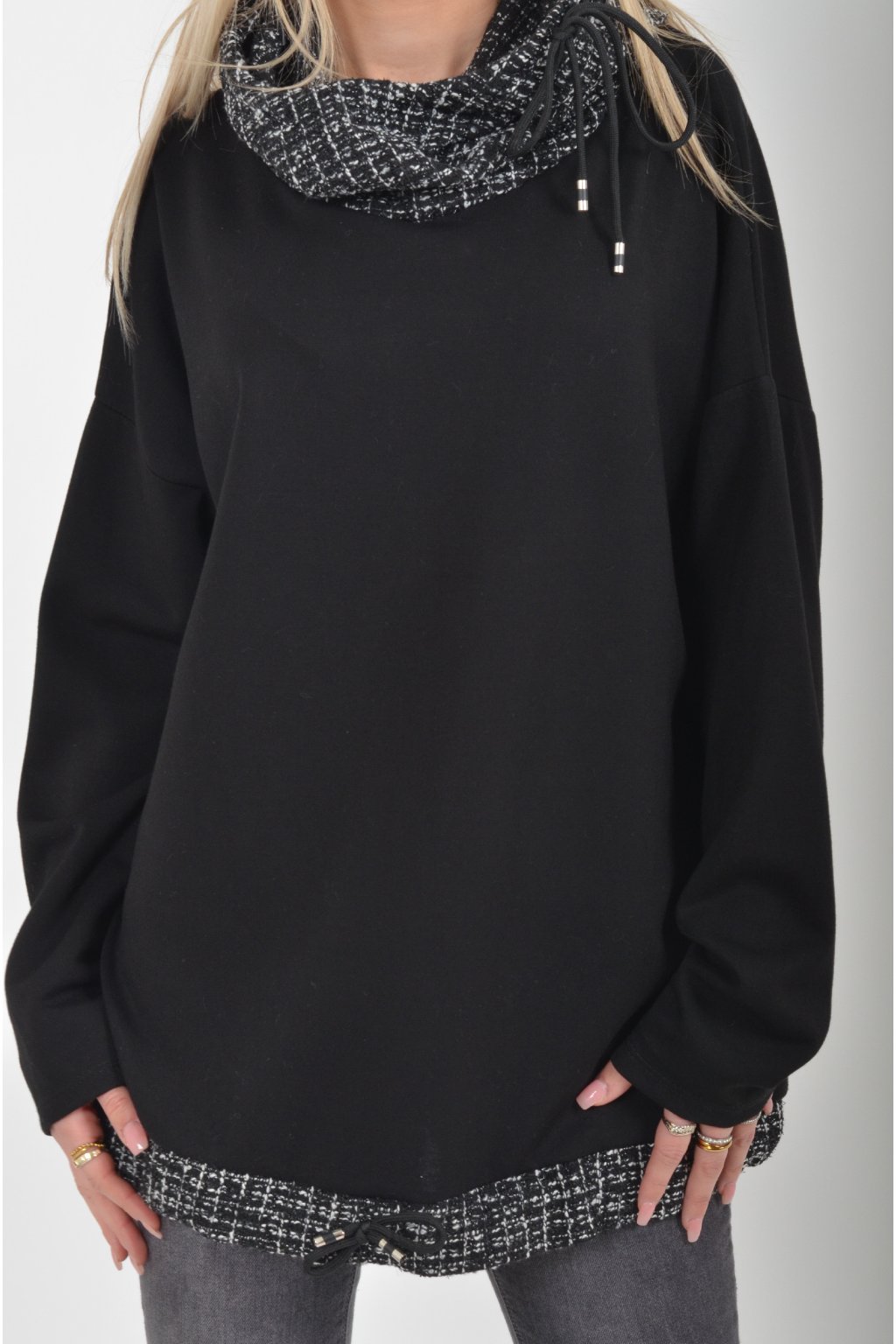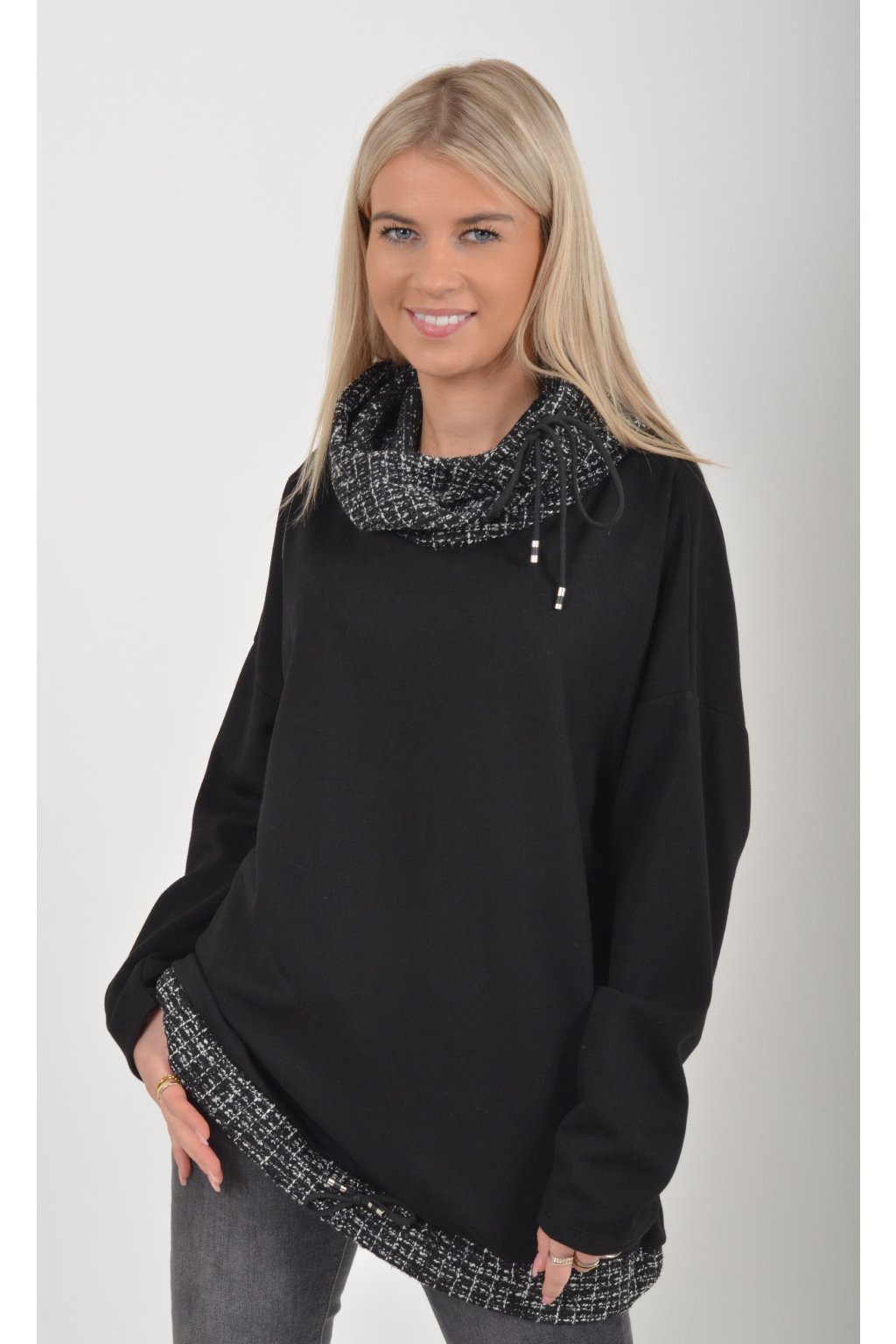 Stylová mikina s ozdobnými lemem a kapucí. Je vyrobena z velice příjemného materiálu na dotek. Ve spodní části má zapracovanou tkaničku, která slouží k libovolnému stažení. Hodí se jak k džínům, tak i k legínám. Heboučký materiál zaručí příjemně strávený den.