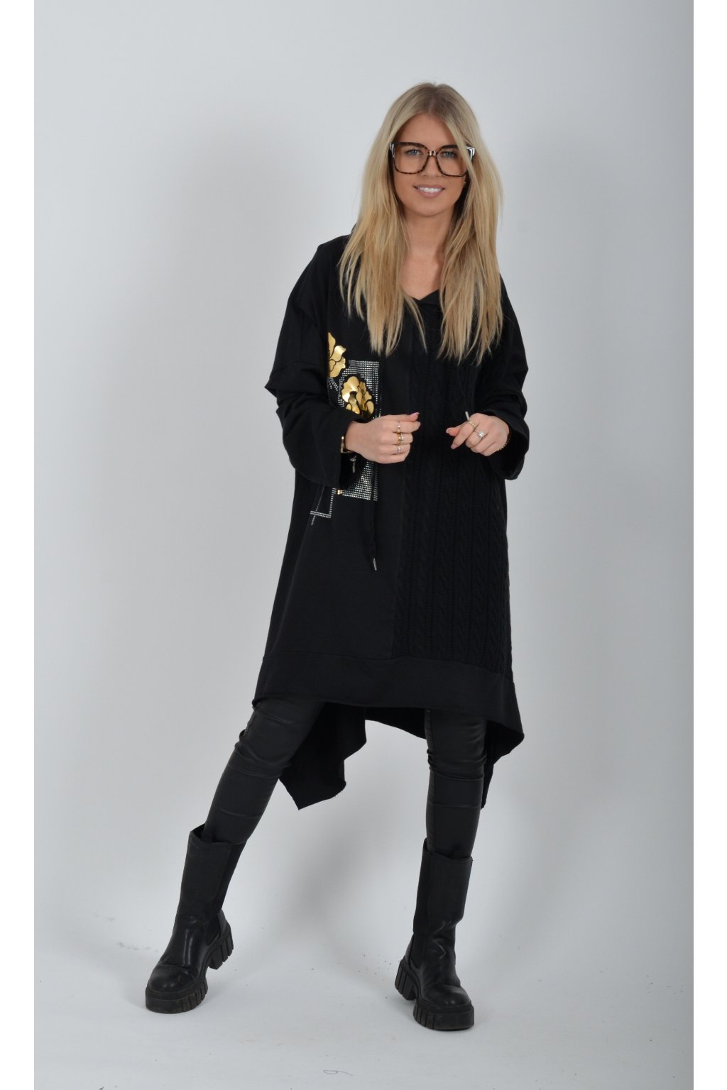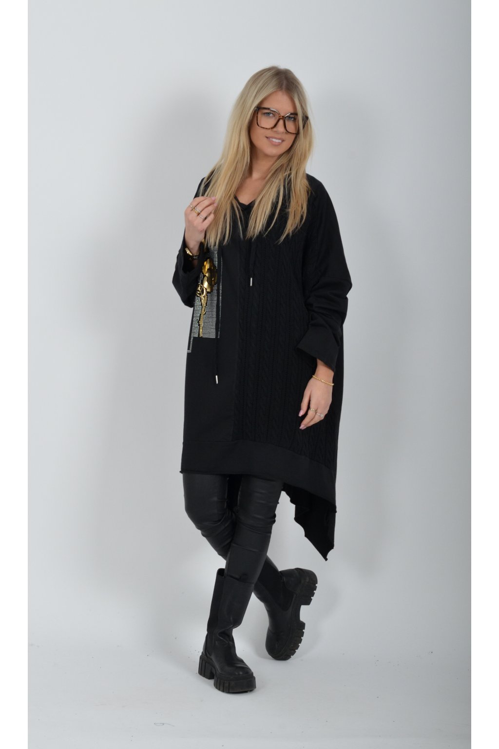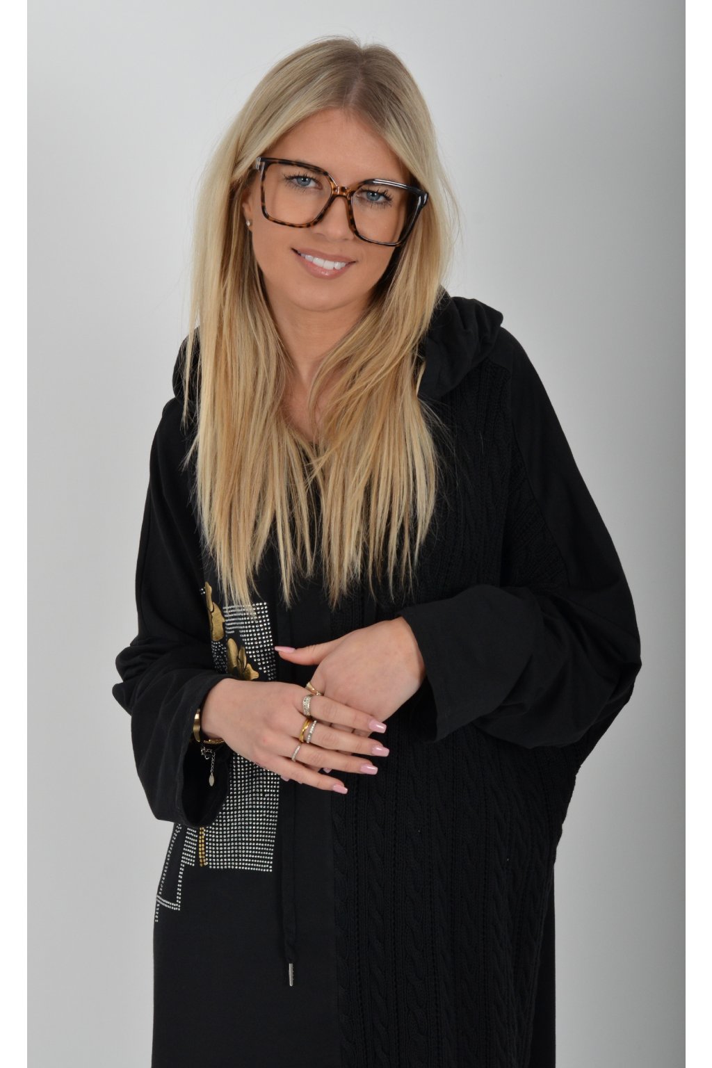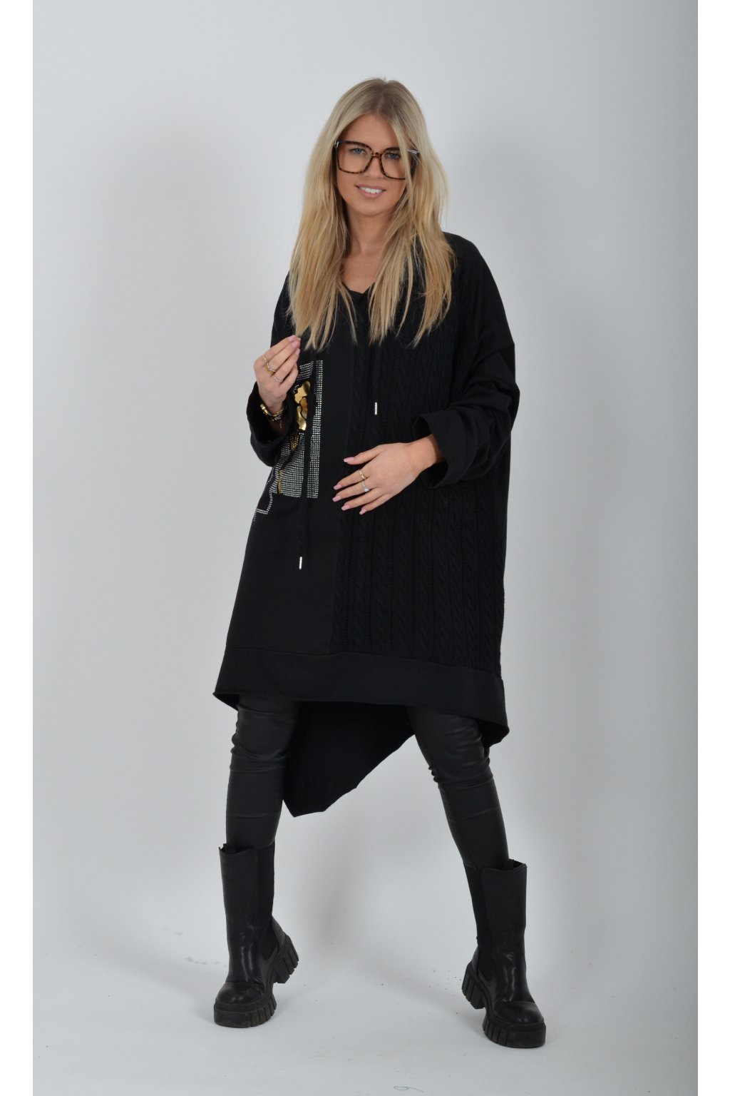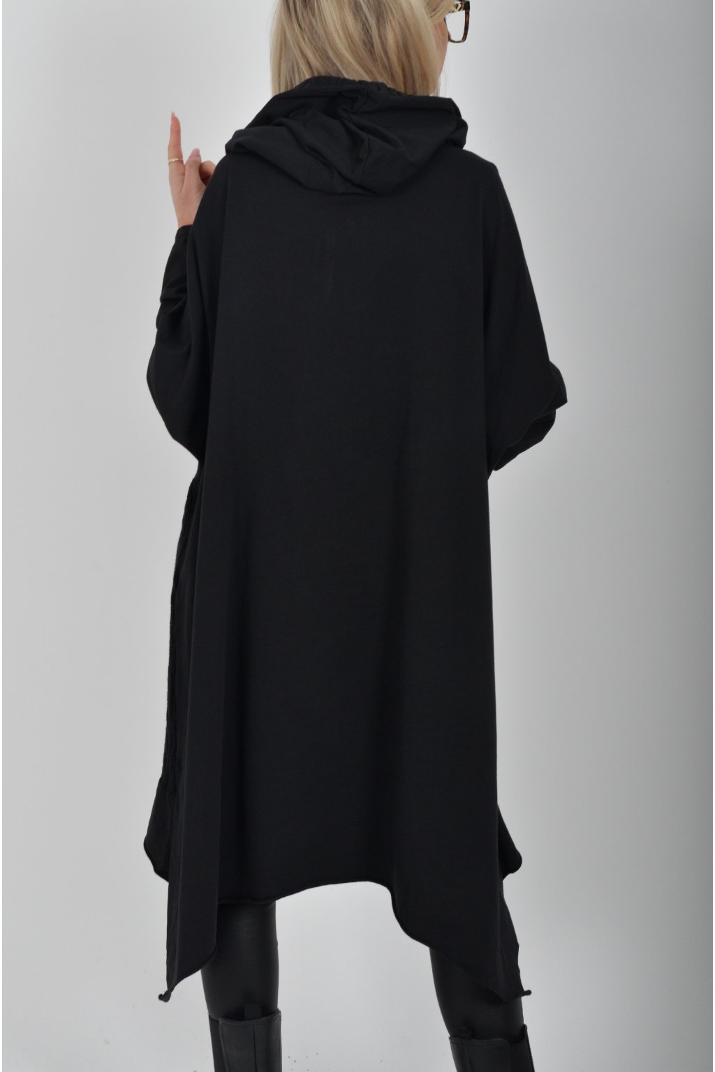 Volnější tunika áčkového střihu s materiálovou kombinací příjemné bavlny a pleteniny. Tunika má dlouhý rukáv a kapuci. Je vhodná jak k džínům, tak i legínám.
