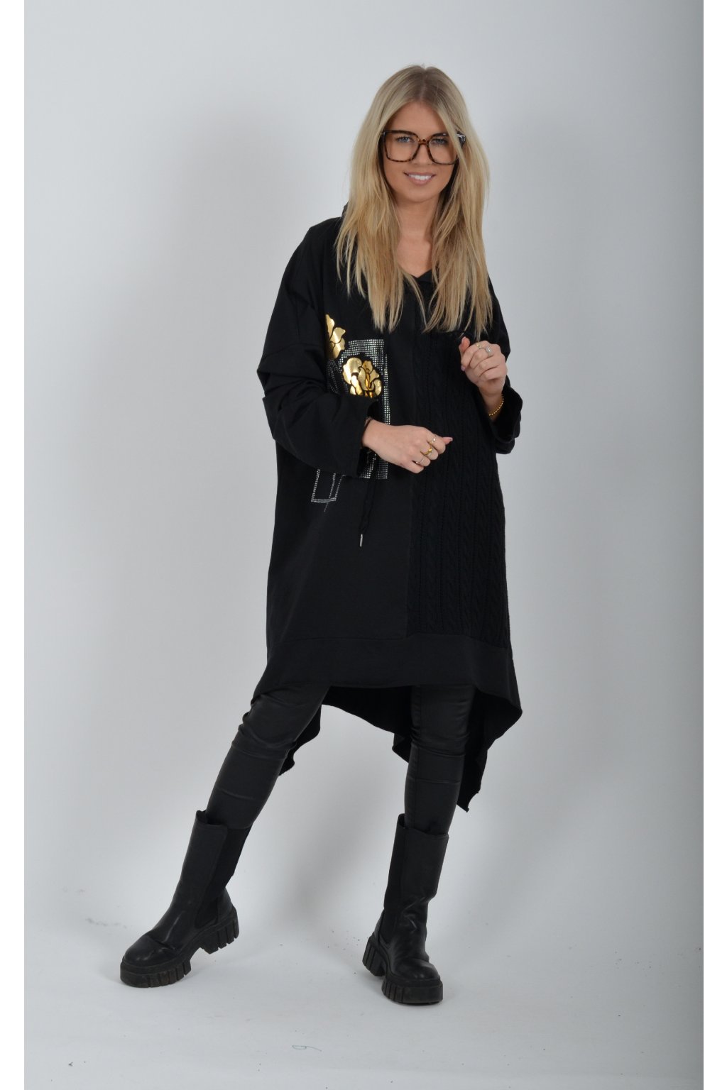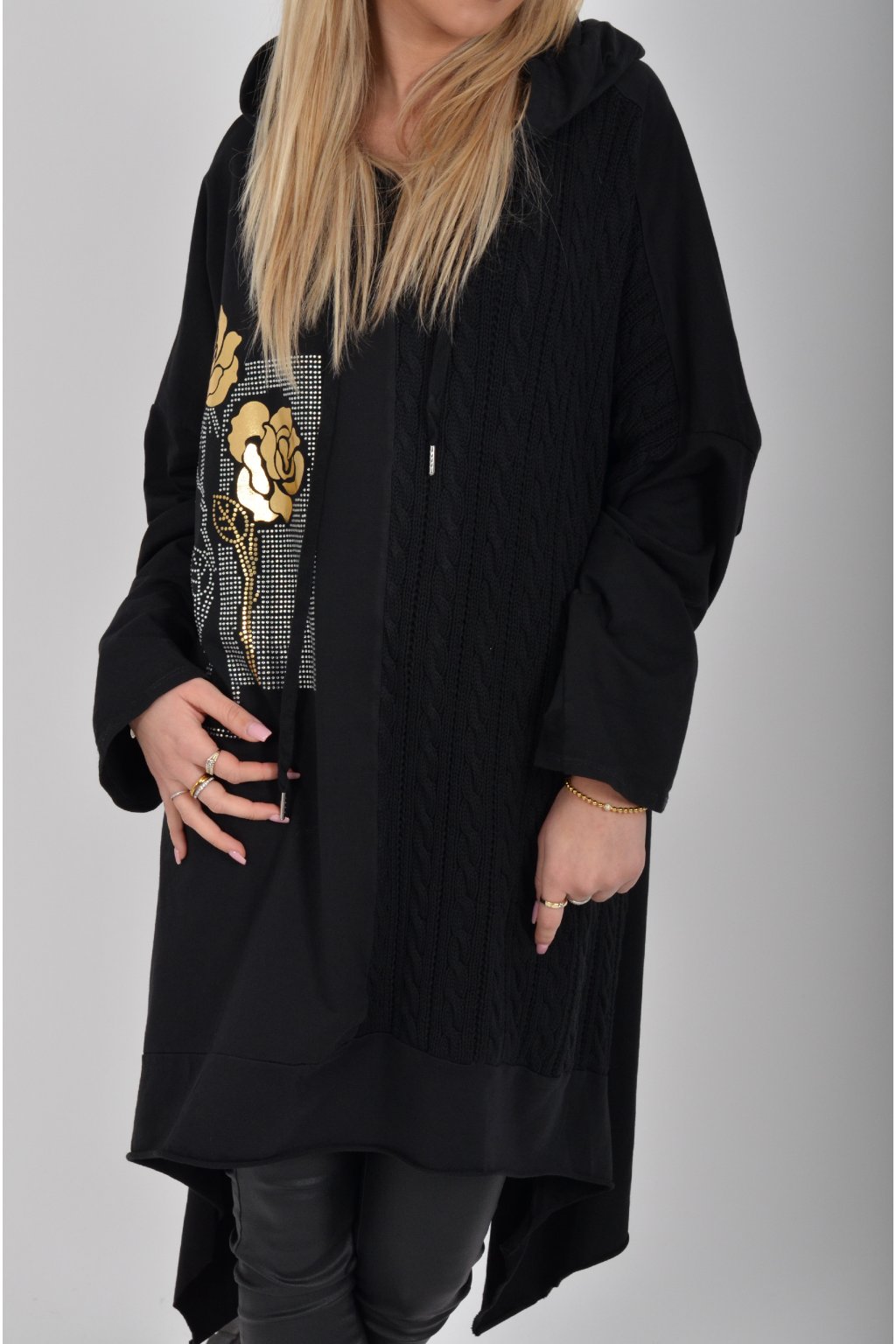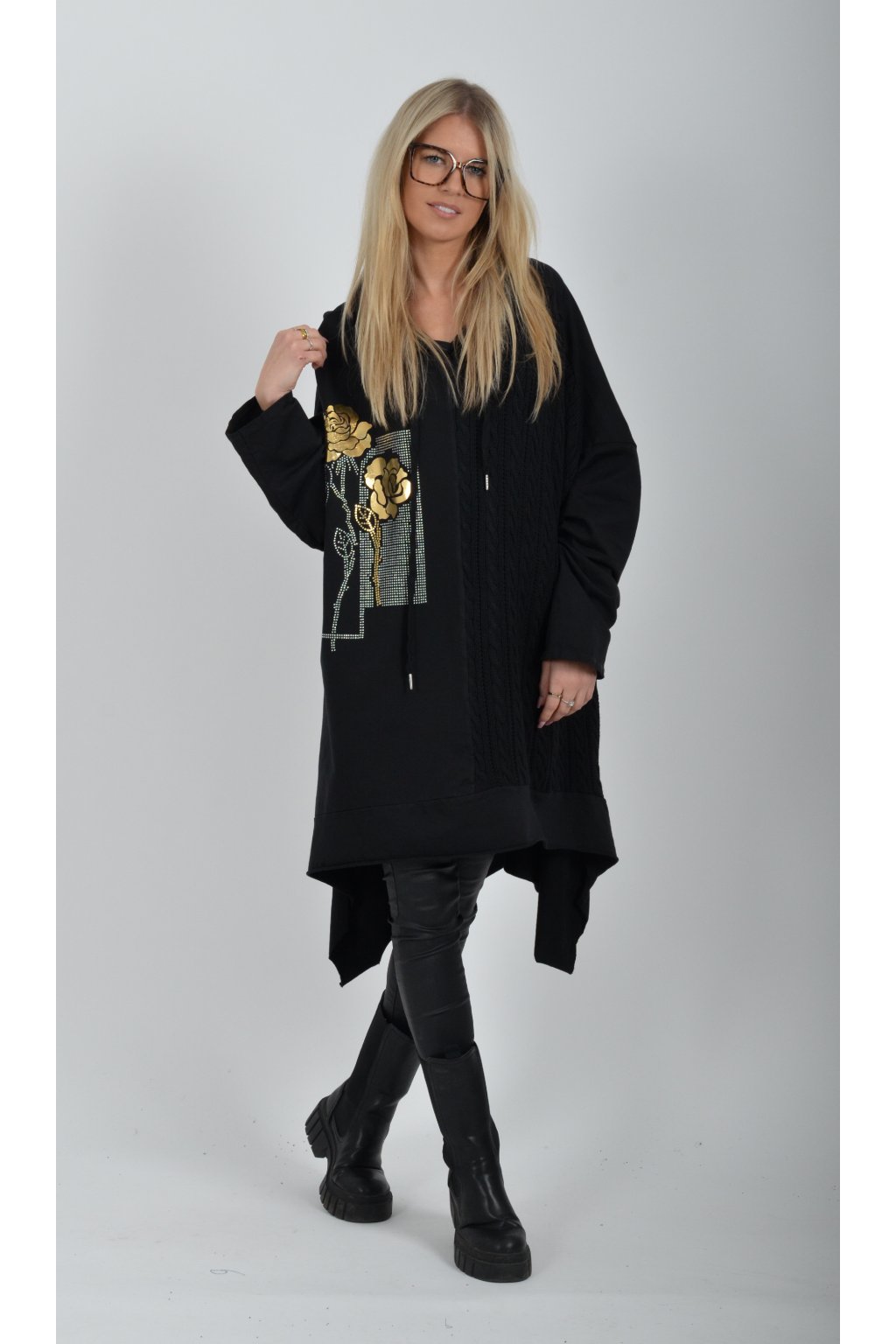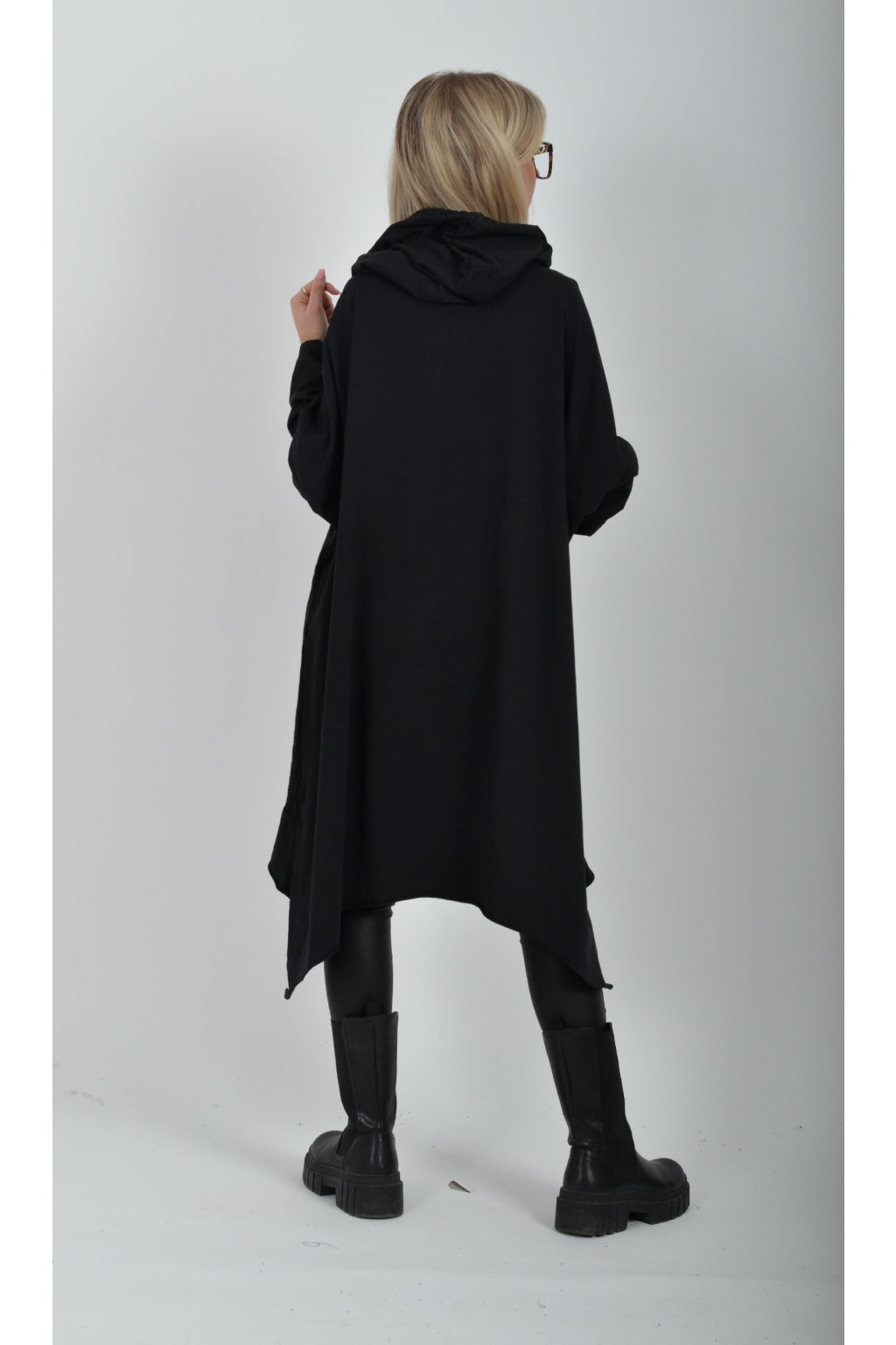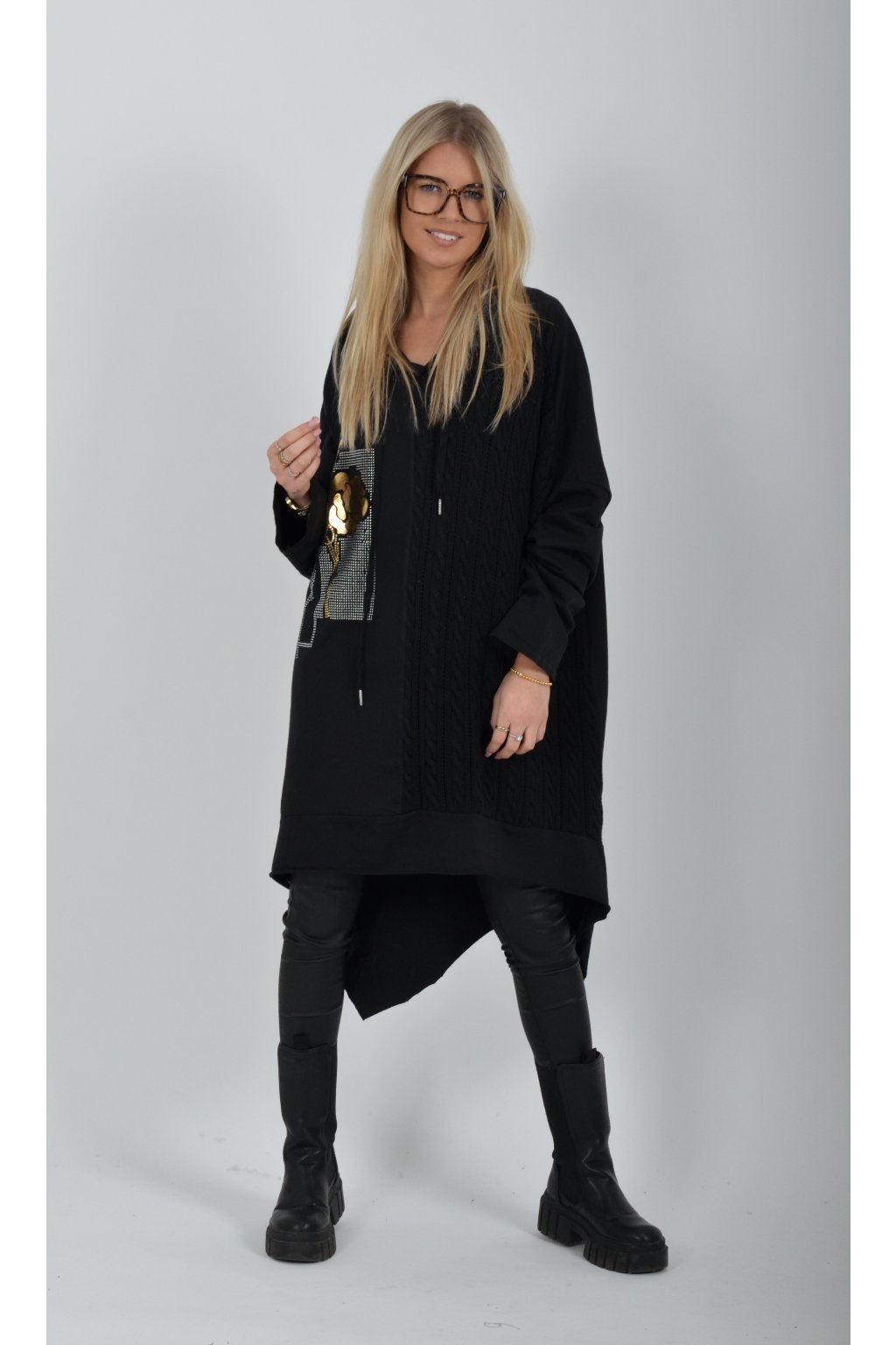Volnější tunika áčkového střihu s materiálovou kombinací příjemné bavlny a pleteniny. Tunika má dlouhý rukáv a kapuci. Je vhodná jak k džínům, tak i legínám.