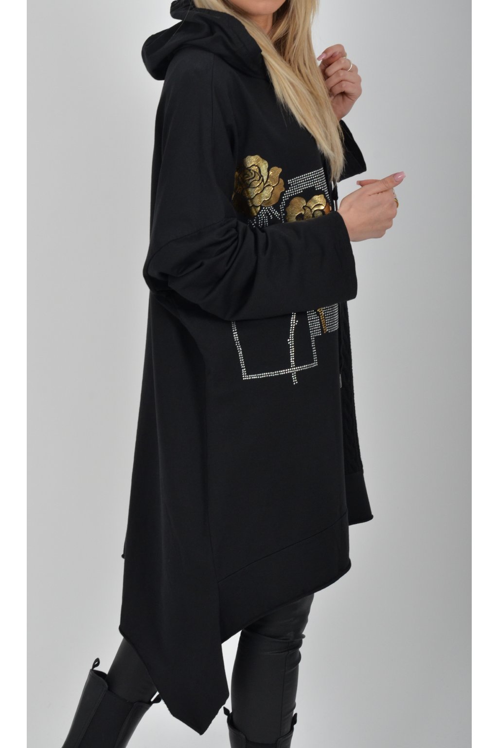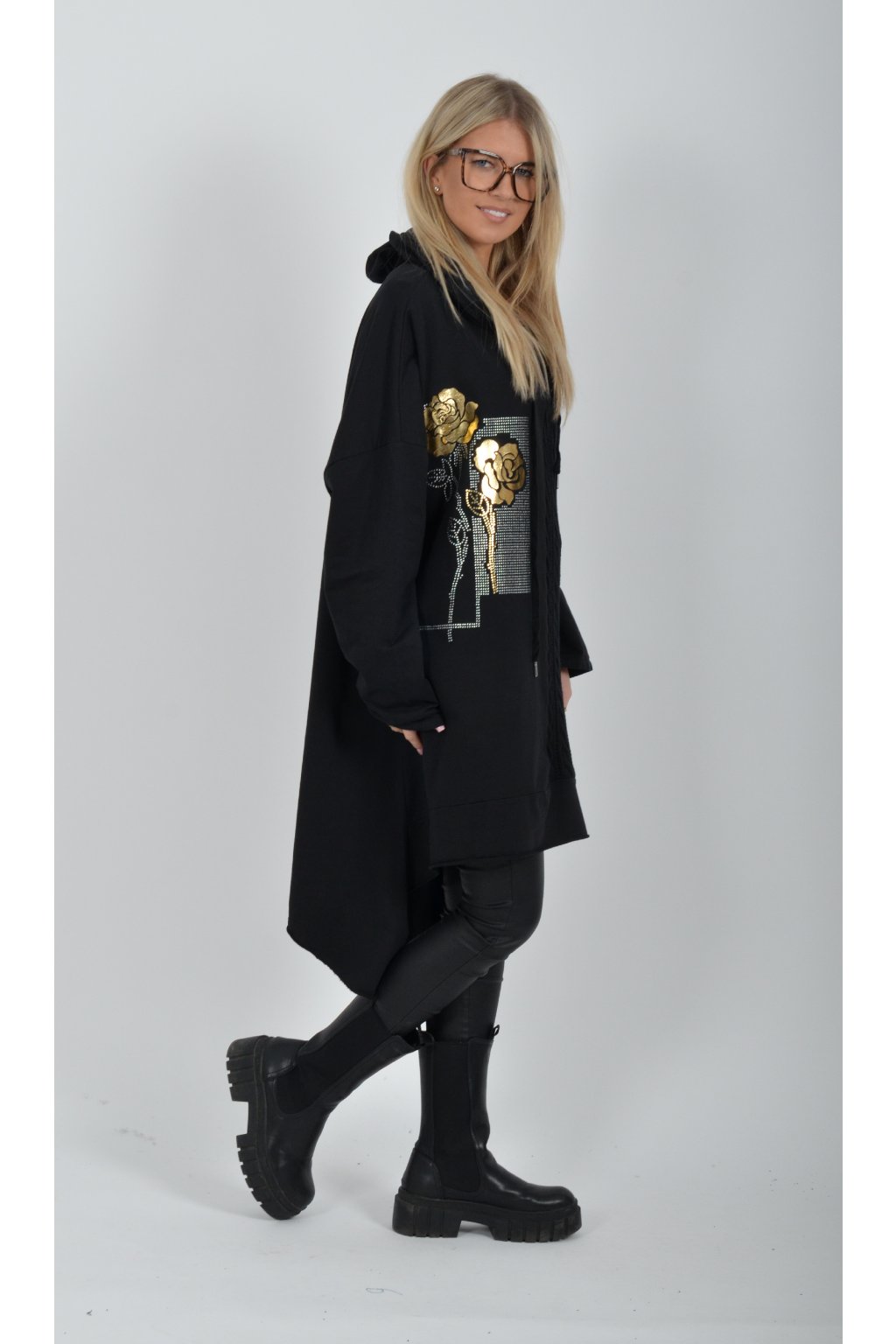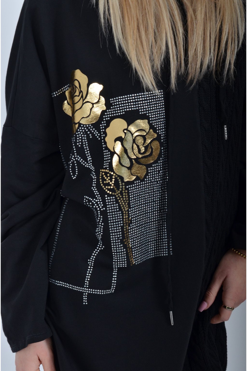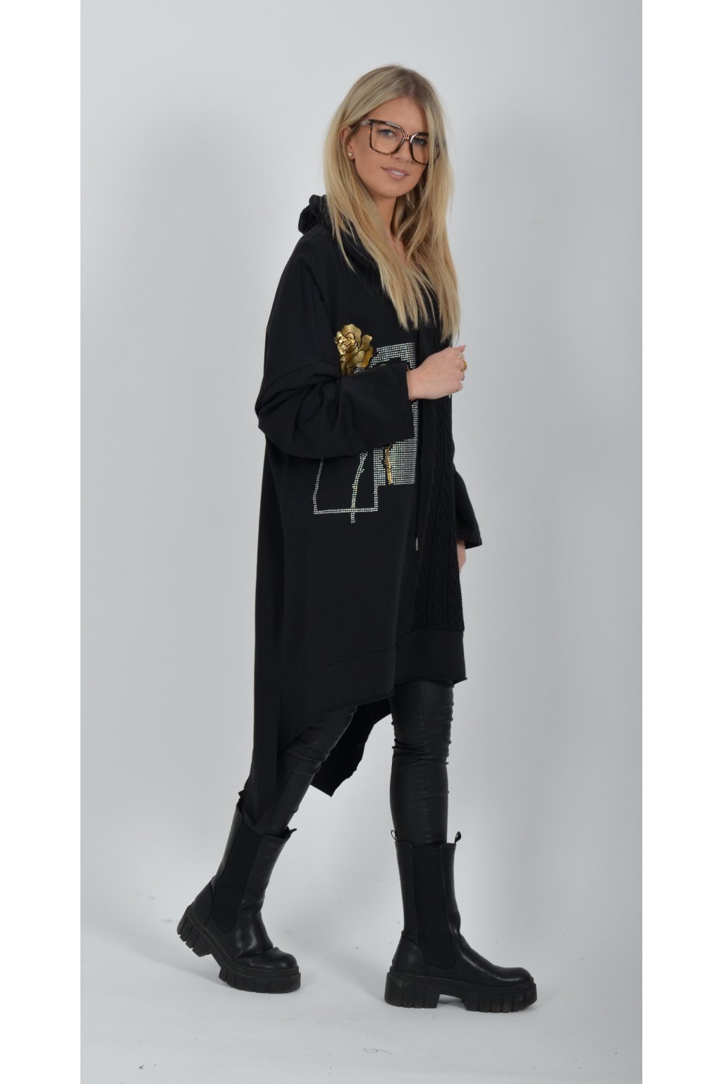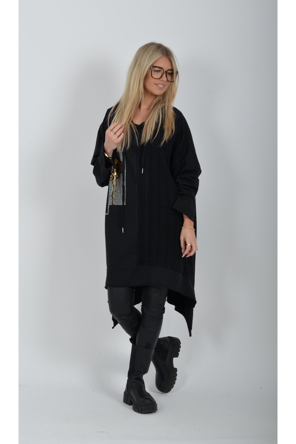 Volnější tunika áčkového střihu s materiálovou kombinací příjemné bavlny a pleteniny. Tunika má dlouhý rukáv a kapuci. Je vhodná jak k džínům, tak i legínám.