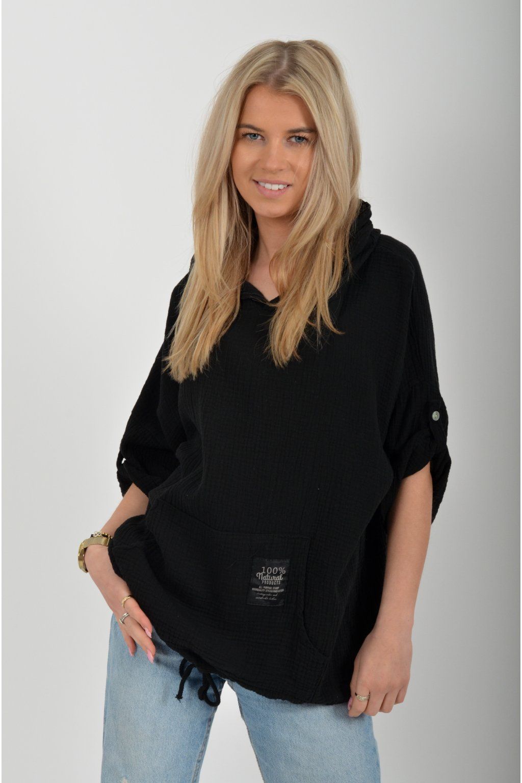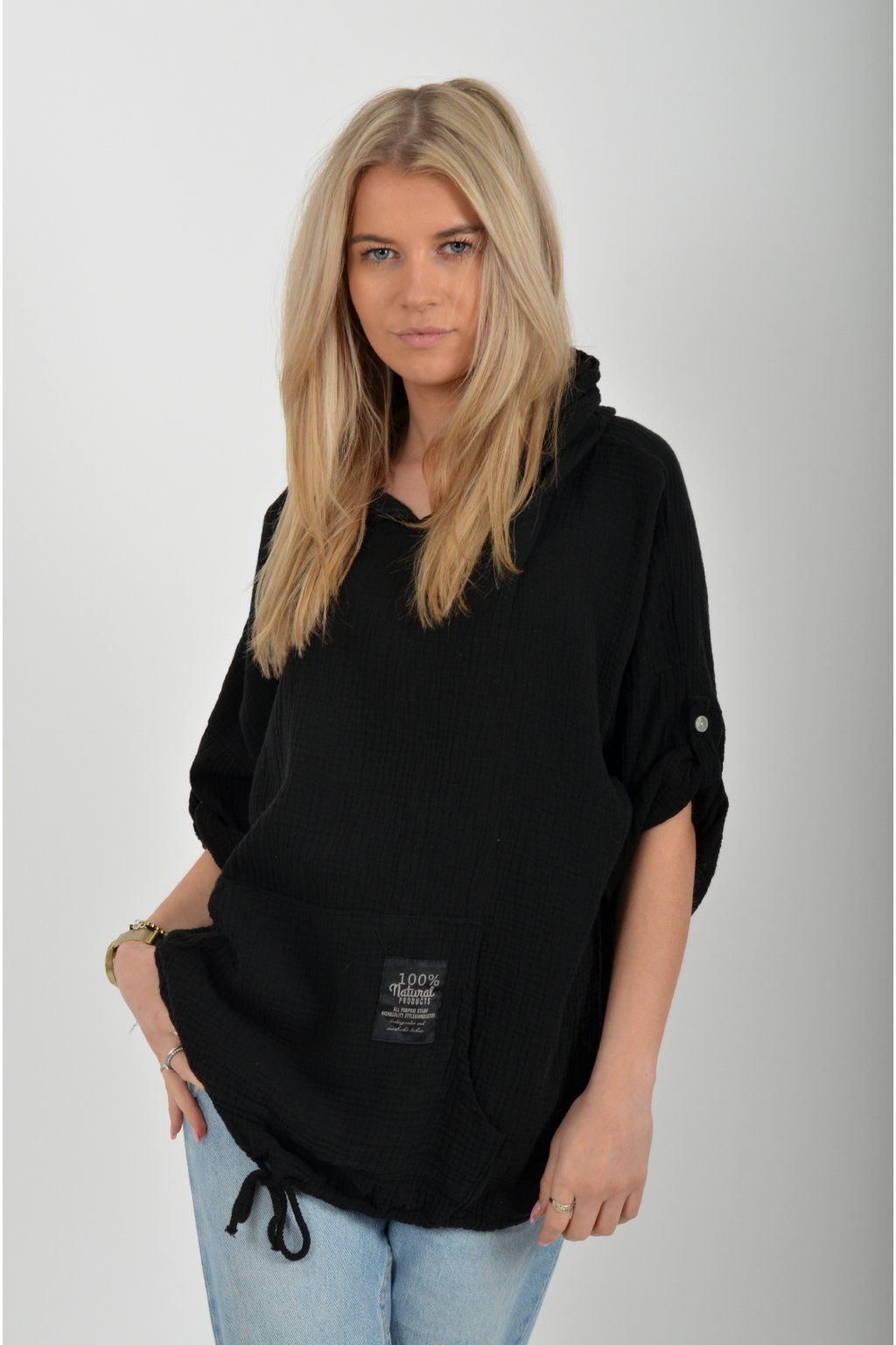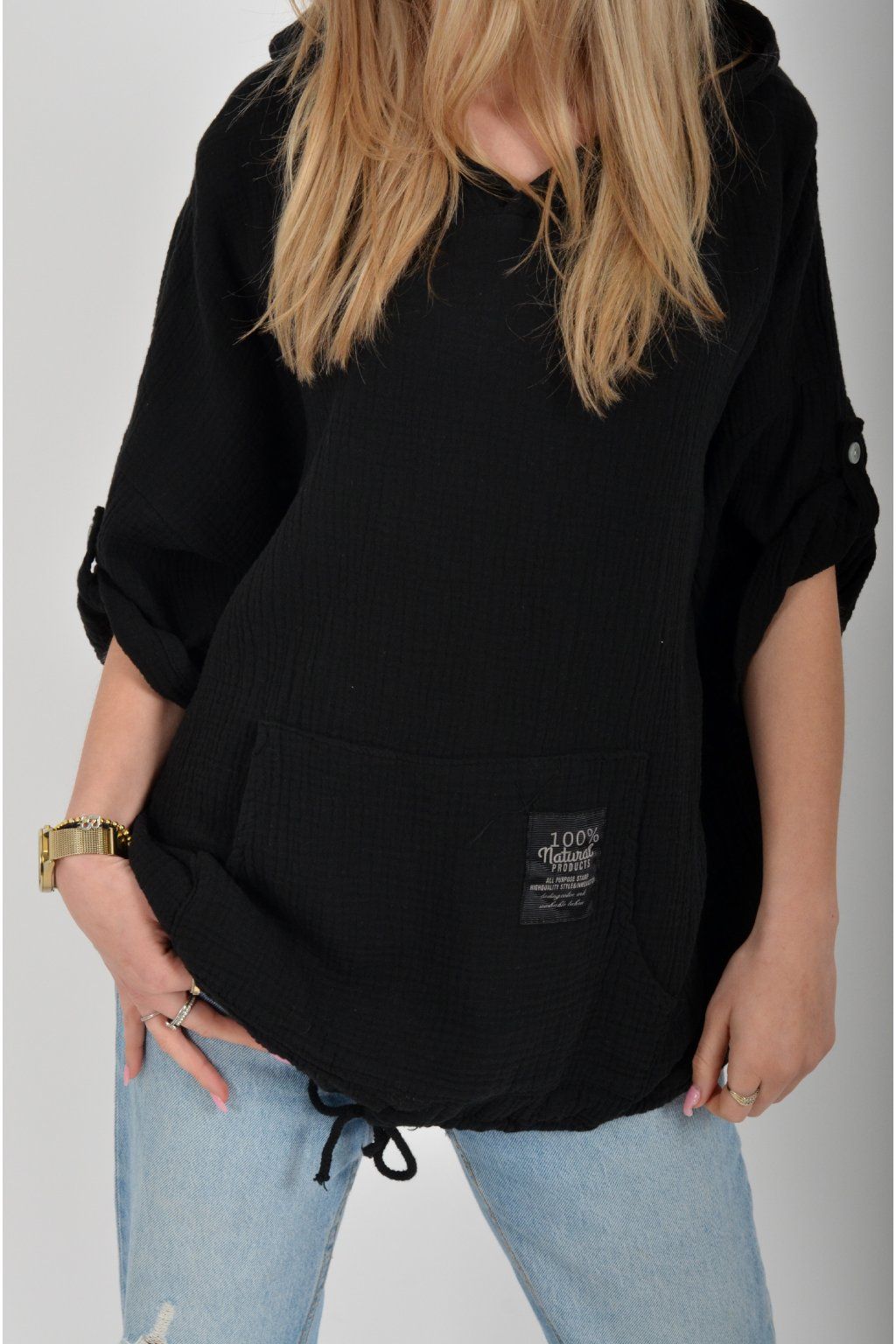 Mikina vyrobená z velice příjemného mušelínu. Mikina má kapuci a klokaní kapsu. Rukáv je 3/4 a lze pomocí knoflíku jednoduše zkrátit. Ve spodní části mikiny je zapracovaná tkanice pro libovolné stažení.