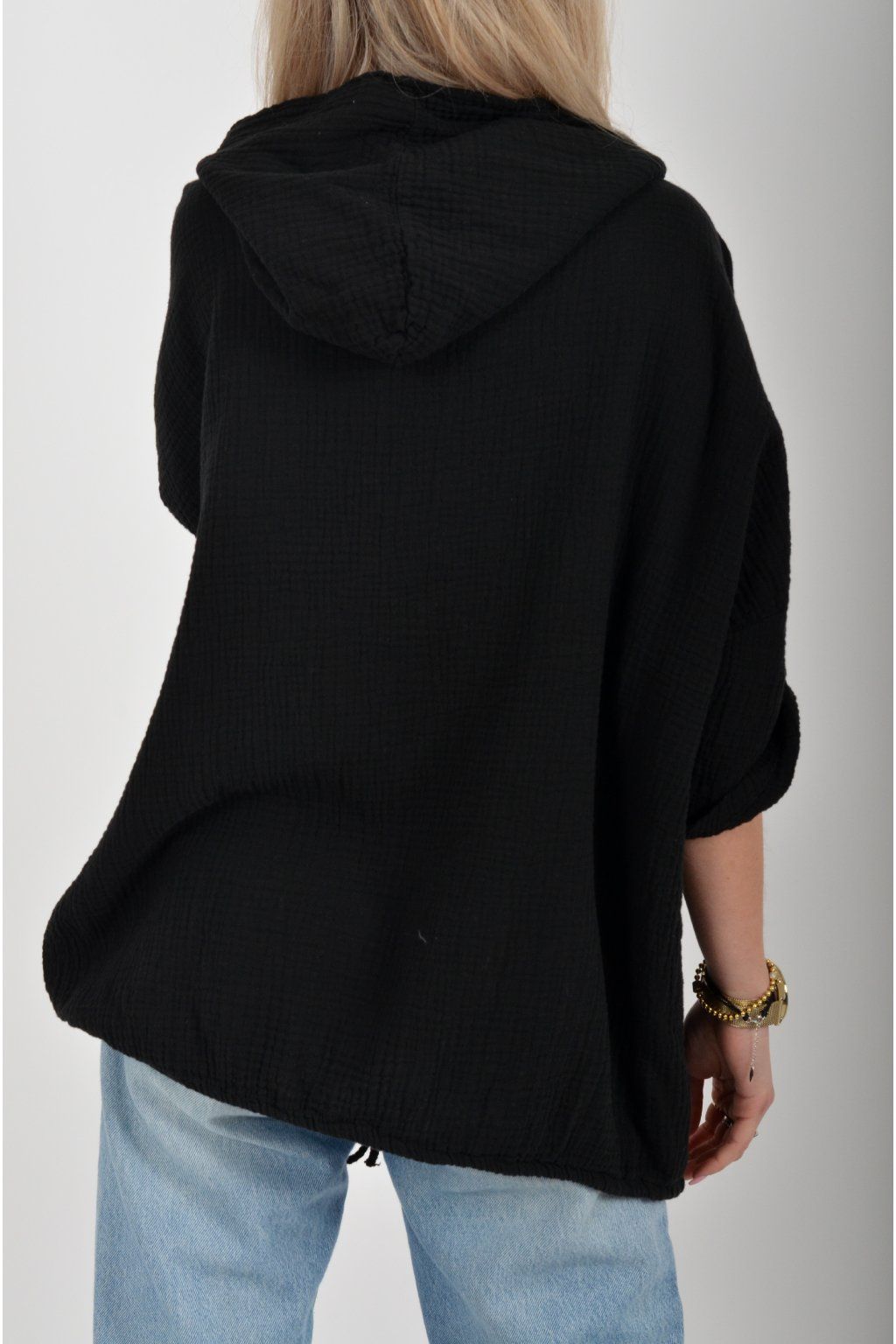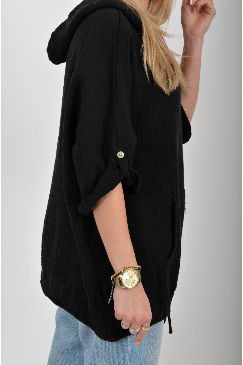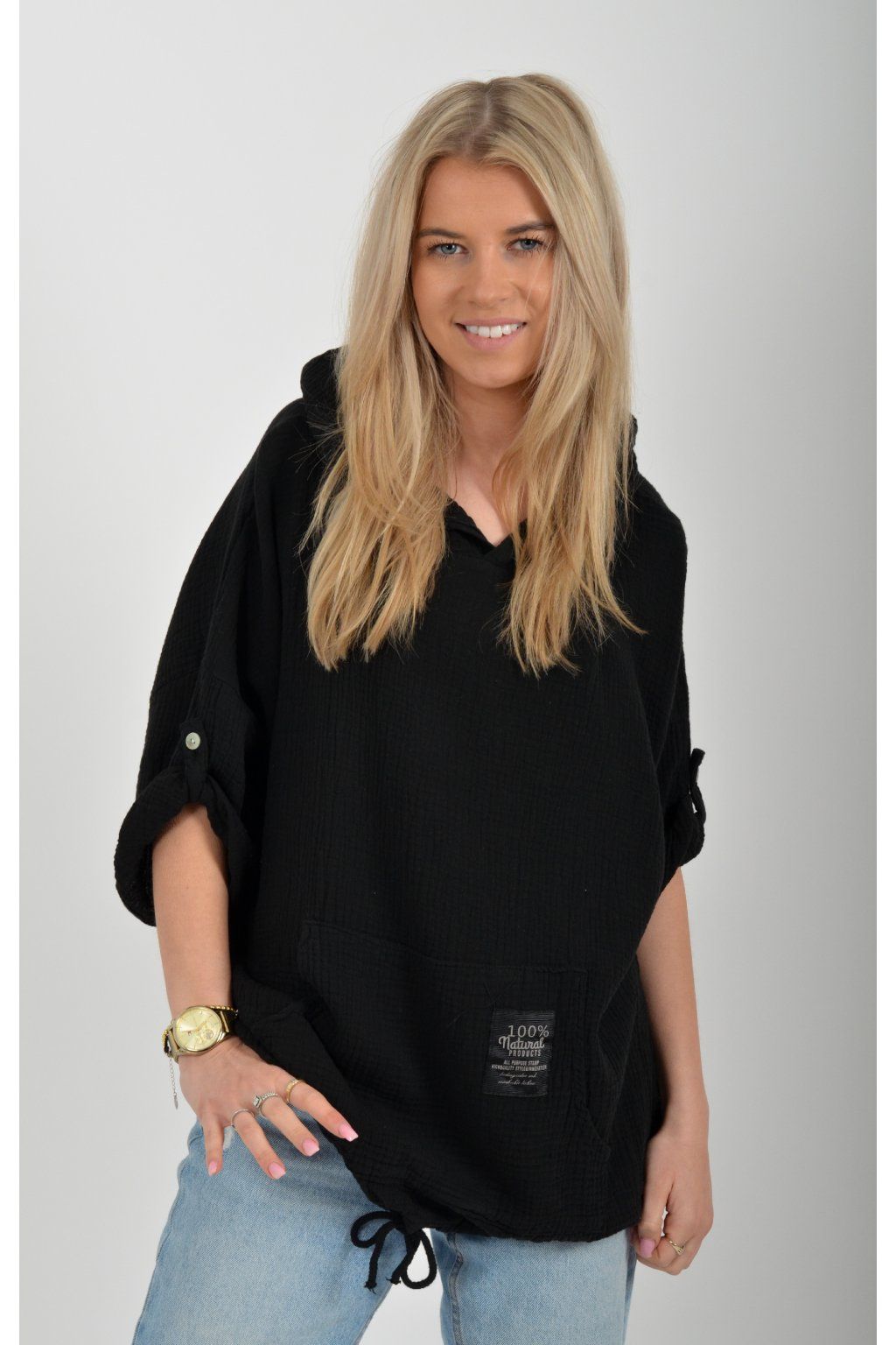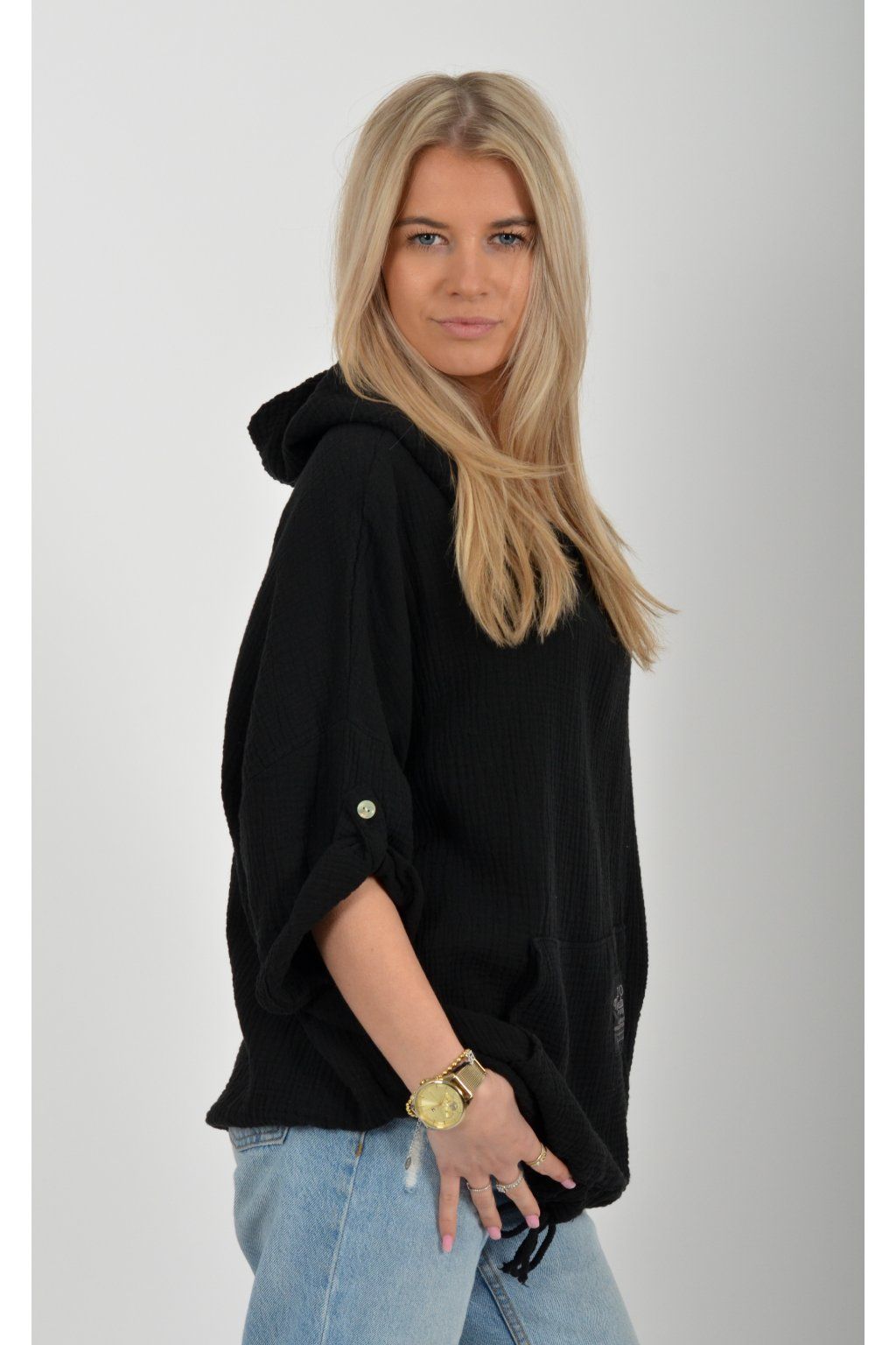 Mikina vyrobená z velice příjemného mušelínu. Mikina má kapuci a klokaní kapsu. Rukáv je 3/4 a lze pomocí knoflíku jednoduše zkrátit. Ve spodní části mikiny je zapracovaná tkanice pro libovolné stažení.