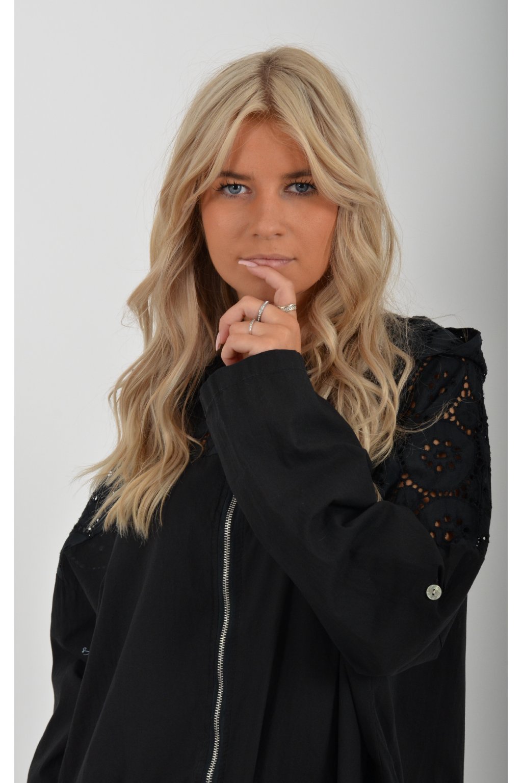 Lehká bavlněná bunda zdobená krajkou s kapucí a dlouhým rukávem, který lze pomocí knoflíku libovolně zkrátit. Je vyrobena z příjemné bavlny. V přední části má kapsy. Ve spodní části lze pomocí šňůrky stáhnout.