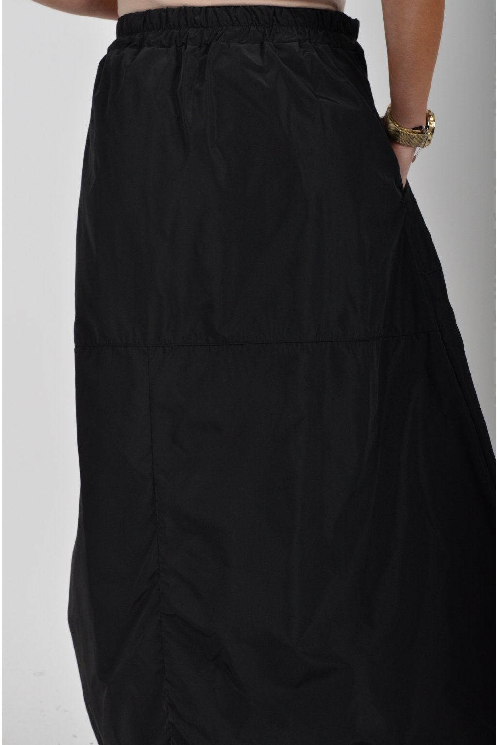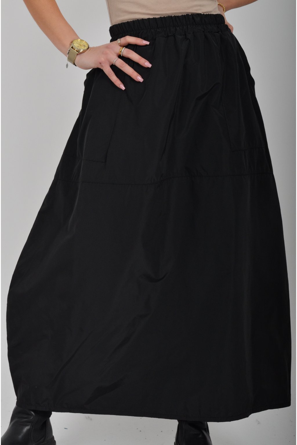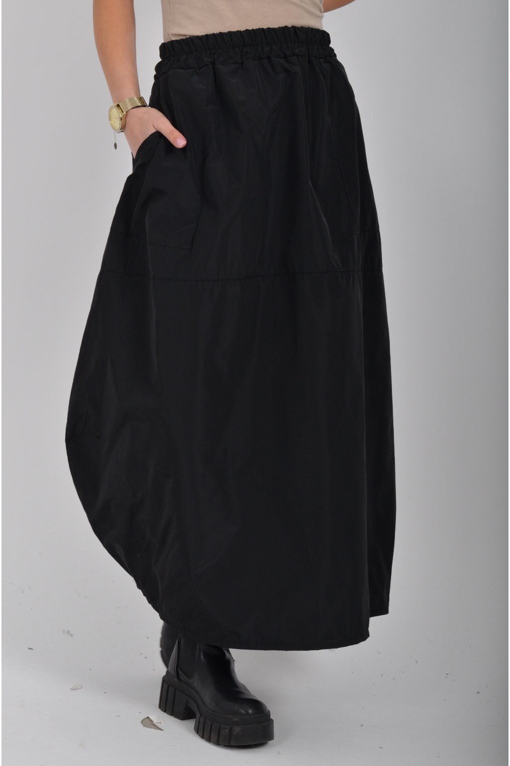 Šusťáková sukně balónového střihu s kapsami na bocích. V pase má sukně zapracovanou gumu.