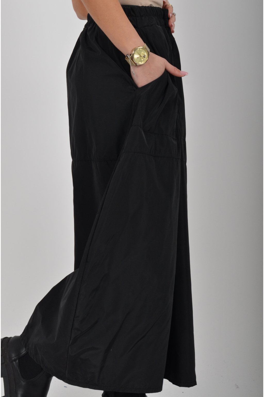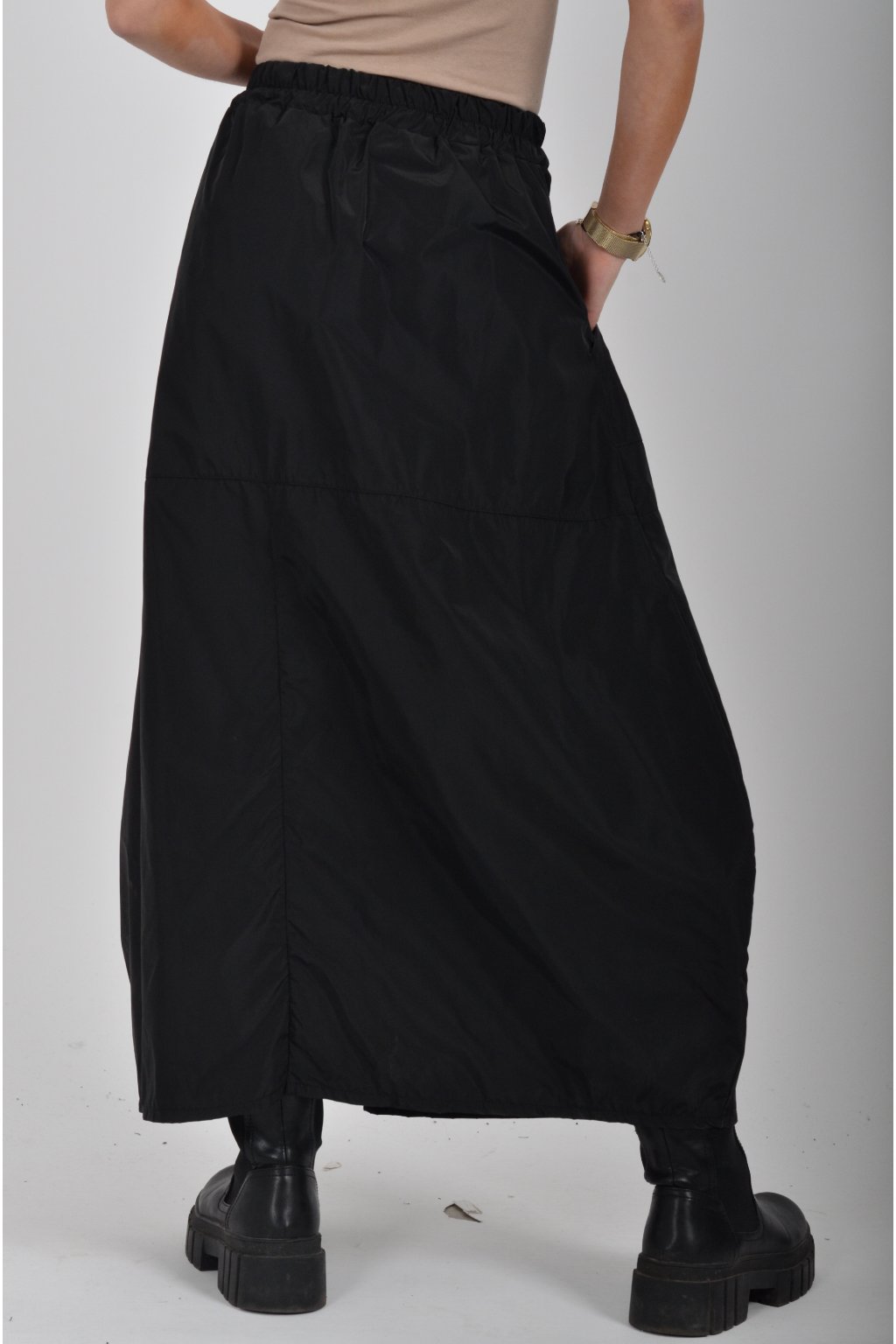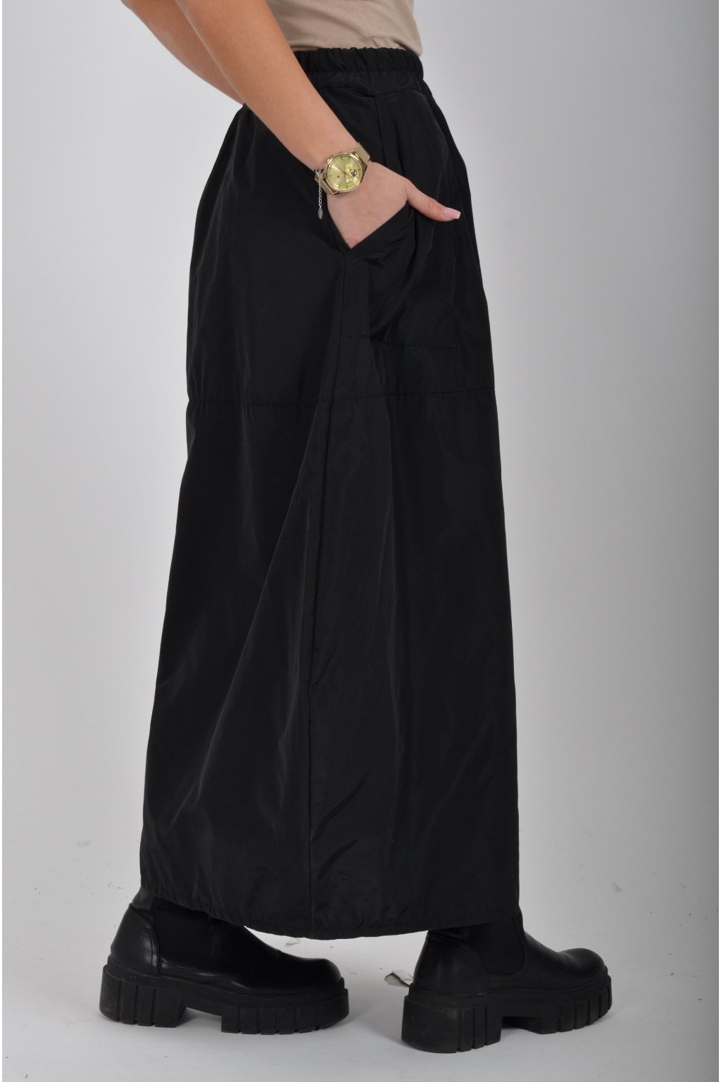 Šusťáková sukně balónového střihu s kapsami na bocích. V pase má sukně zapracovanou gumu.