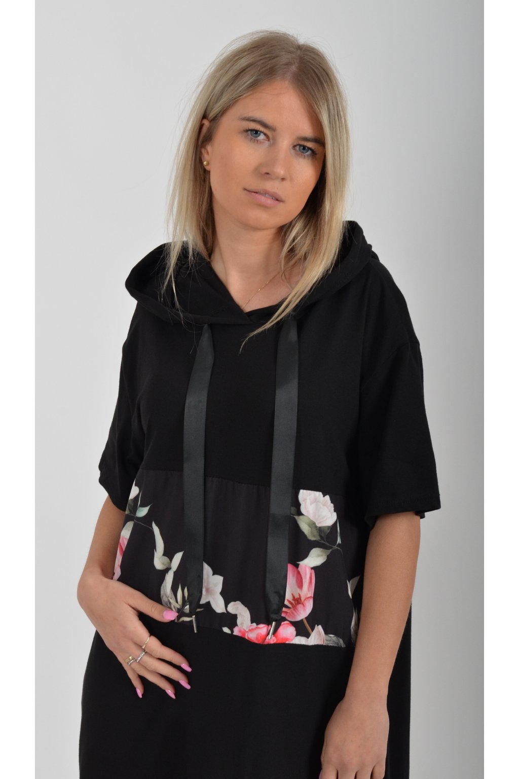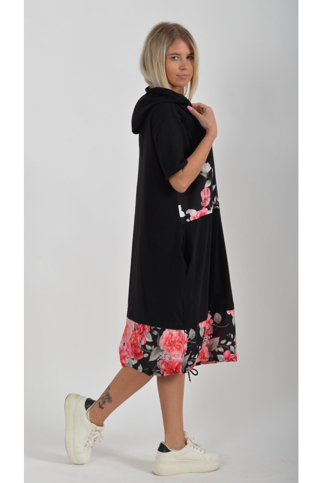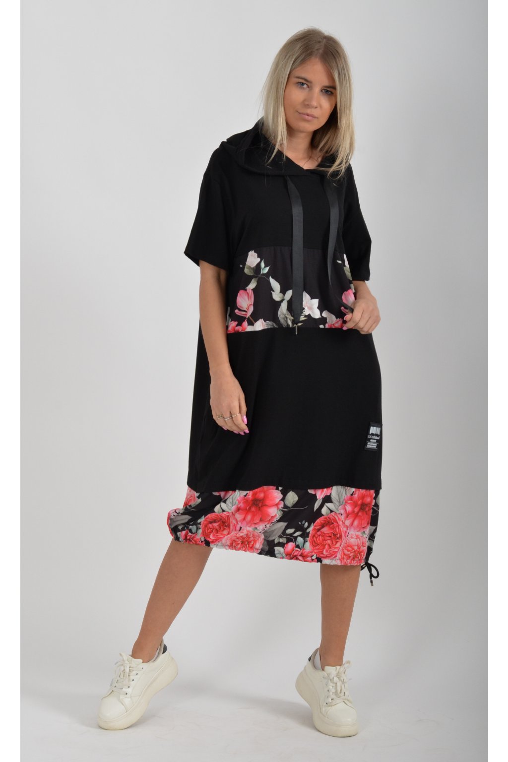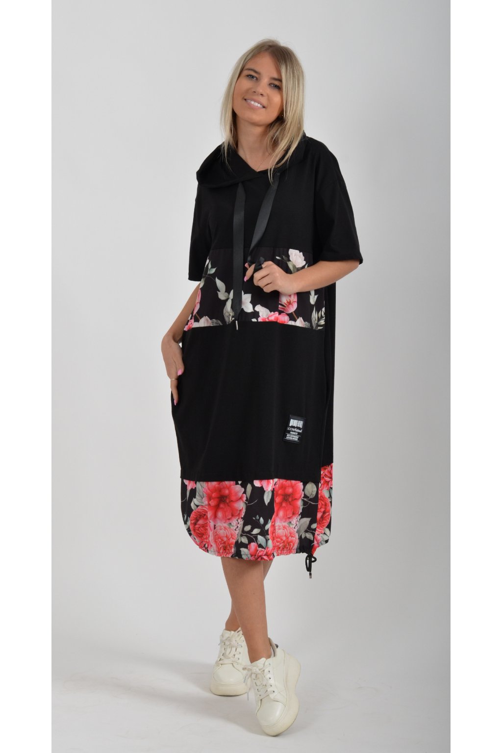 Nádherné bavlněné šaty s barevným vzorem. Mají lehce balónový střih, kapuci, krátký rukáv a na bocích kapsy. Jsou vyrobené z velice příjemné a tenké bavlny. Ve spodní části je lze pomocí zapracované tkanice stáhnout.