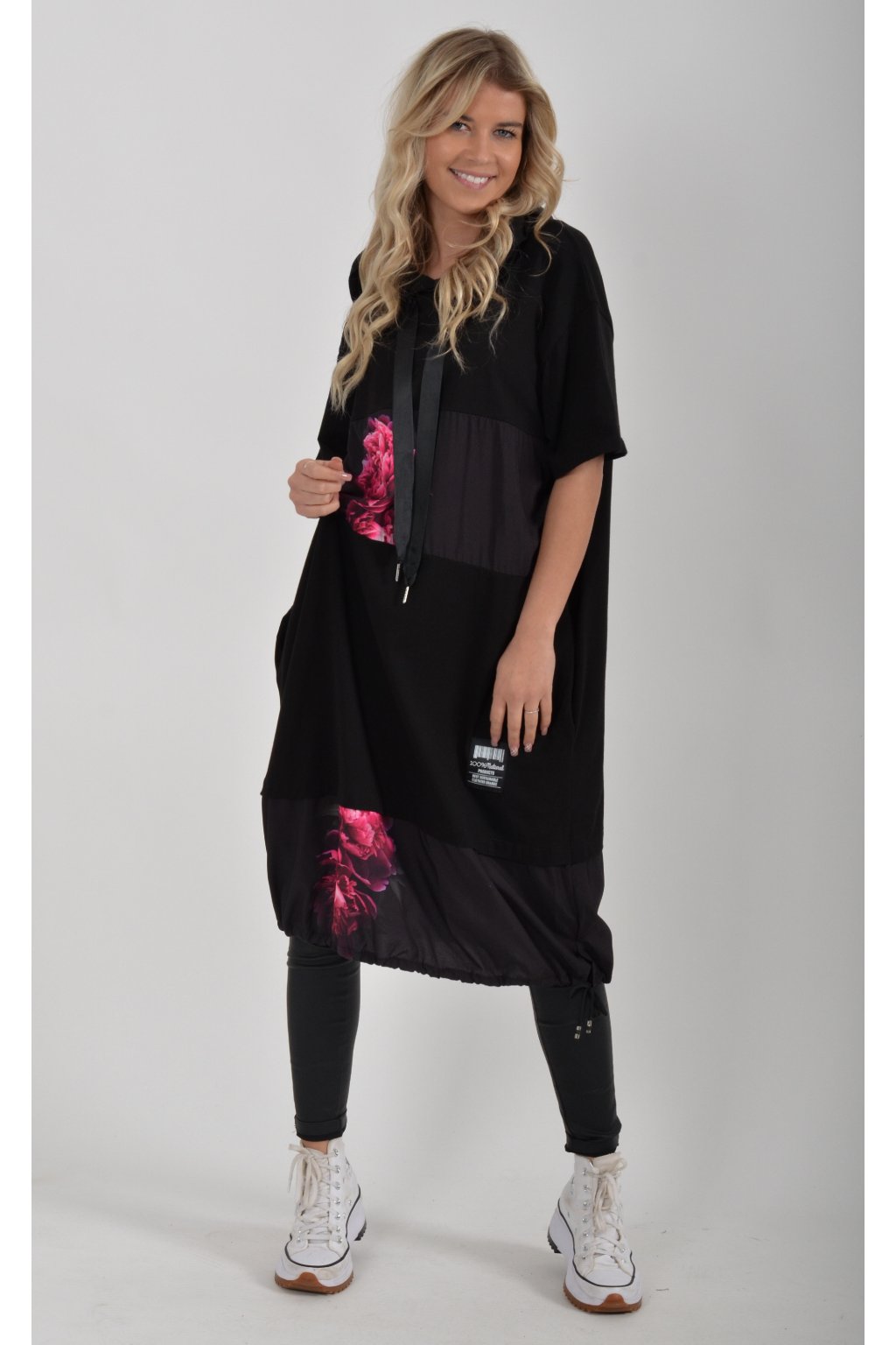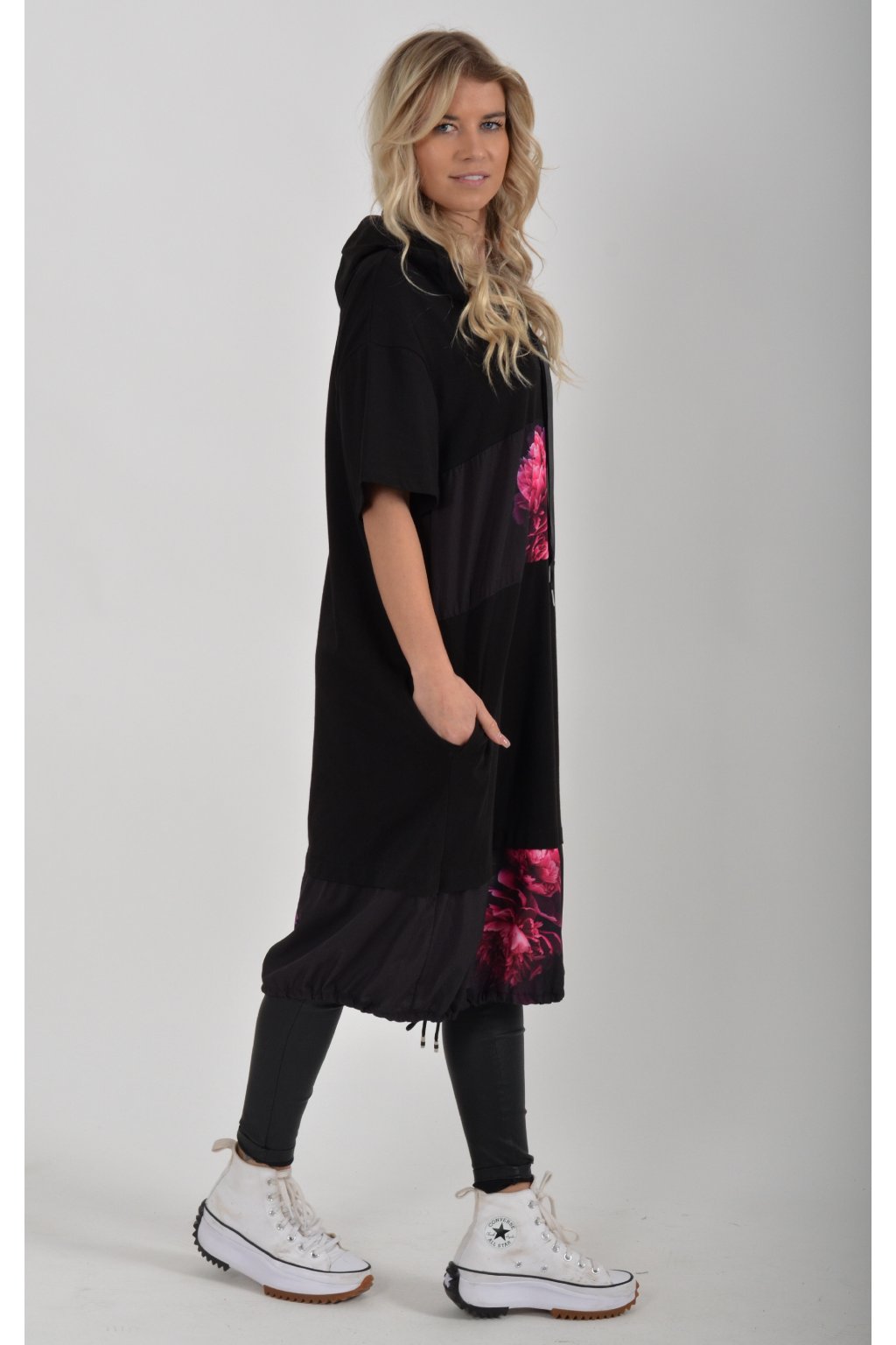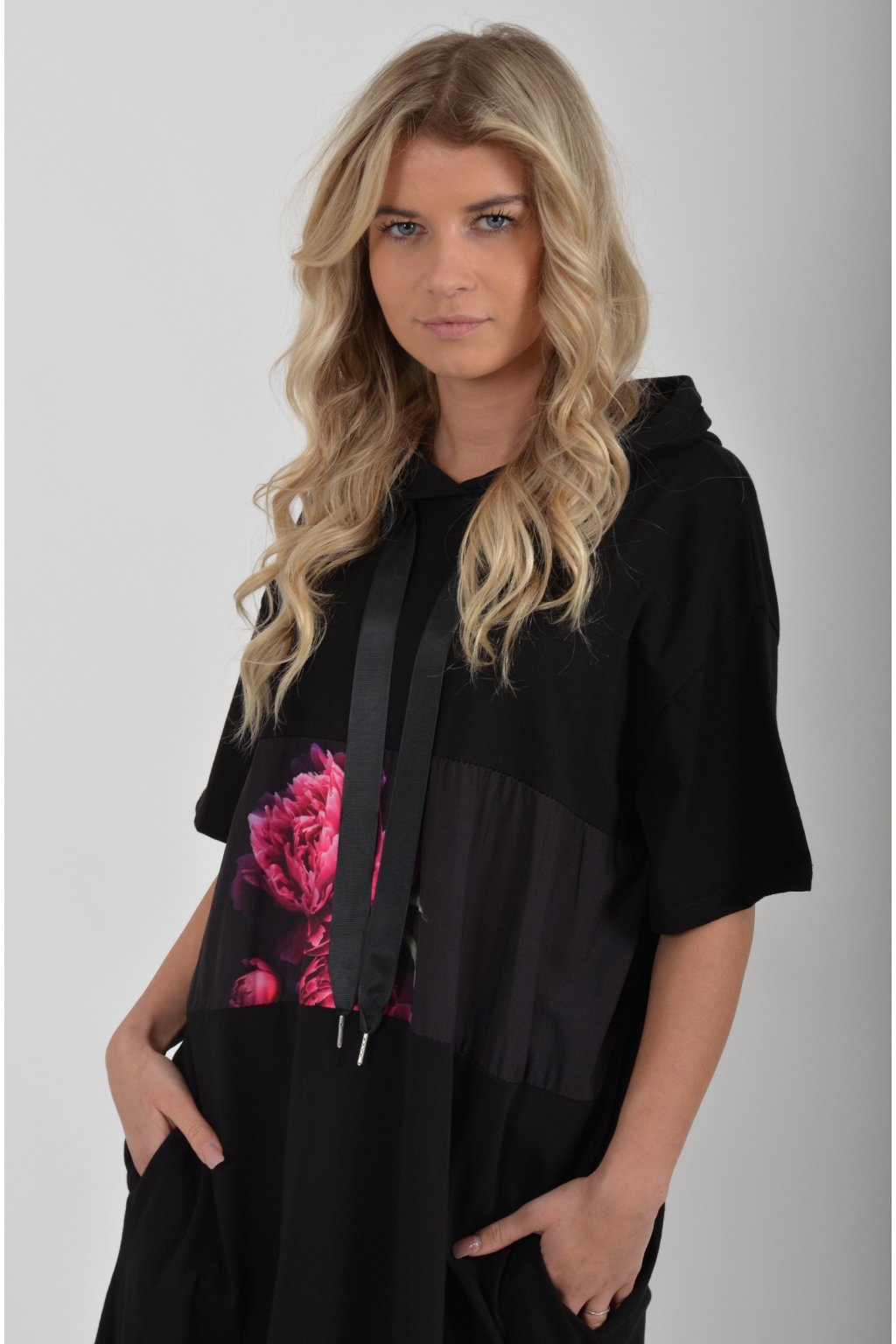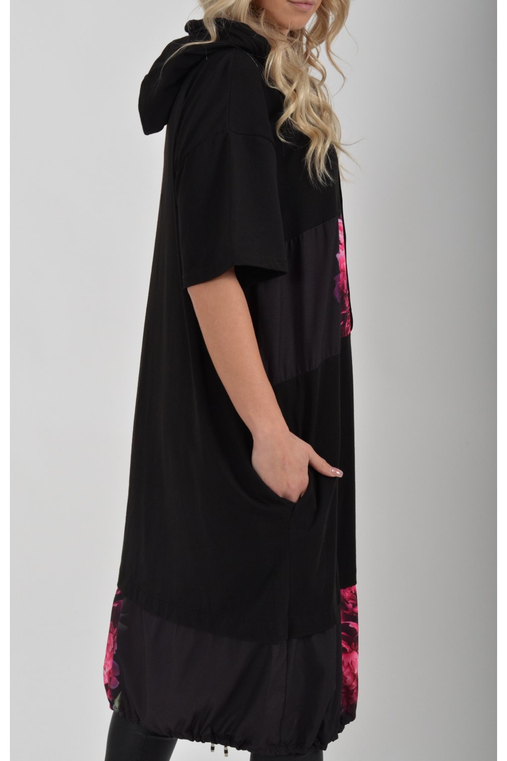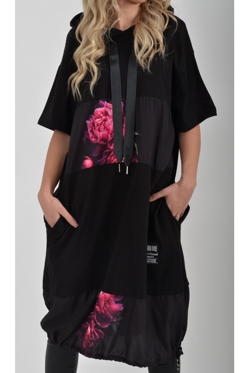 Nádherné bavlněné šaty s barevným vzorem. Mají lehce balónový střih, kapuci, krátký rukáv a na bocích kapsy. Jsou vyrobené z velice příjemné a tenké bavlny. Ve spodní části je lze pomocí zapracované tkanice stáhnout.