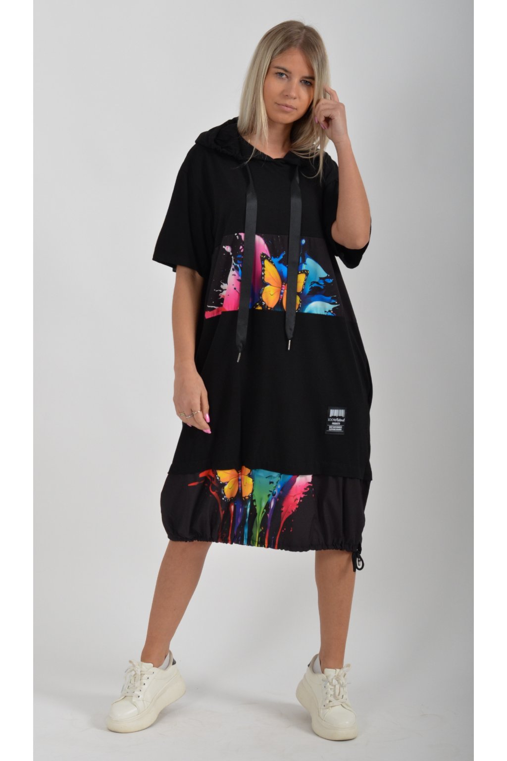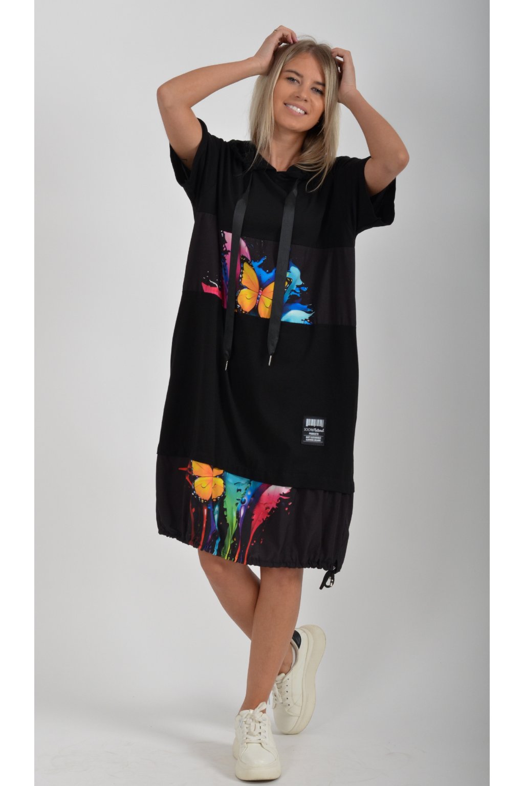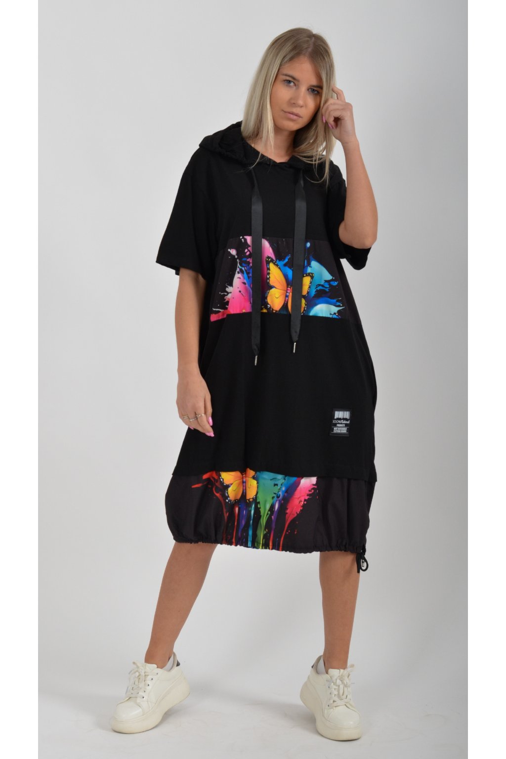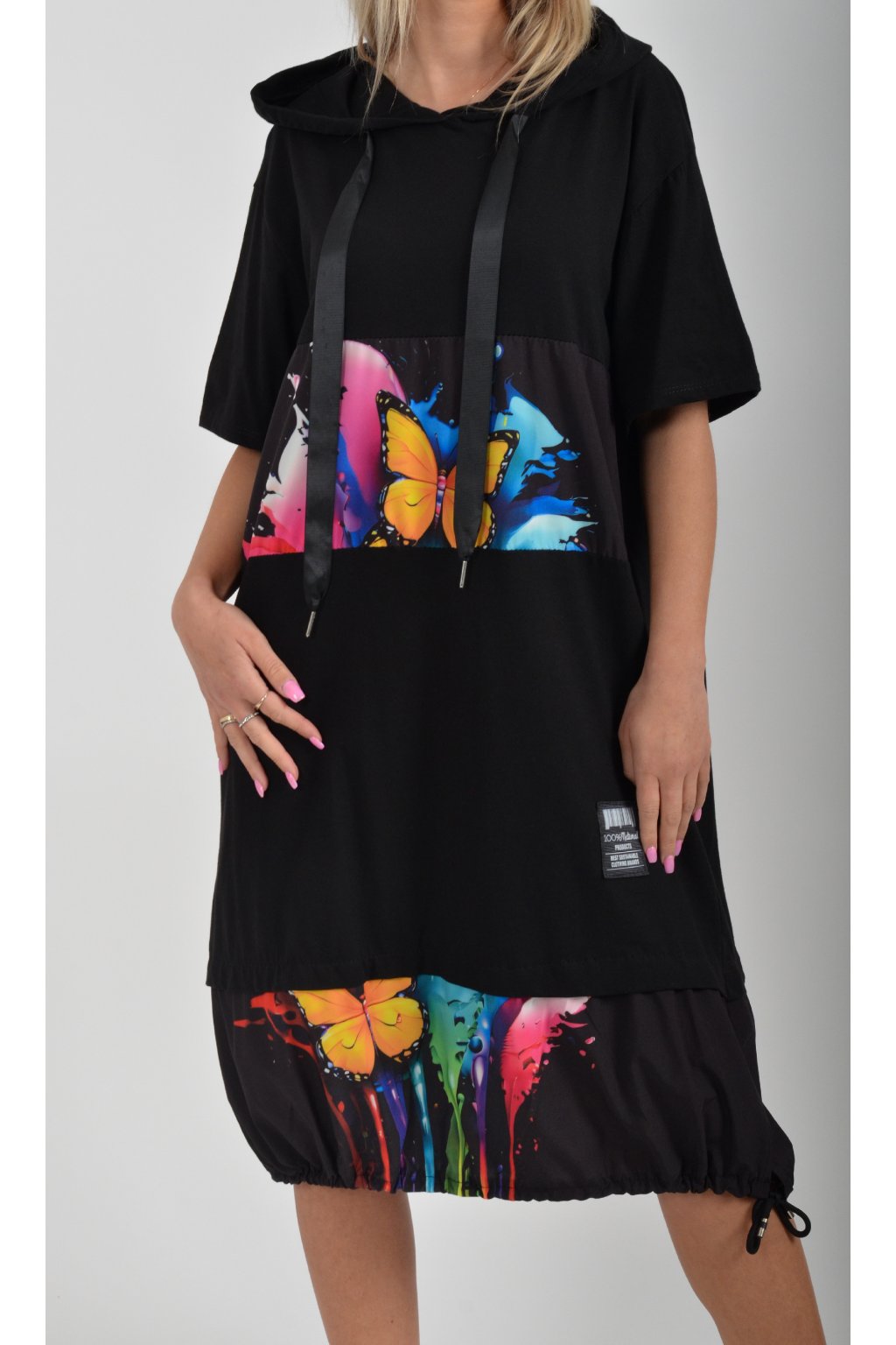Nádherné bavlněné šaty s barevným vzorem. Mají lehce balónový střih, kapuci, krátký rukáv a na bocích kapsy. Jsou vyrobené z velice příjemné a tenké bavlny. Ve spodní části je lze pomocí zapracované tkanice stáhnout.
