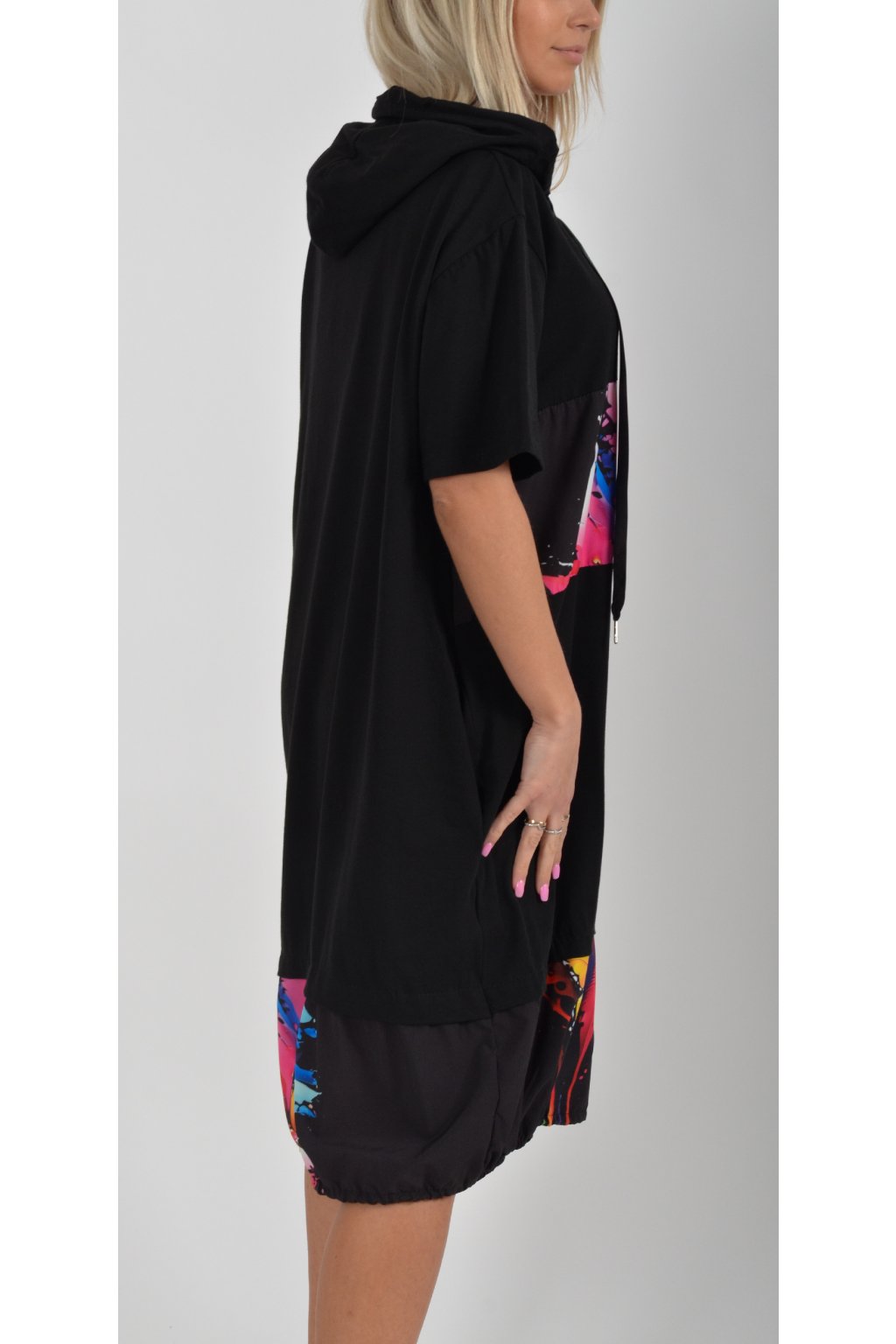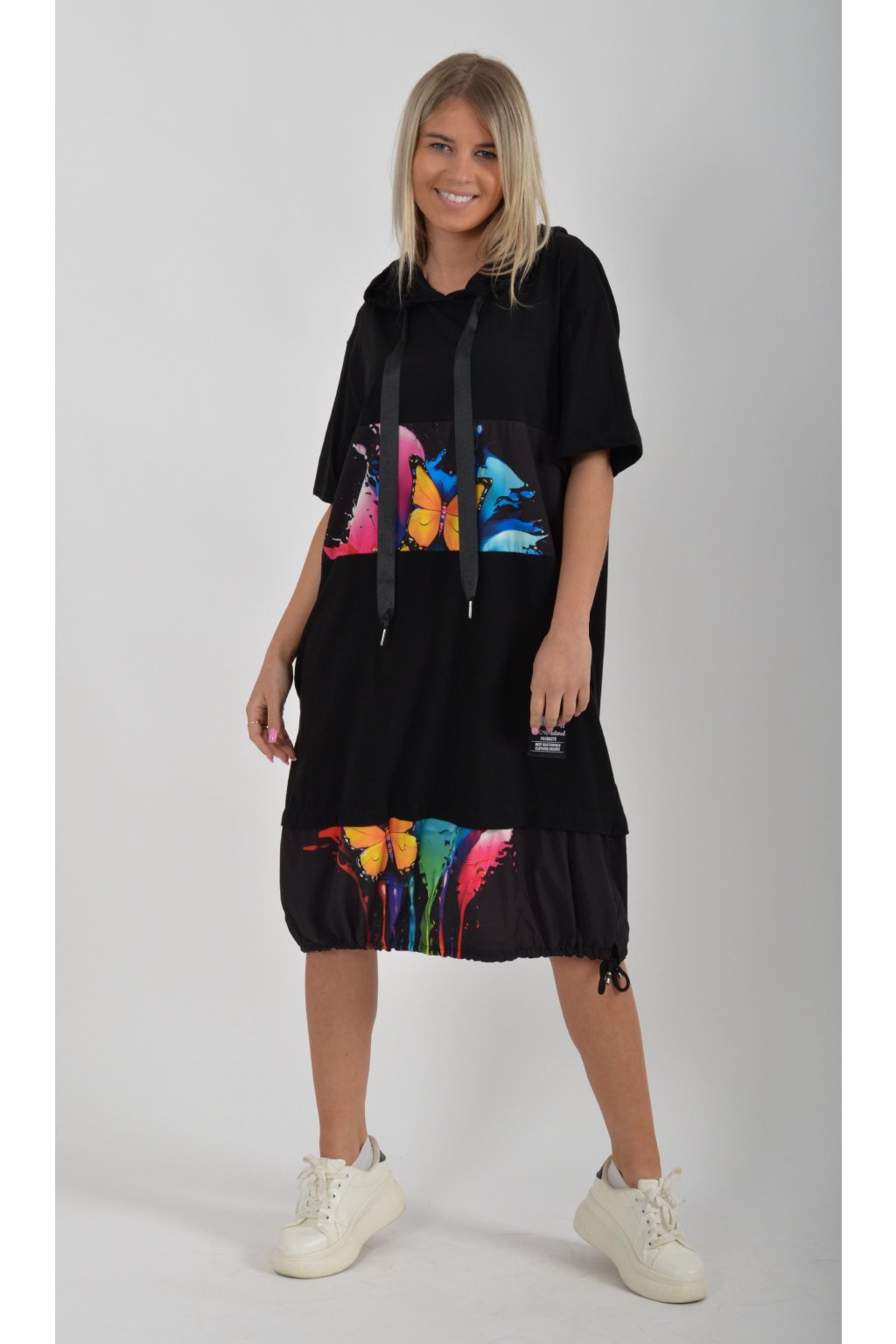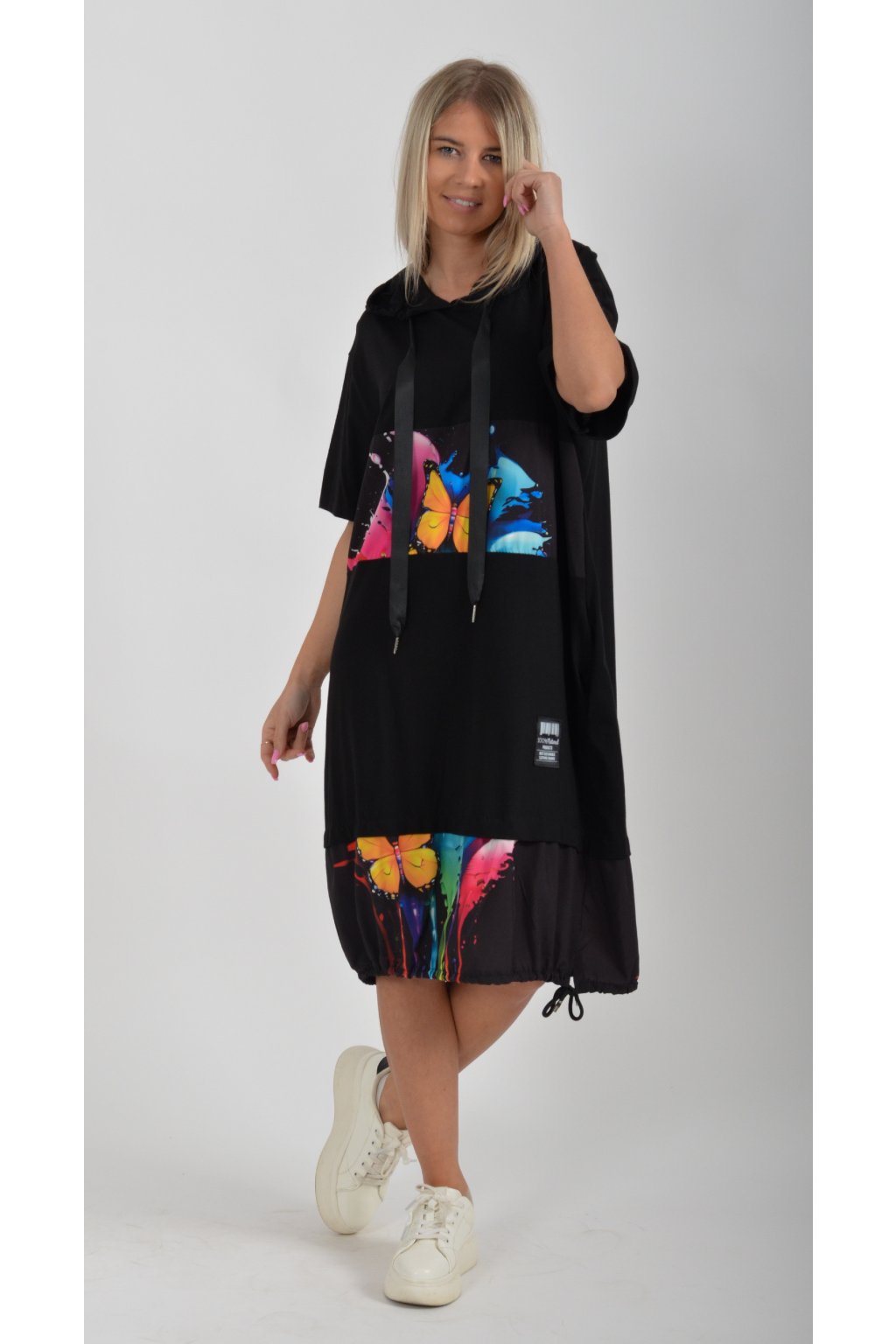 Nádherné bavlněné šaty s barevným vzorem. Mají lehce balónový střih, kapuci, krátký rukáv a na bocích kapsy. Jsou vyrobené z velice příjemné a tenké bavlny. Ve spodní části je lze pomocí zapracované tkanice stáhnout.