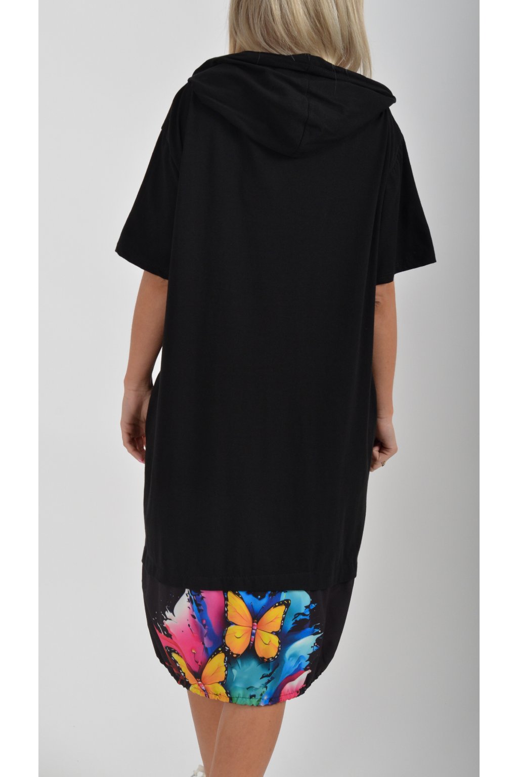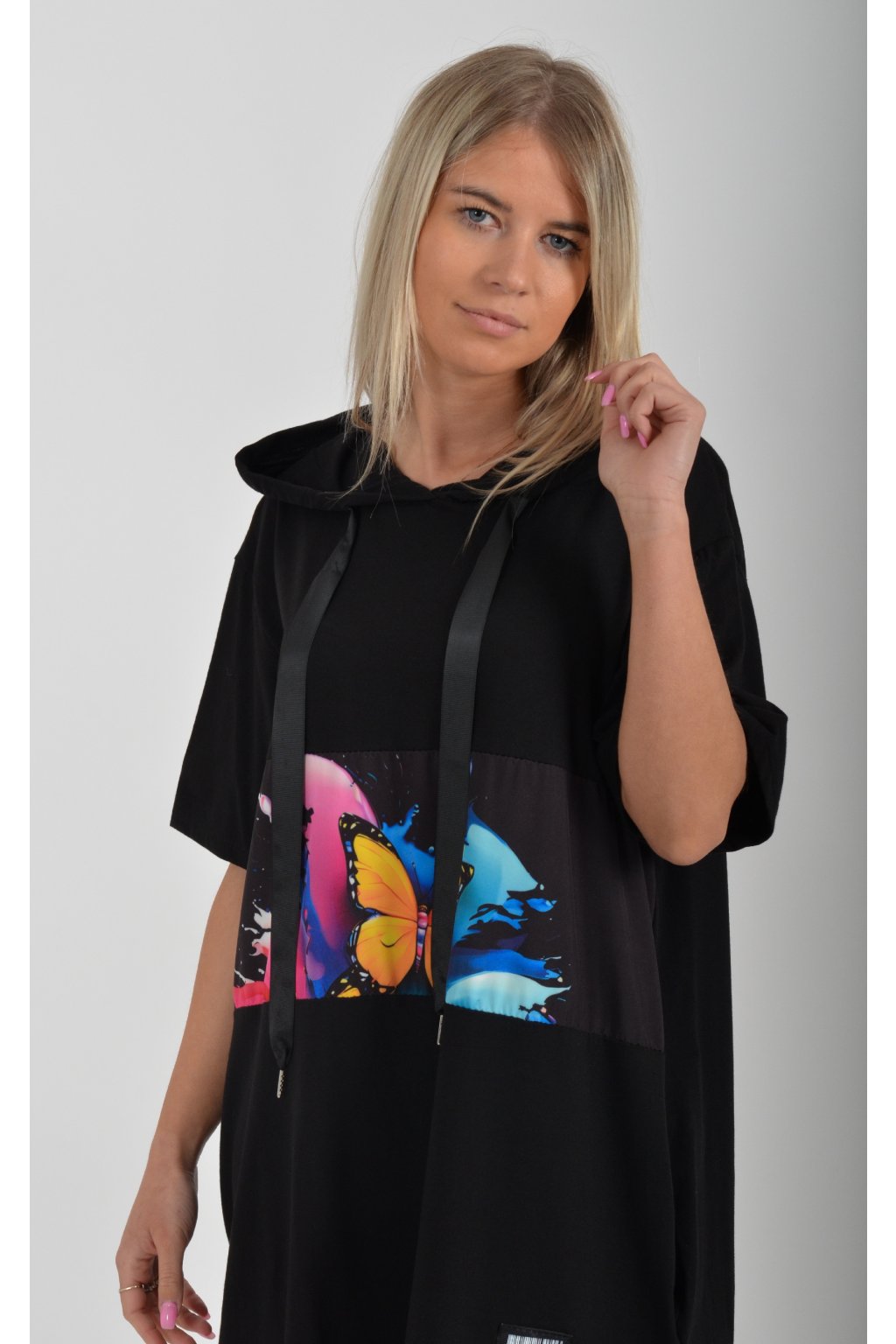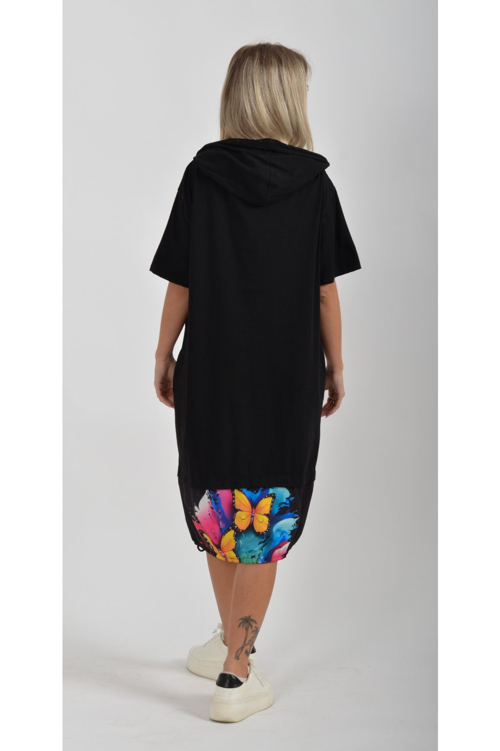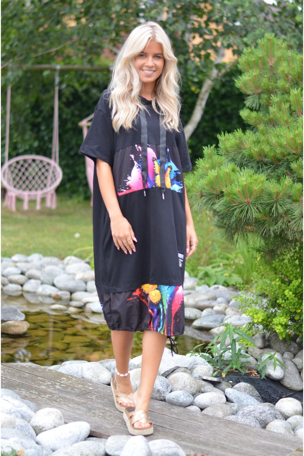 Nádherné bavlněné šaty s barevným vzorem. Mají lehce balónový střih, kapuci, krátký rukáv a na bocích kapsy. Jsou vyrobené z velice příjemné a tenké bavlny. Ve spodní části je lze pomocí zapracované tkanice stáhnout.