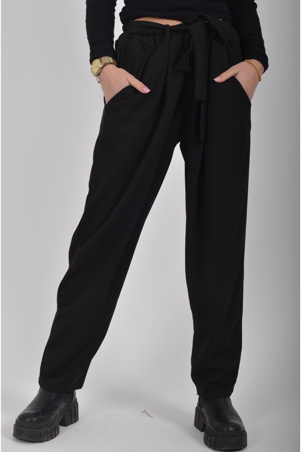Jednobarevné kalhoty s kapsami na bocích, které se krásně přizpůsobí postavě, díky podílu elastanu. Jsou vhodné pro každodenní nošení. V pase je zapracovaná guma a pásek pro libovolné stažení.
