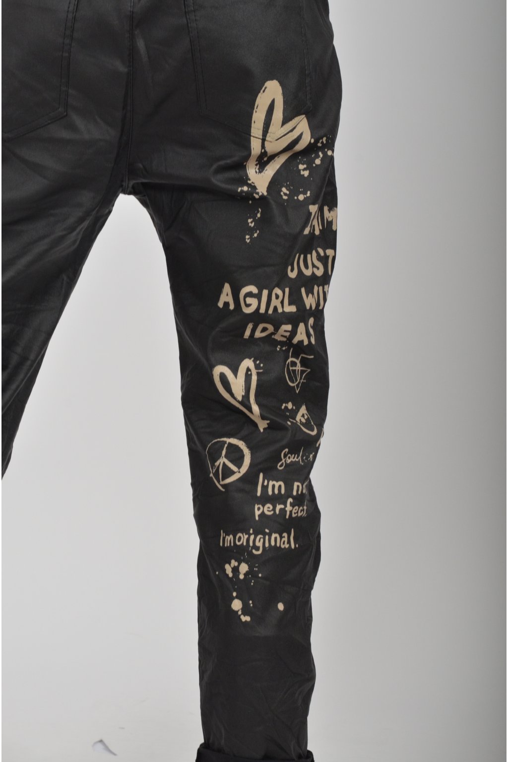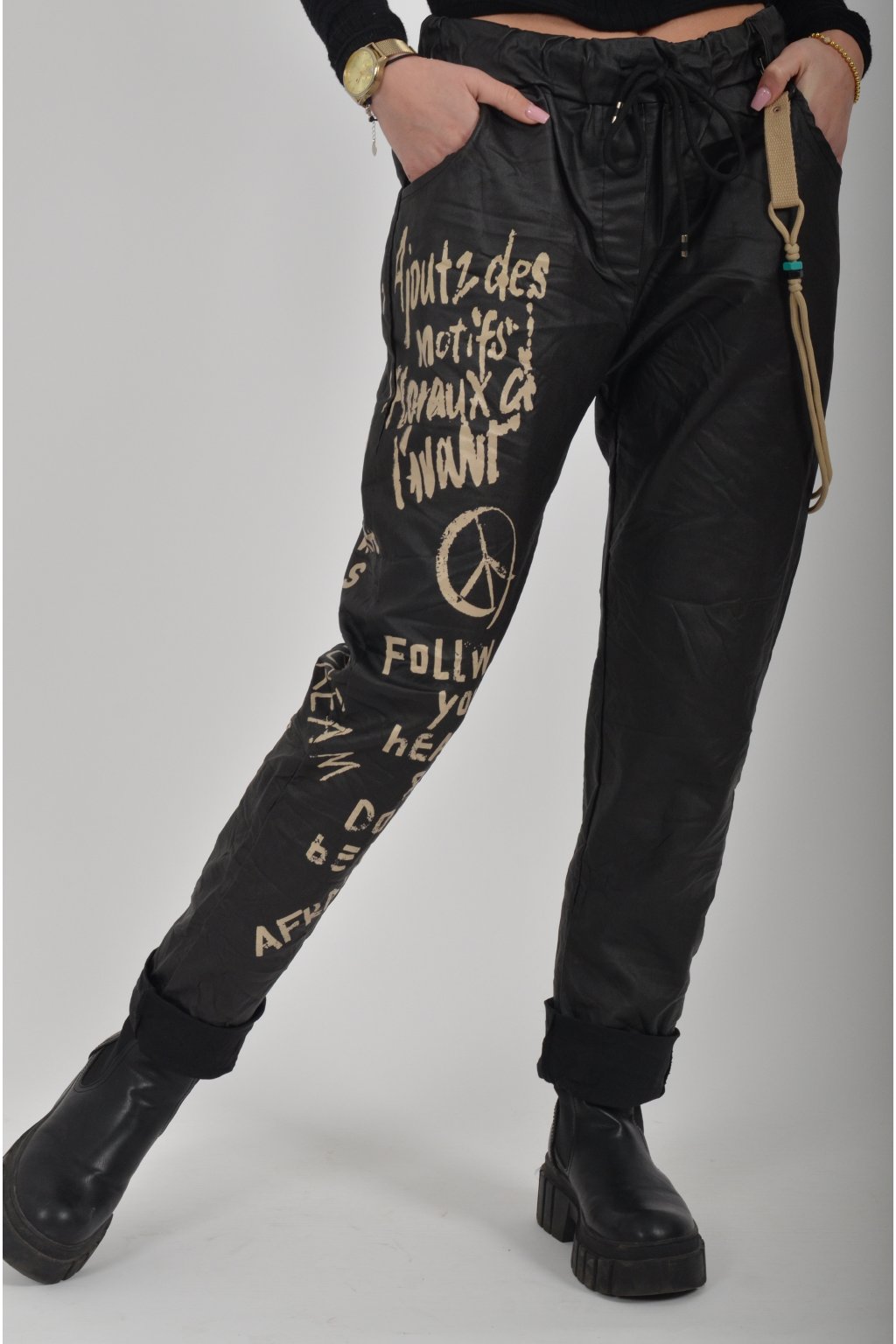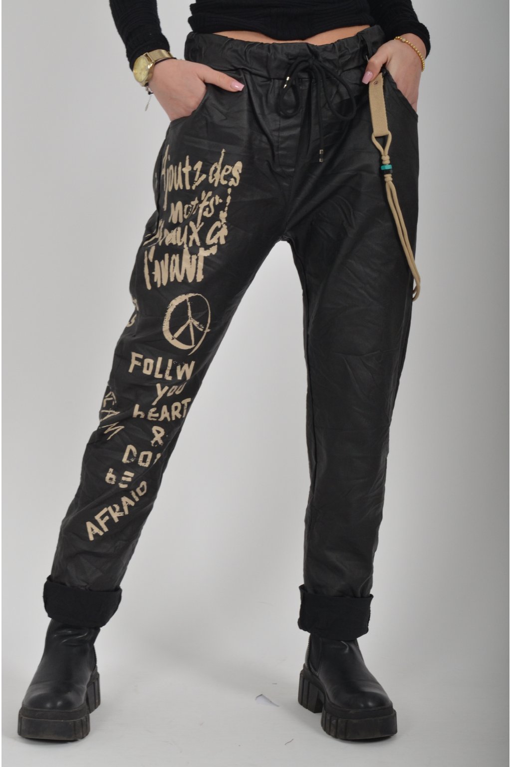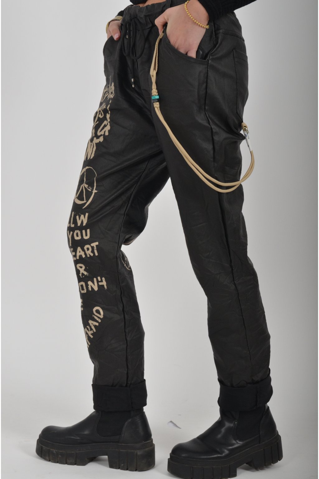 Jednobarevné koženkové kalhoty s kapsami na bocích, které se krásně přizpůsobí postavě, díky podílu elastanu. Jsou vhodné pro každodenní nošení. V pase je zapracovaná guma a tkanička pro libovolné stažení.