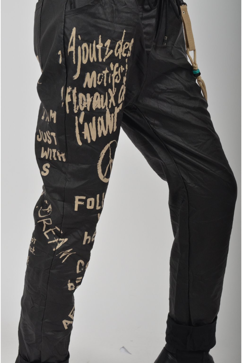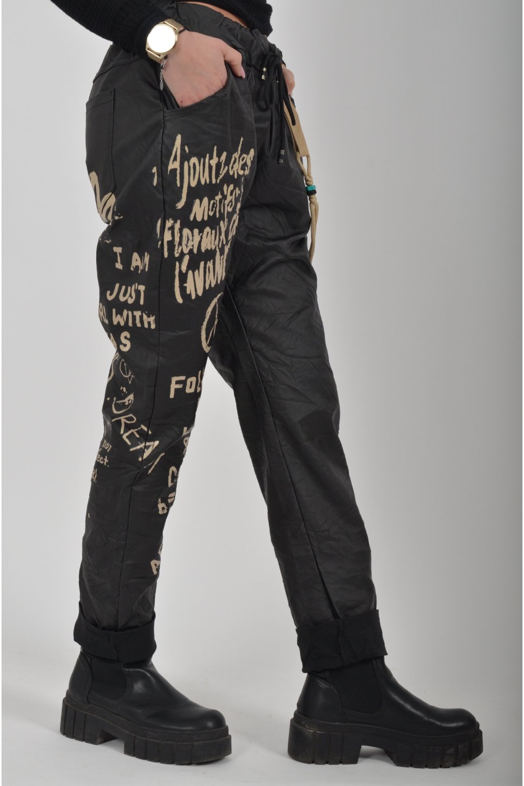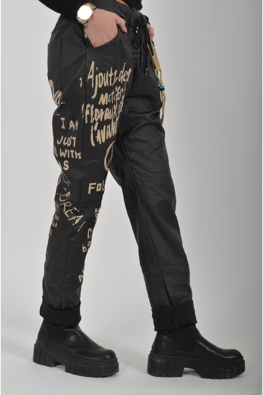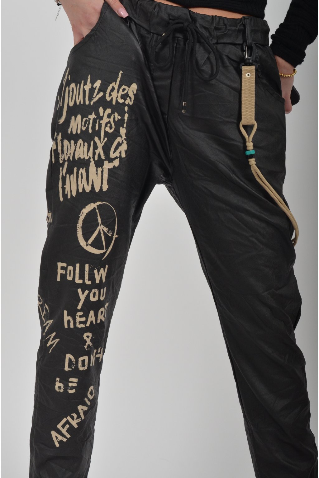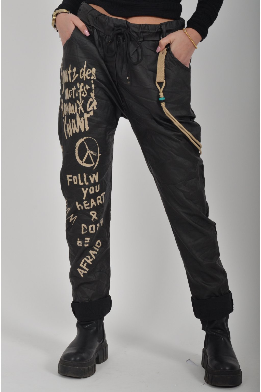 Jednobarevné koženkové kalhoty s kapsami na bocích, které se krásně přizpůsobí postavě, díky podílu elastanu. Jsou vhodné pro každodenní nošení. V pase je zapracovaná guma a tkanička pro libovolné stažení.
