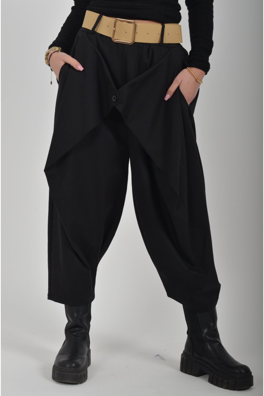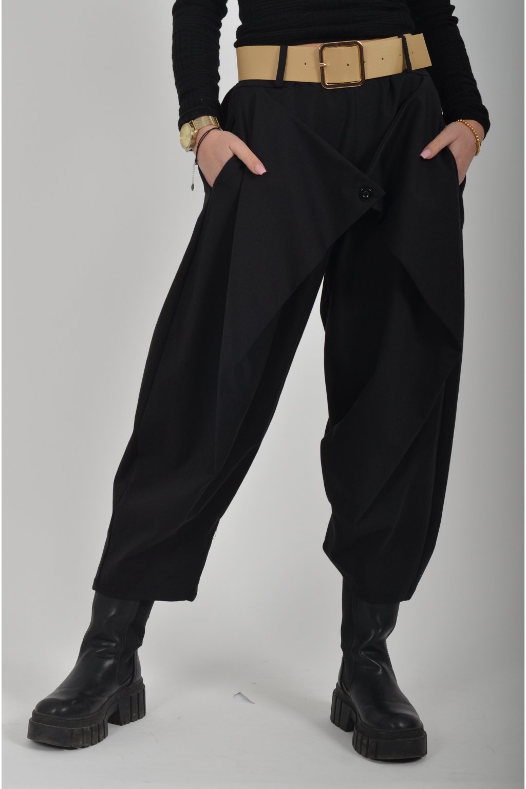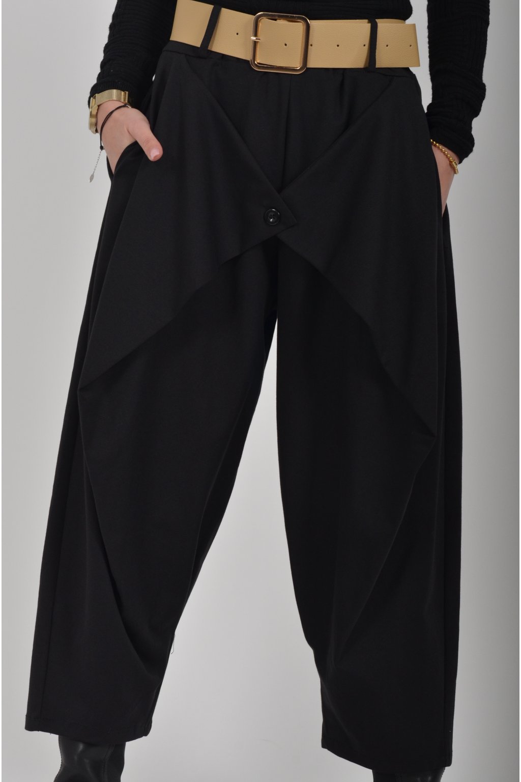 Jednobarevné kalhoty s překříženým pasem a kapsami na bocích. Krásně přizpůsobí postavě, díky podílu elastanu. Jsou vhodné pro každodenní nošení. V pase je zapracovaná guma. Ke kalhotám je jako dárek koženkový pásek, který lze odejmout a nosit na jiných kalhotách.