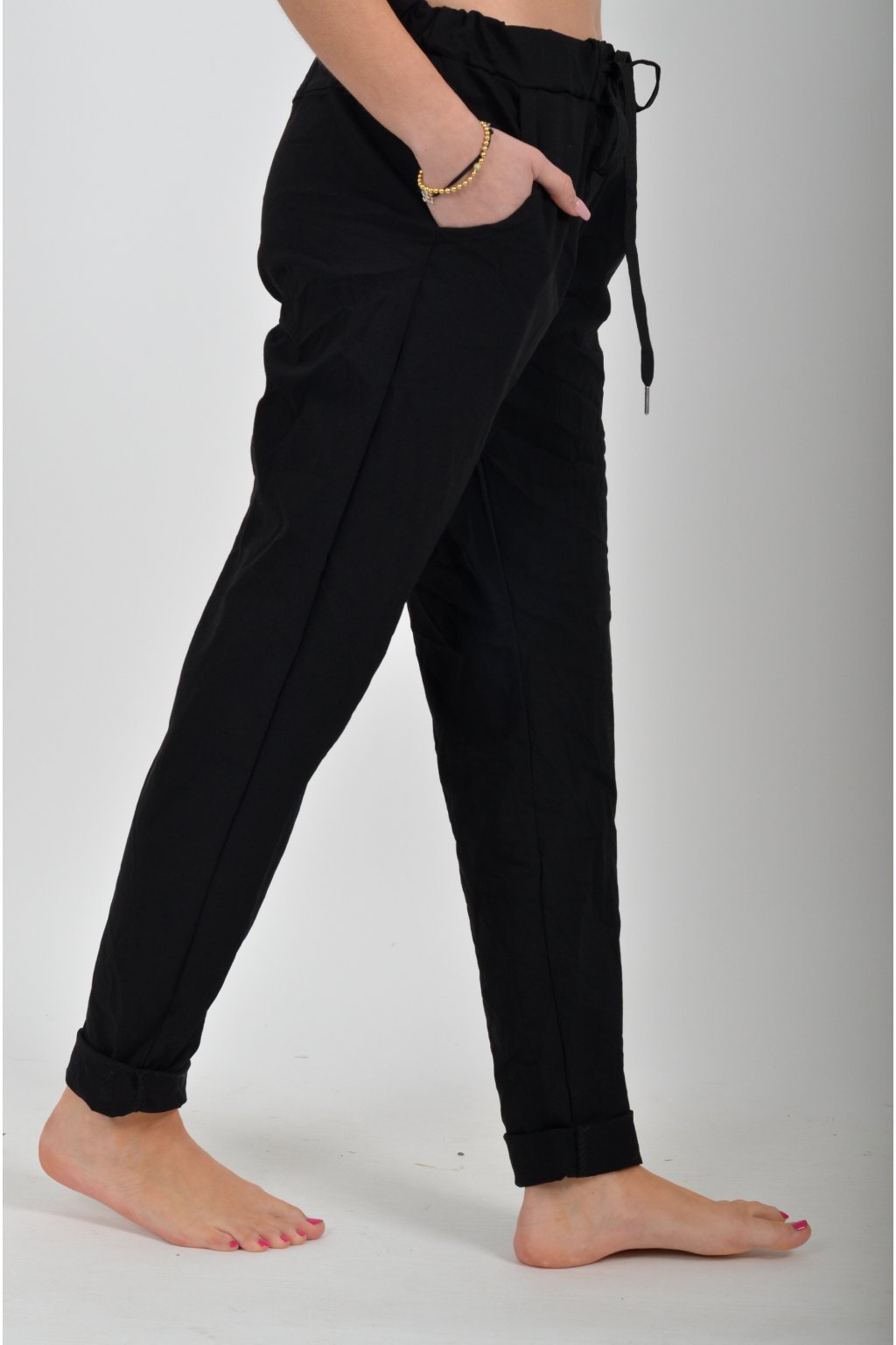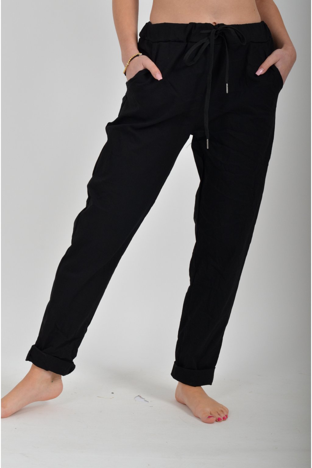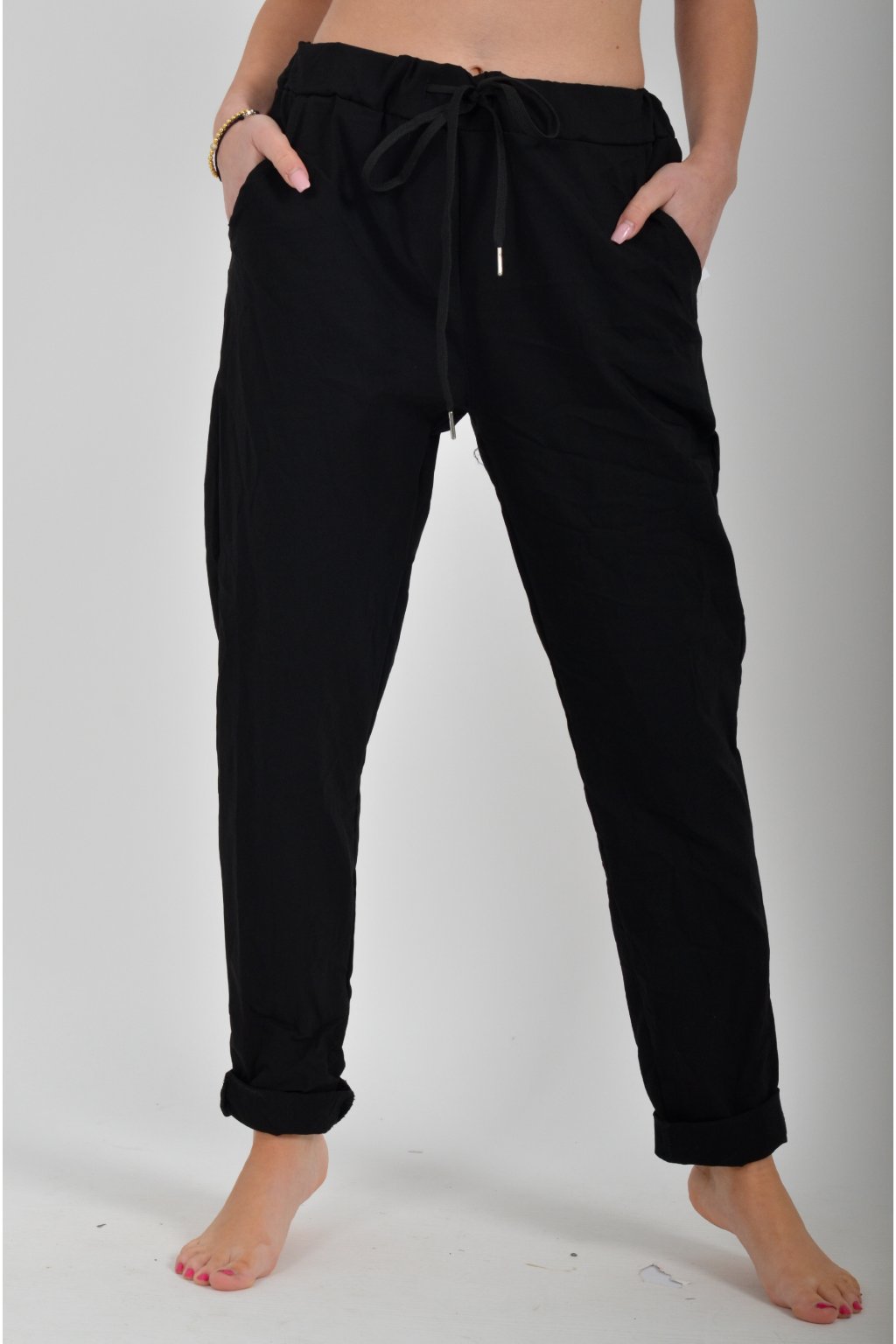 Jednobarevné kalhoty s kapsami na bocích, které se krásně přizpůsobí postavě, díky podílu elastanu. Jsou vhodné pro každodenní nošení. V pase je zapracovaná guma a tkanička pro libovolné stažení.