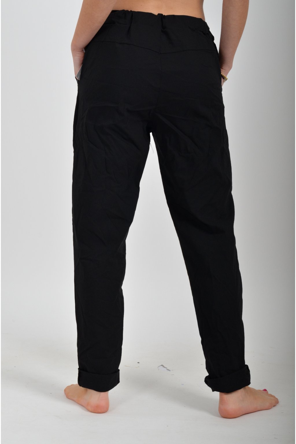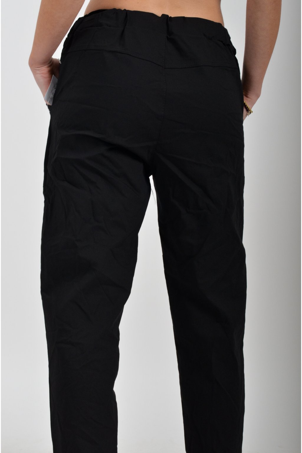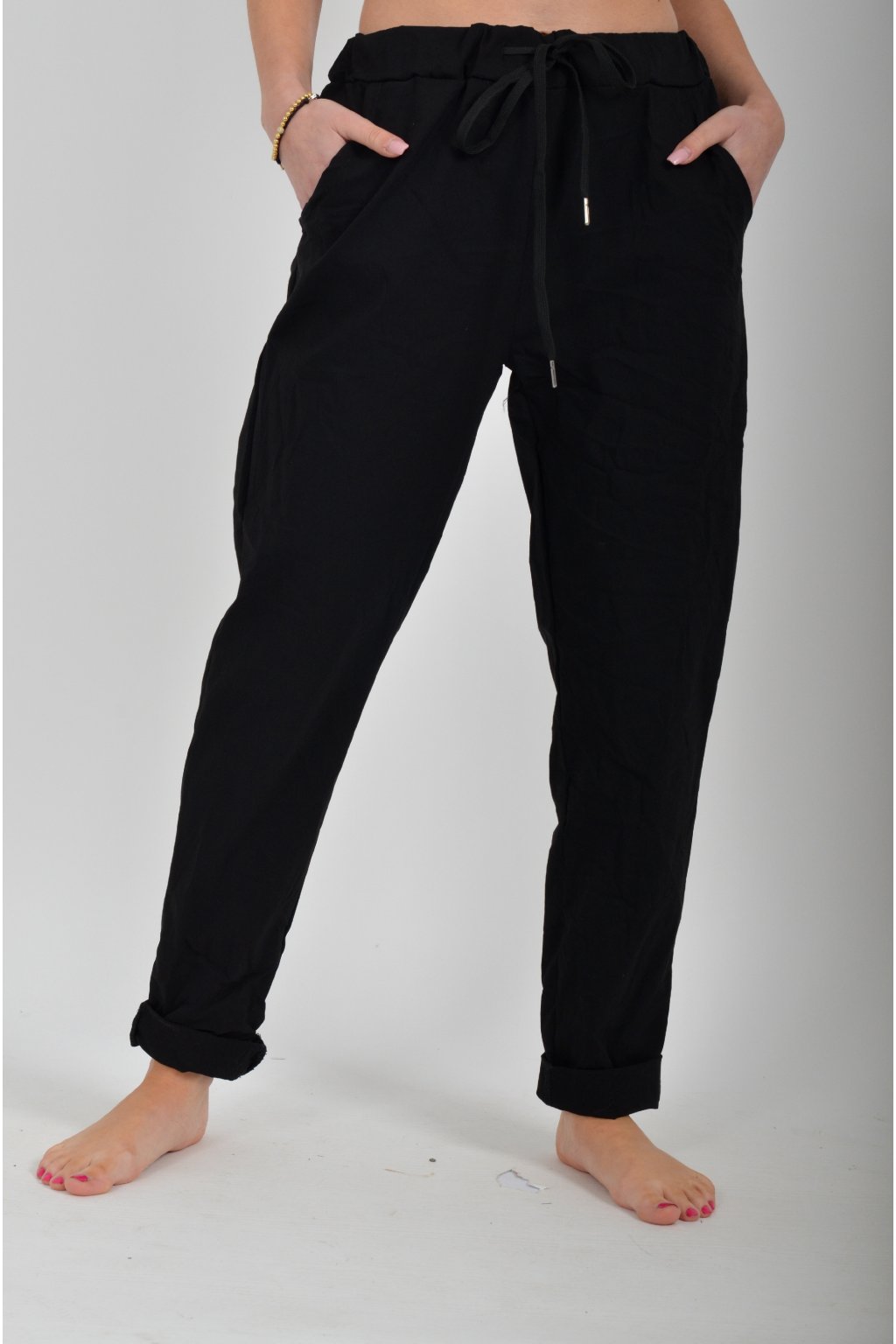 Jednobarevné kalhoty s kapsami na bocích, které se krásně přizpůsobí postavě, díky podílu elastanu. Jsou vhodné pro každodenní nošení. V pase je zapracovaná guma a tkanička pro libovolné stažení.